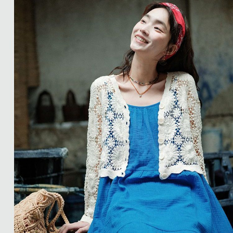 최고의 여성 봄과 여름 패션 V 넥 할로우 에어컨 선스크린 니트 셔츠 긴 소매 카디건 외부 짧은 코트스토어 가기