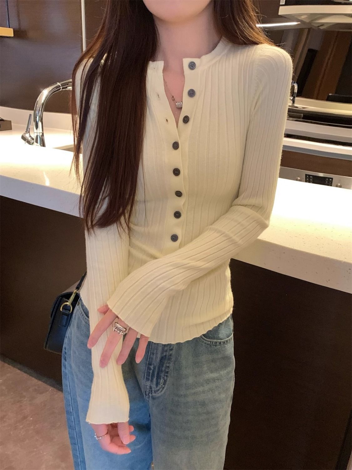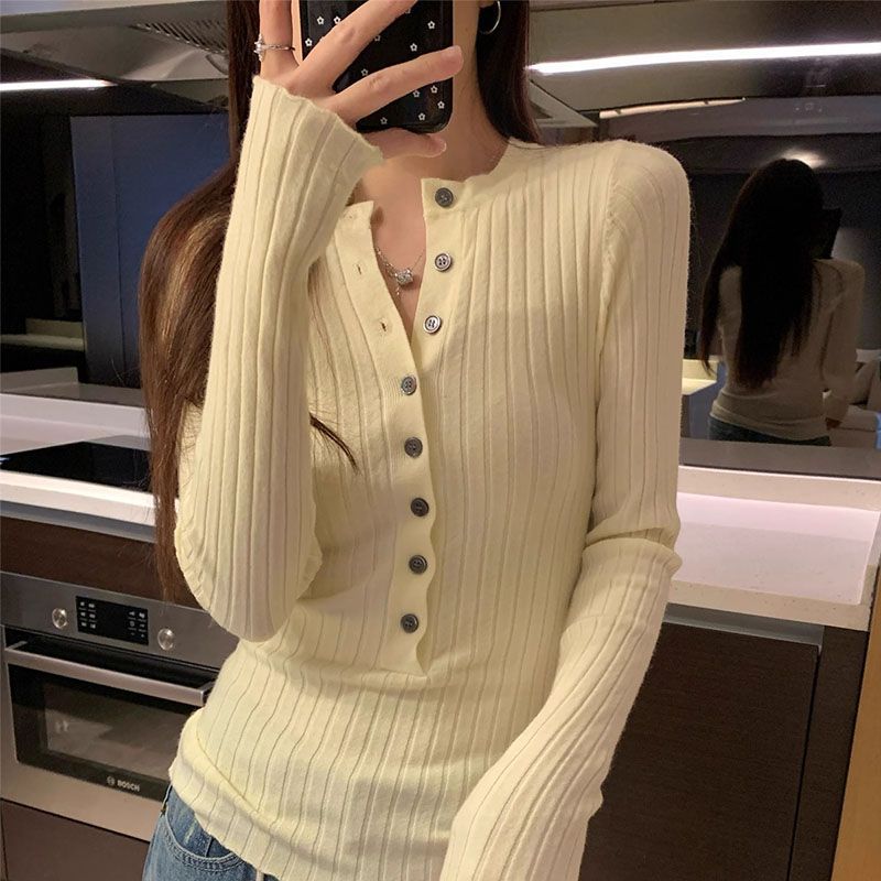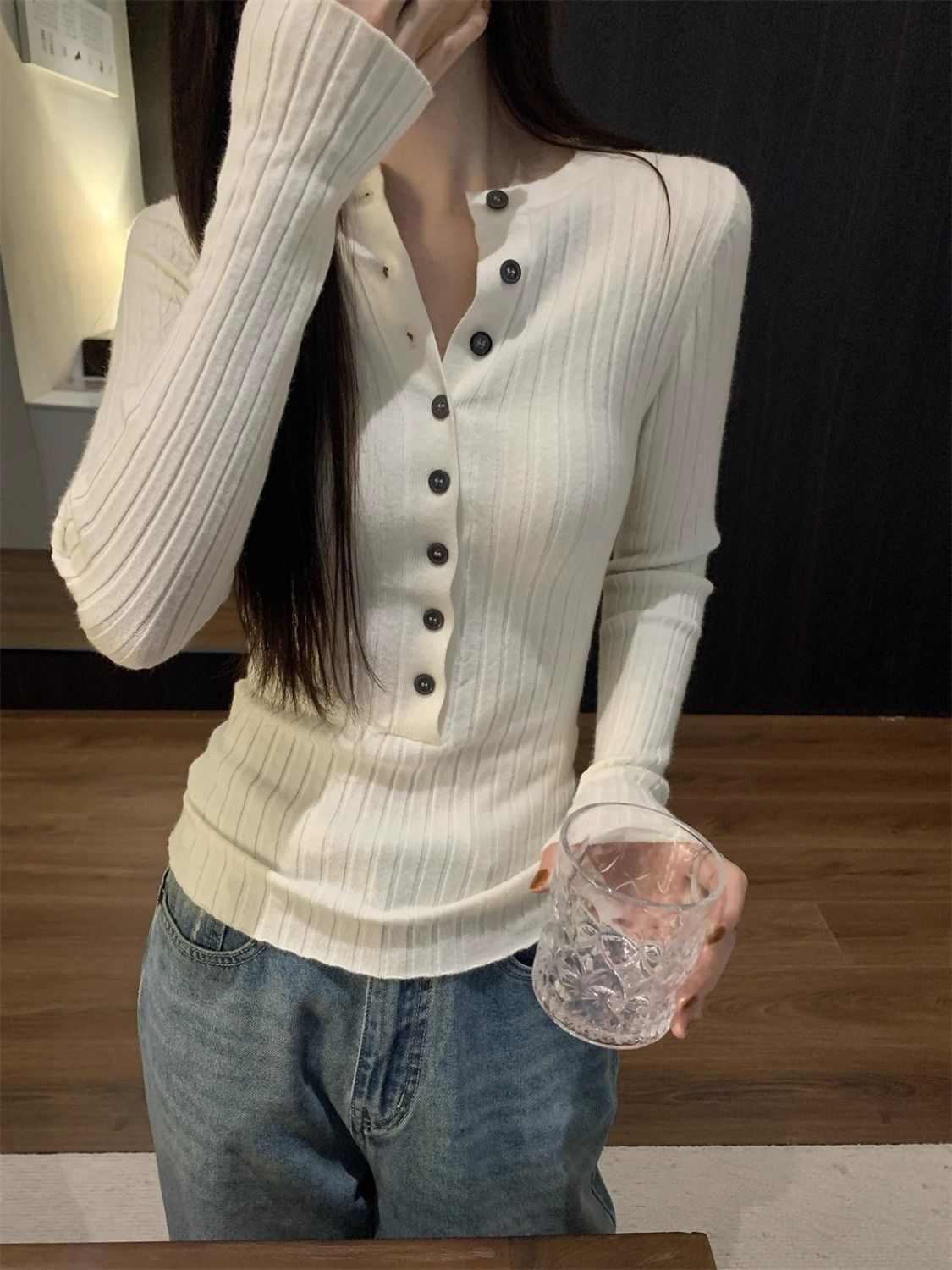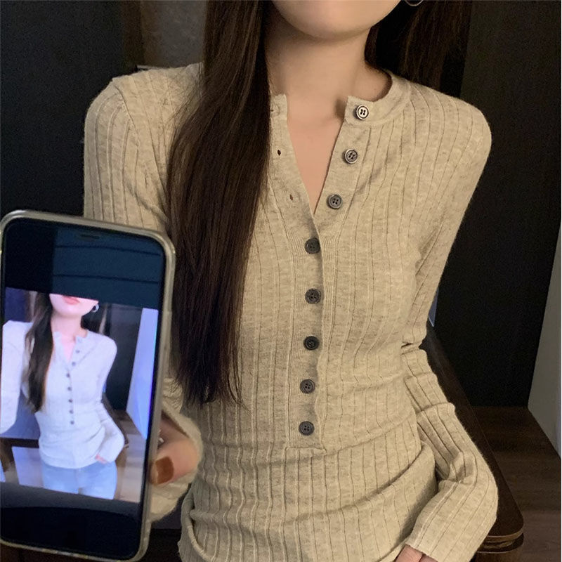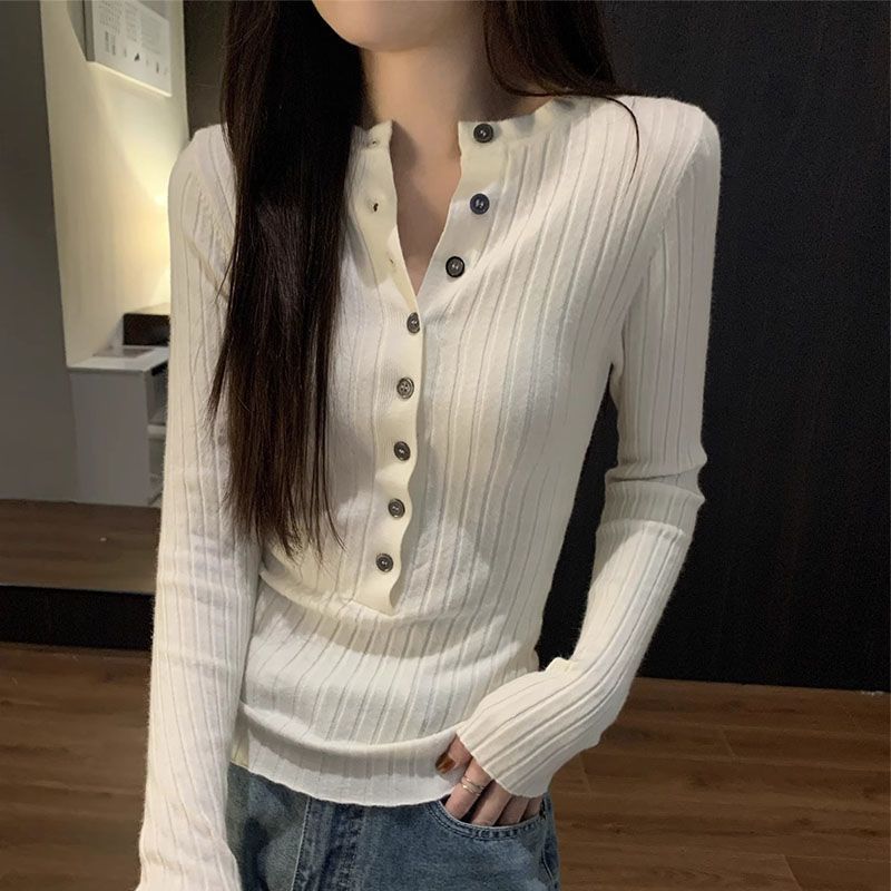 한국 스타일 슬림 핏 버튼 핏 긴팔 스웨터 여자 봄 2025 새로운 슬림베이스 올 매치 심플 탑스토어 가기