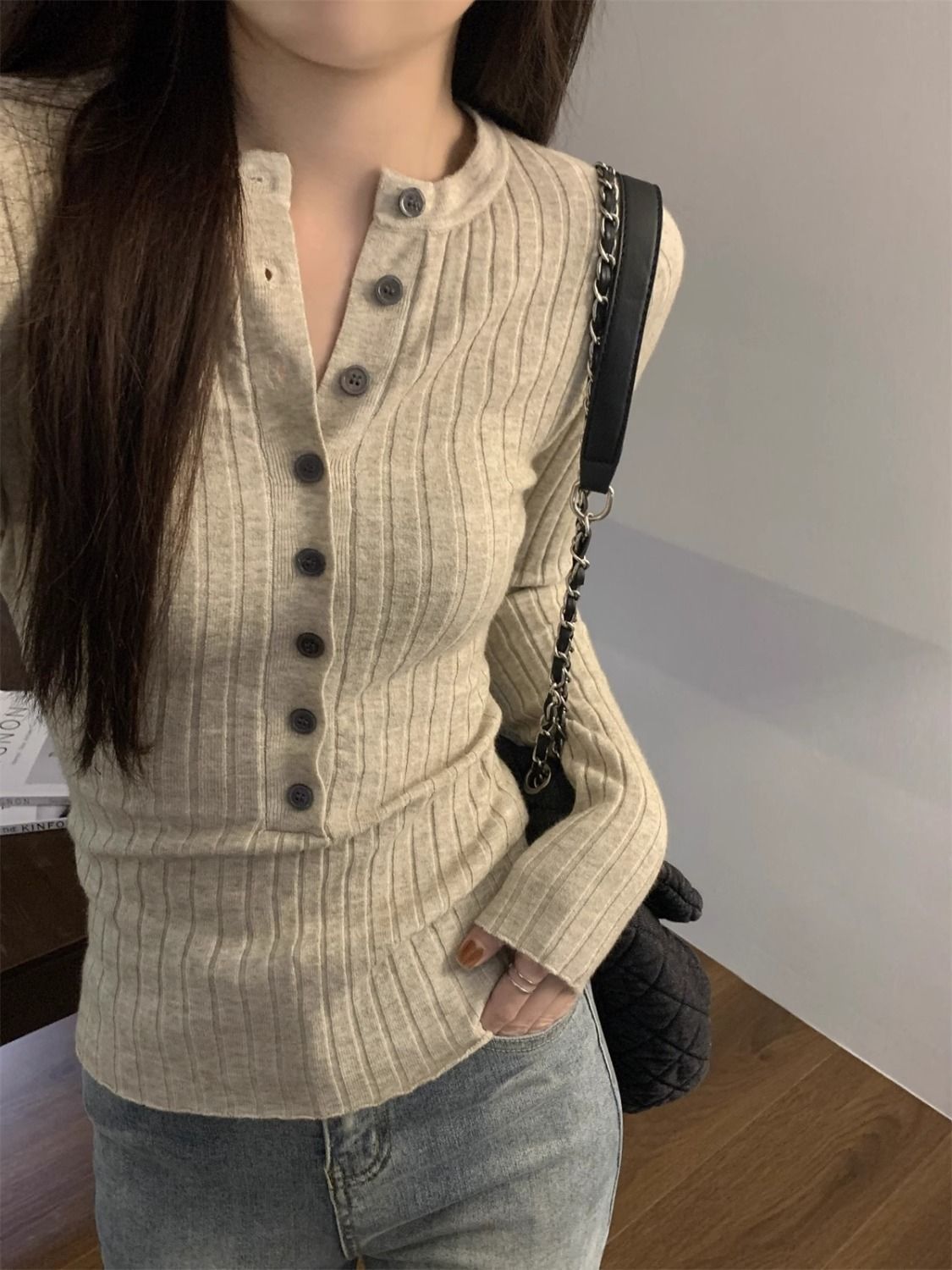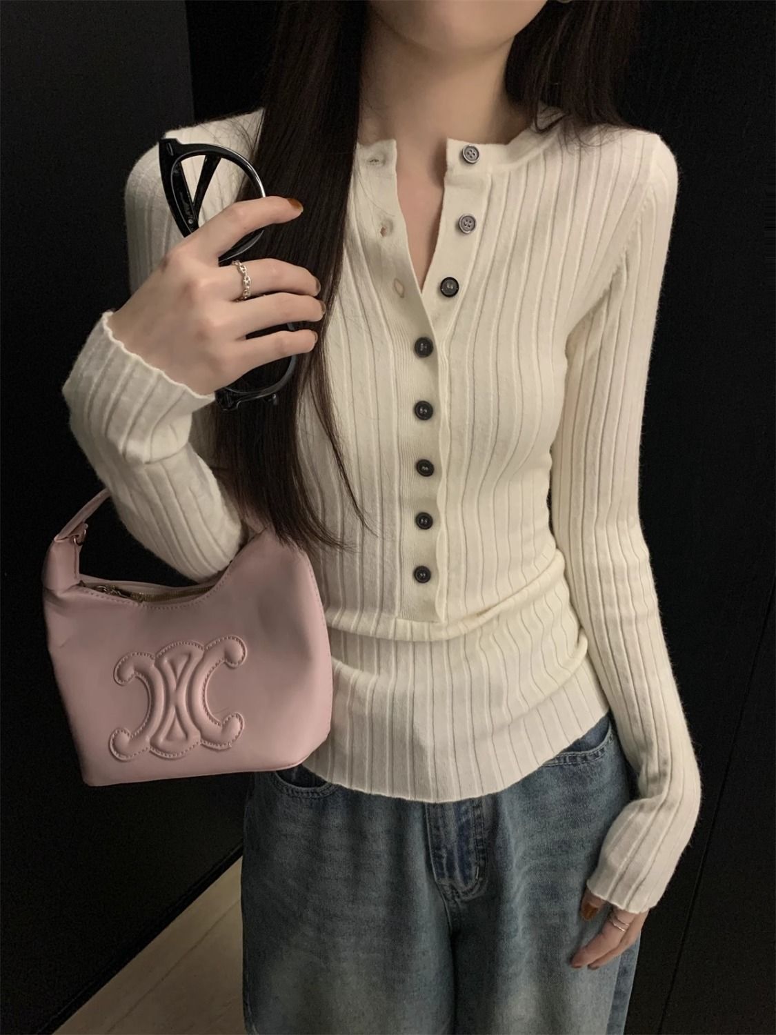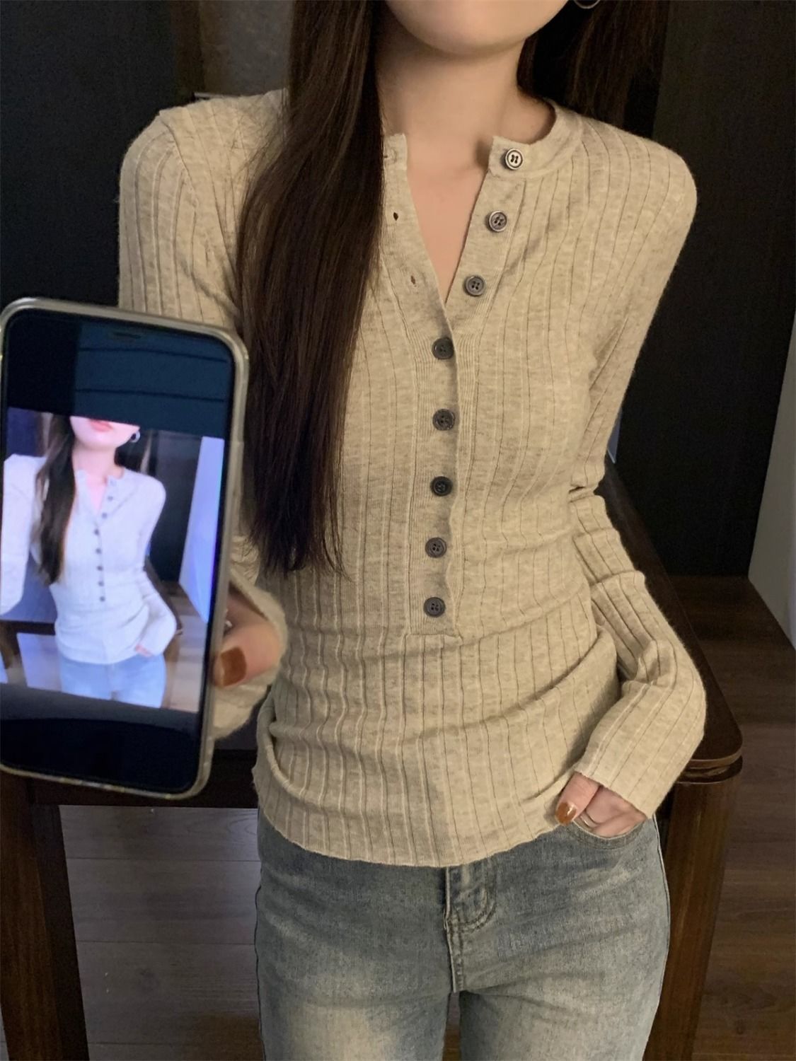 한국 스타일 슬림 핏 버튼 핏 긴팔 스웨터 여자 봄 2025 새로운 슬림베이스 올 매치 심플 탑스토어 가기
