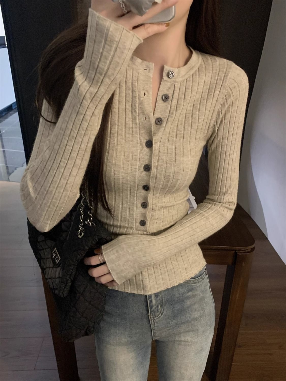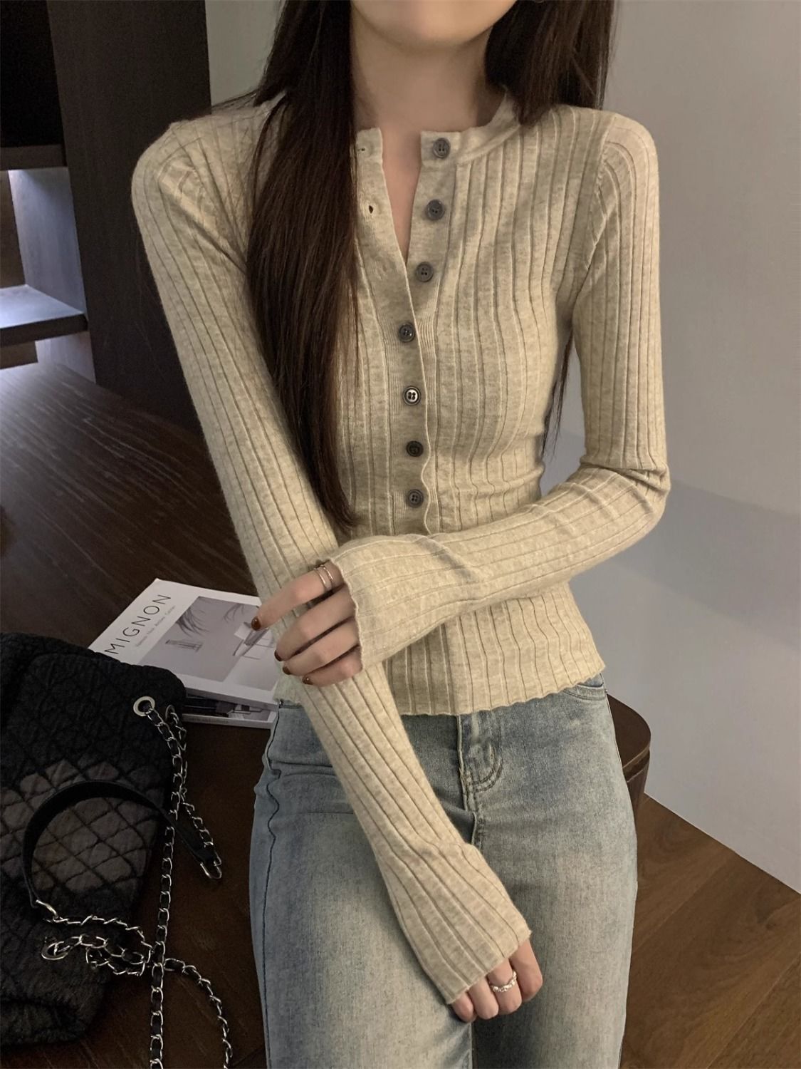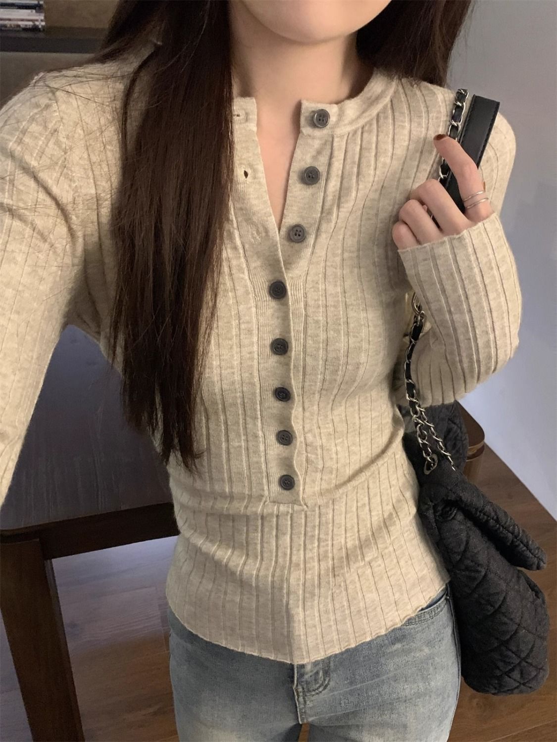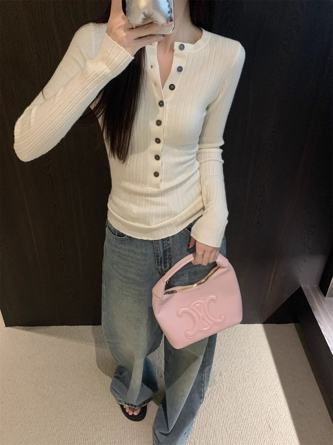 한국 스타일 슬림 핏 버튼 핏 긴팔 스웨터 여자 봄 2025 새로운 슬림베이스 올 매치 심플 탑스토어 가기