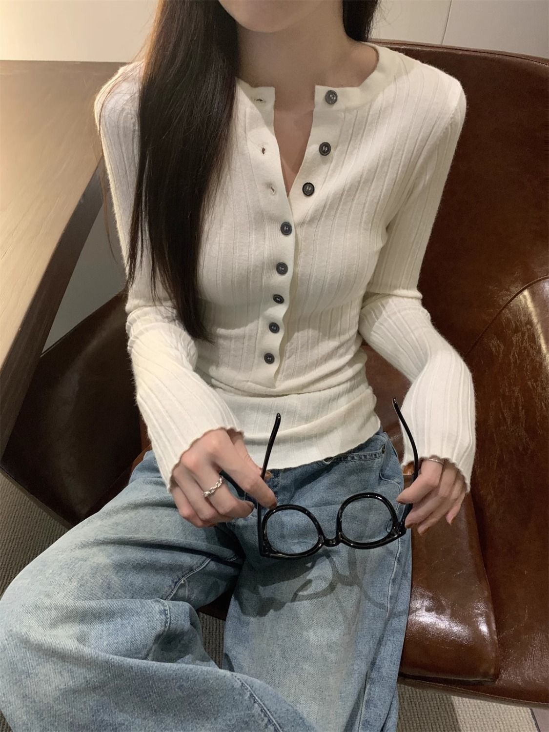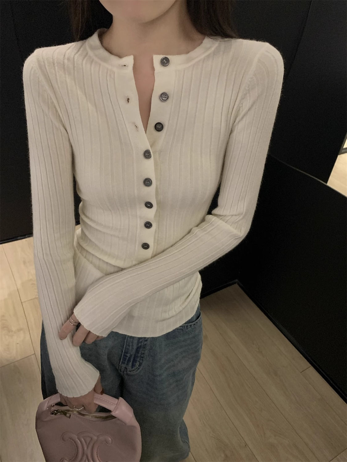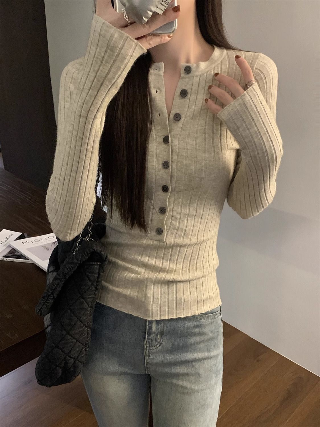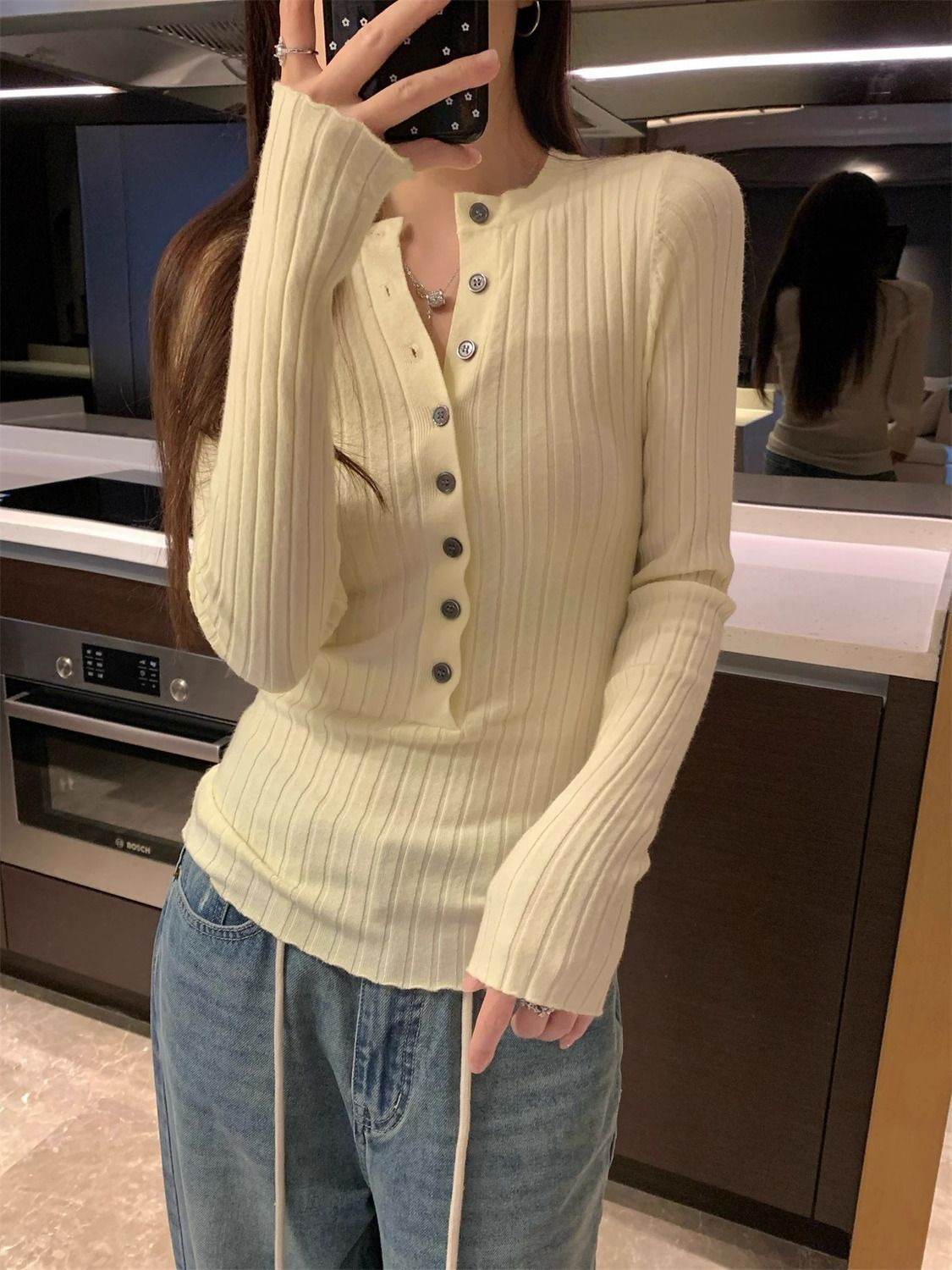 한국 스타일 슬림 핏 버튼 핏 긴팔 스웨터 여자 봄 2025 새로운 슬림베이스 올 매치 심플 탑