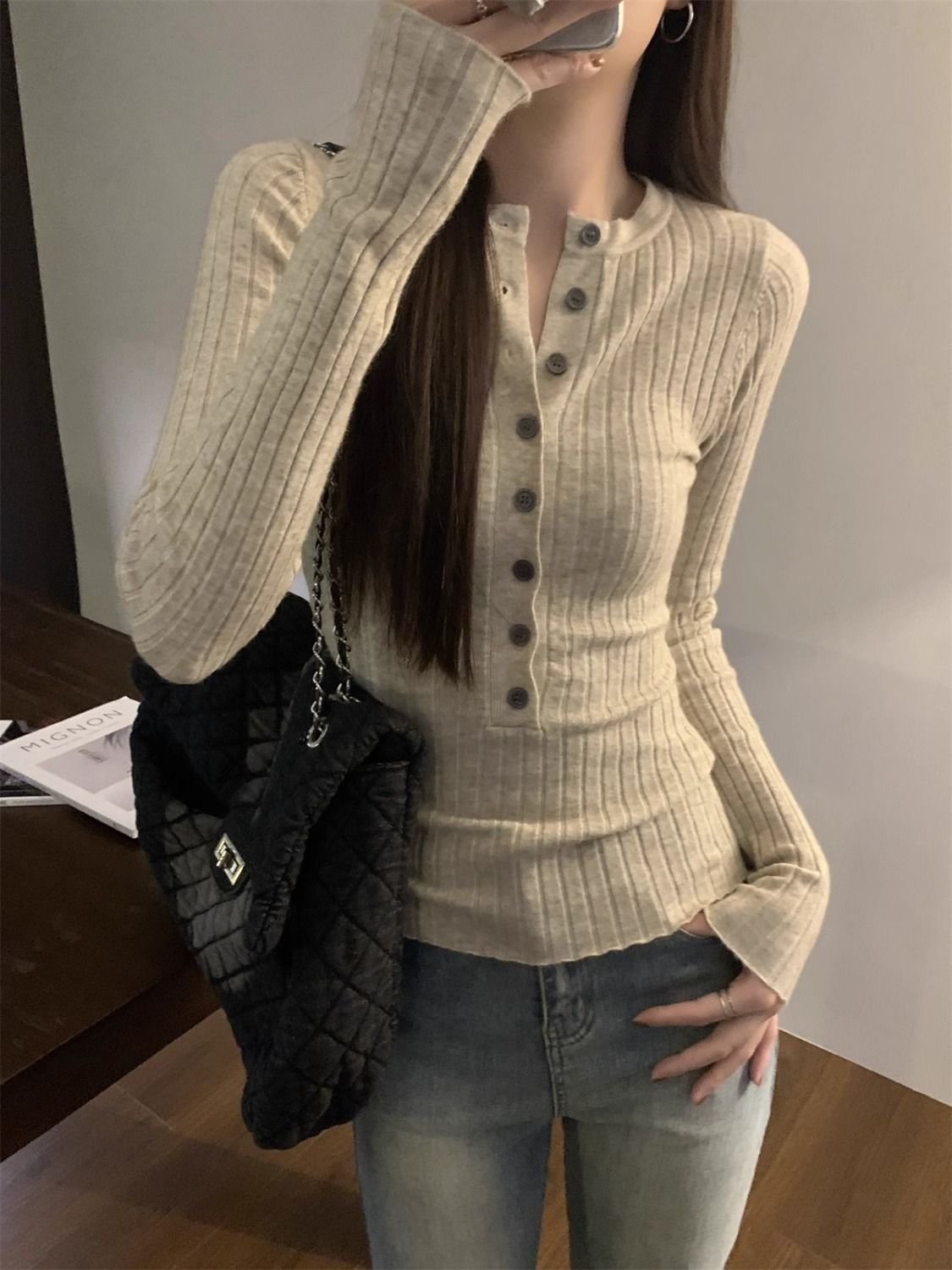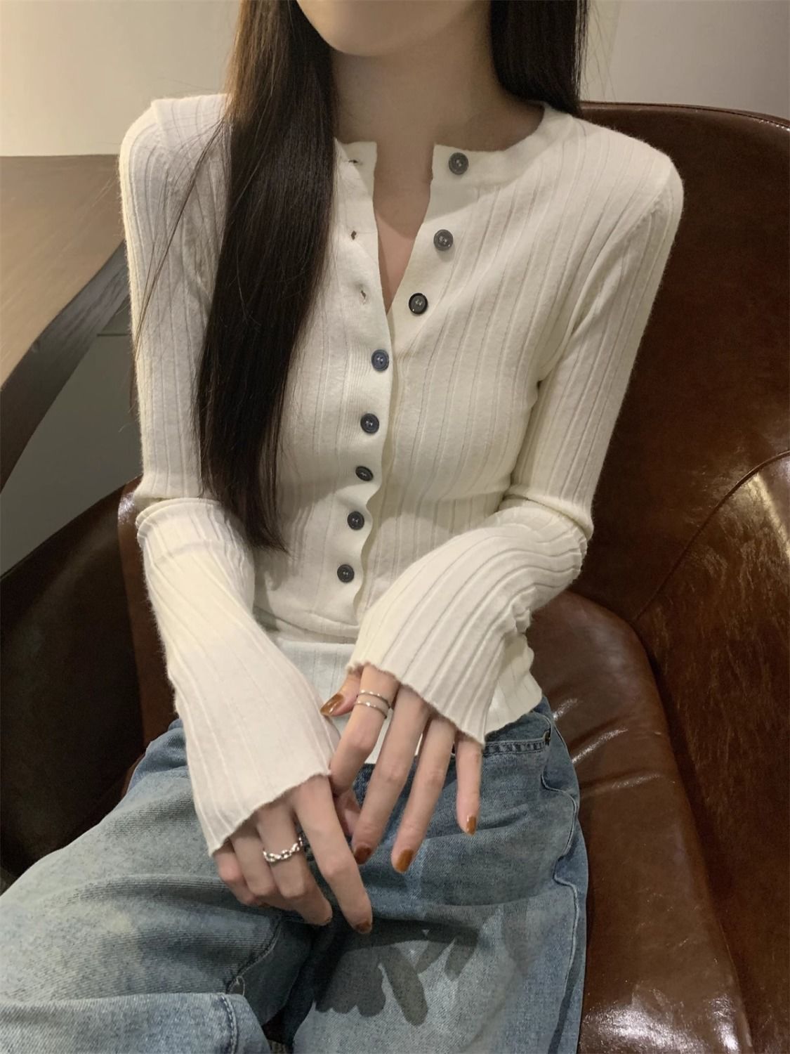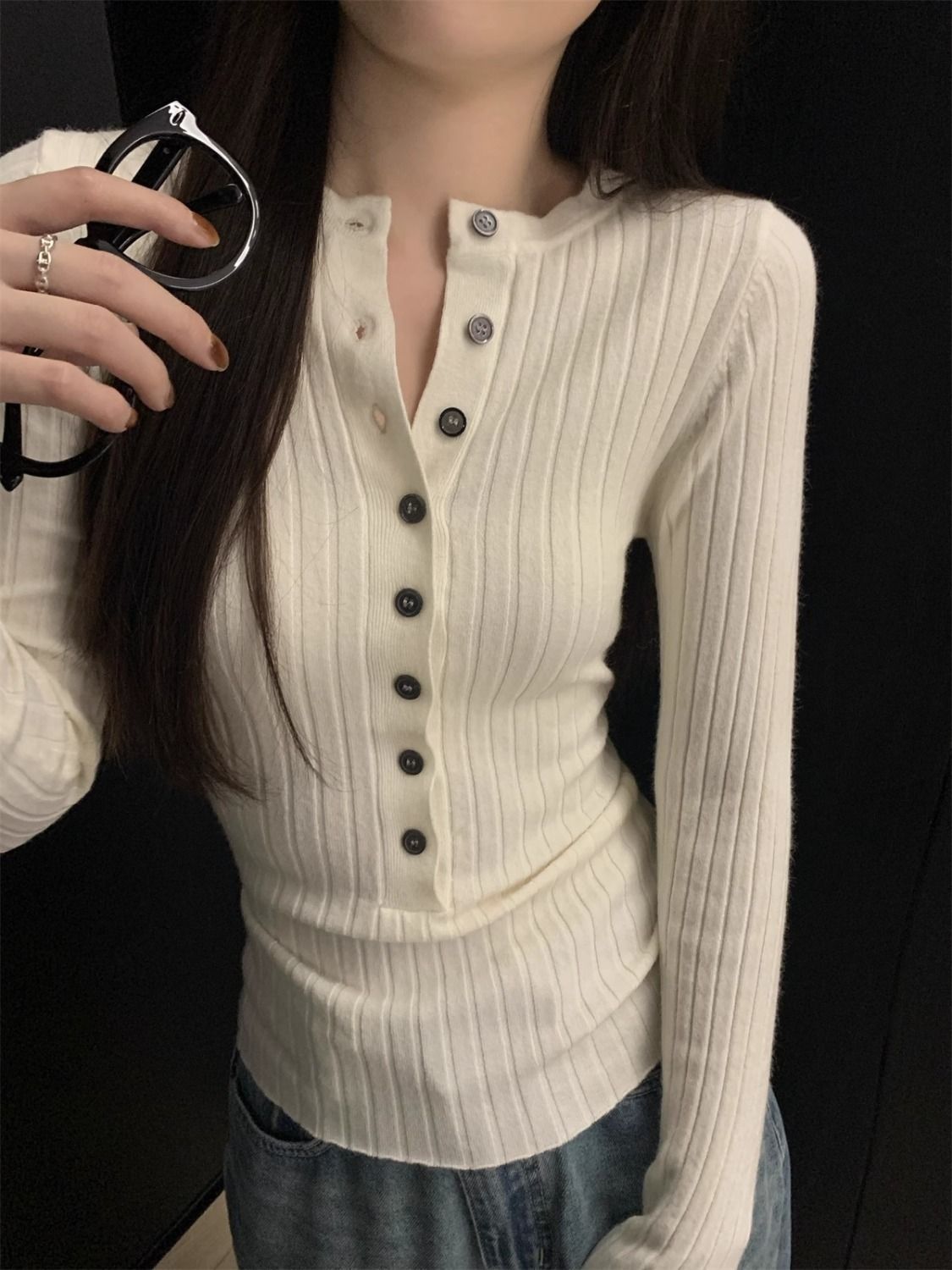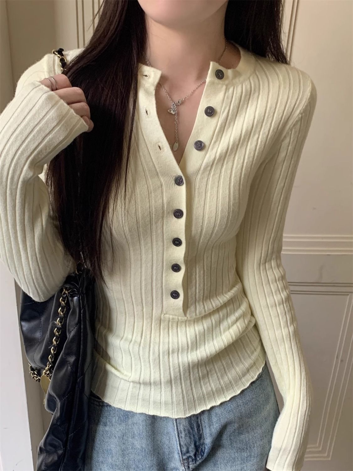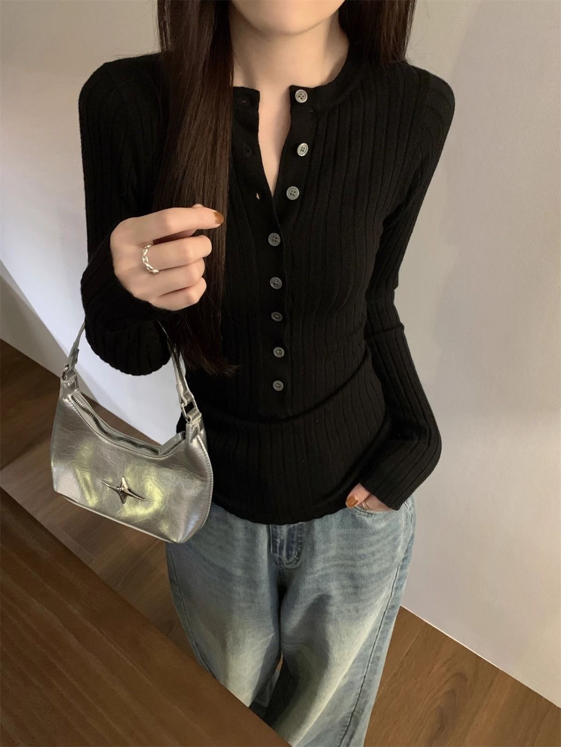 한국 스타일 슬림 핏 버튼 핏 긴팔 스웨터 여자 봄 2025 새로운 슬림베이스 올 매치 심플 탑