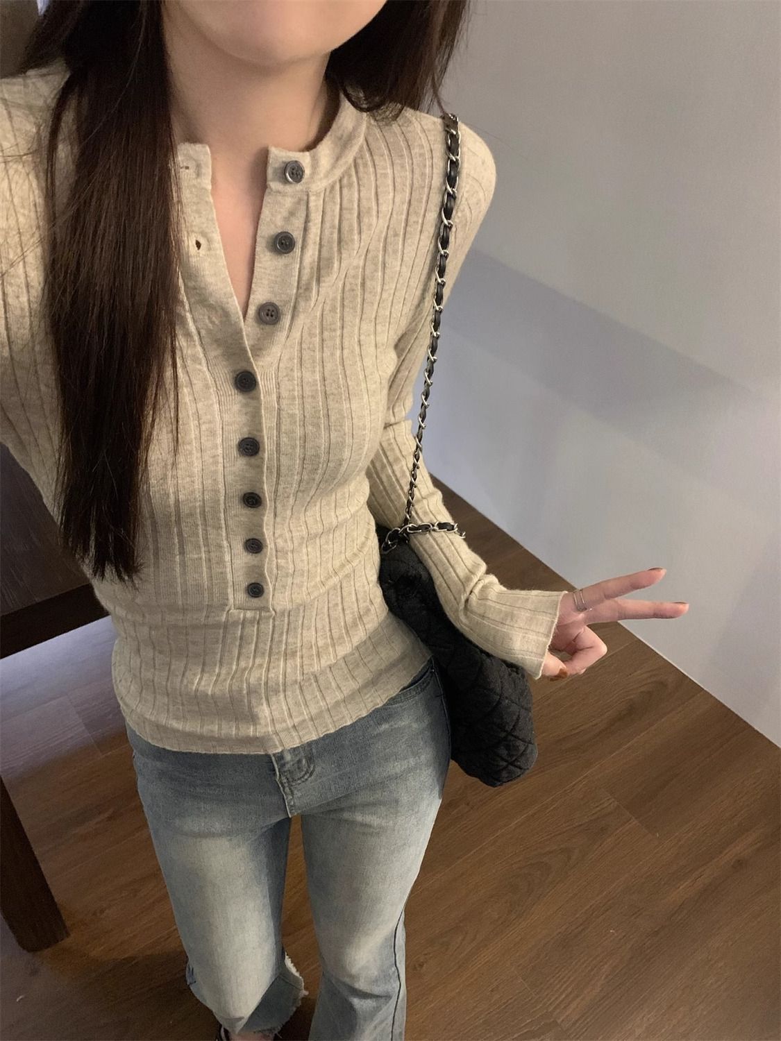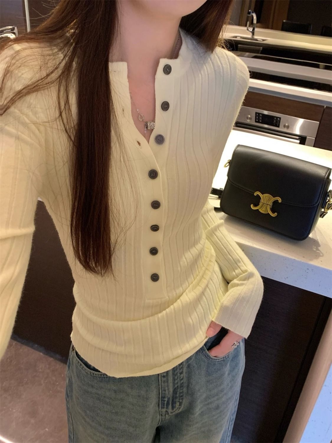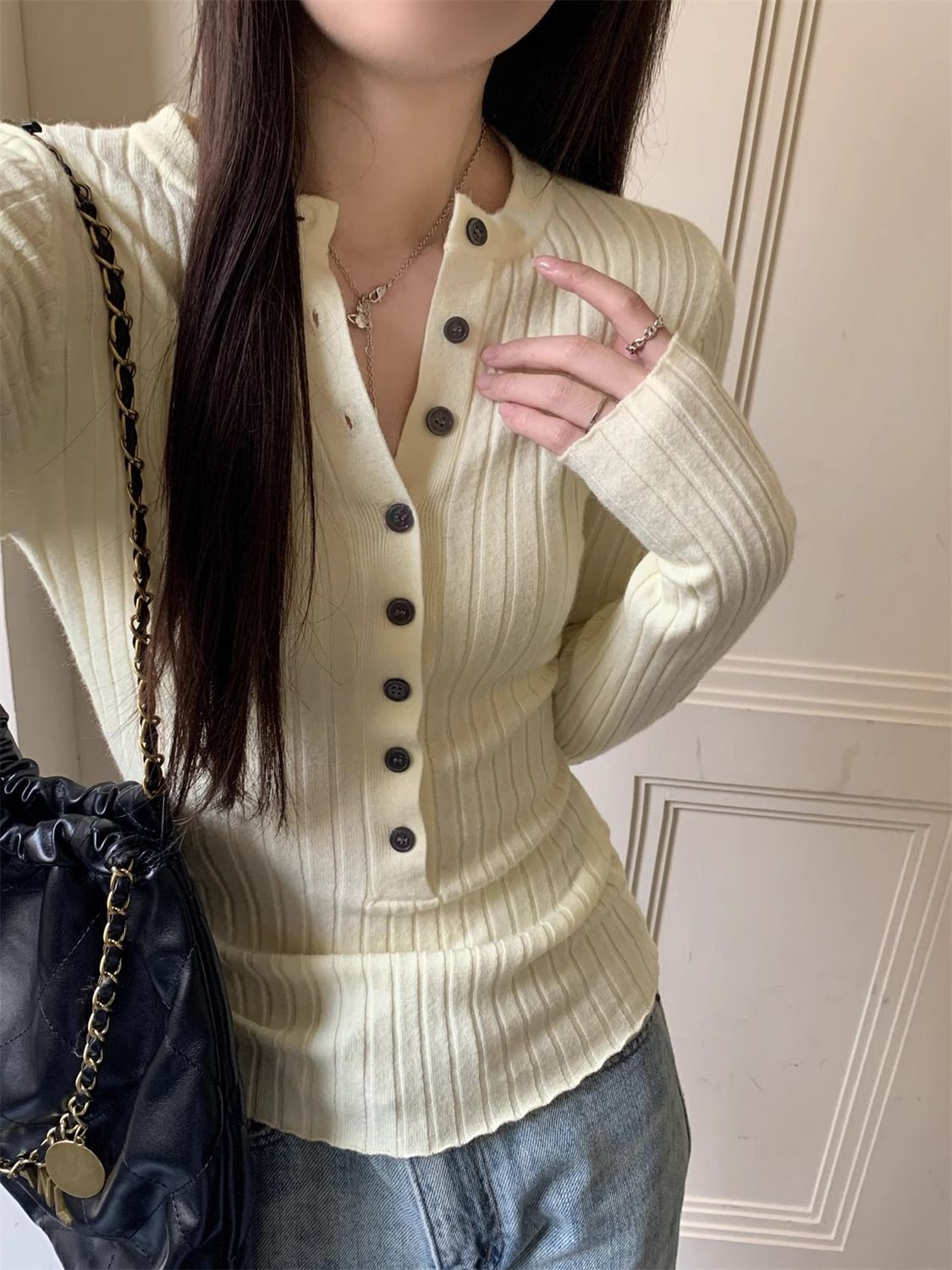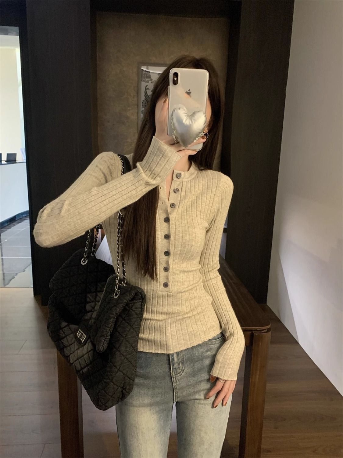 한국 스타일 슬림 핏 버튼 핏 긴팔 스웨터 여자 봄 2025 새로운 슬림베이스 올 매치 심플 탑