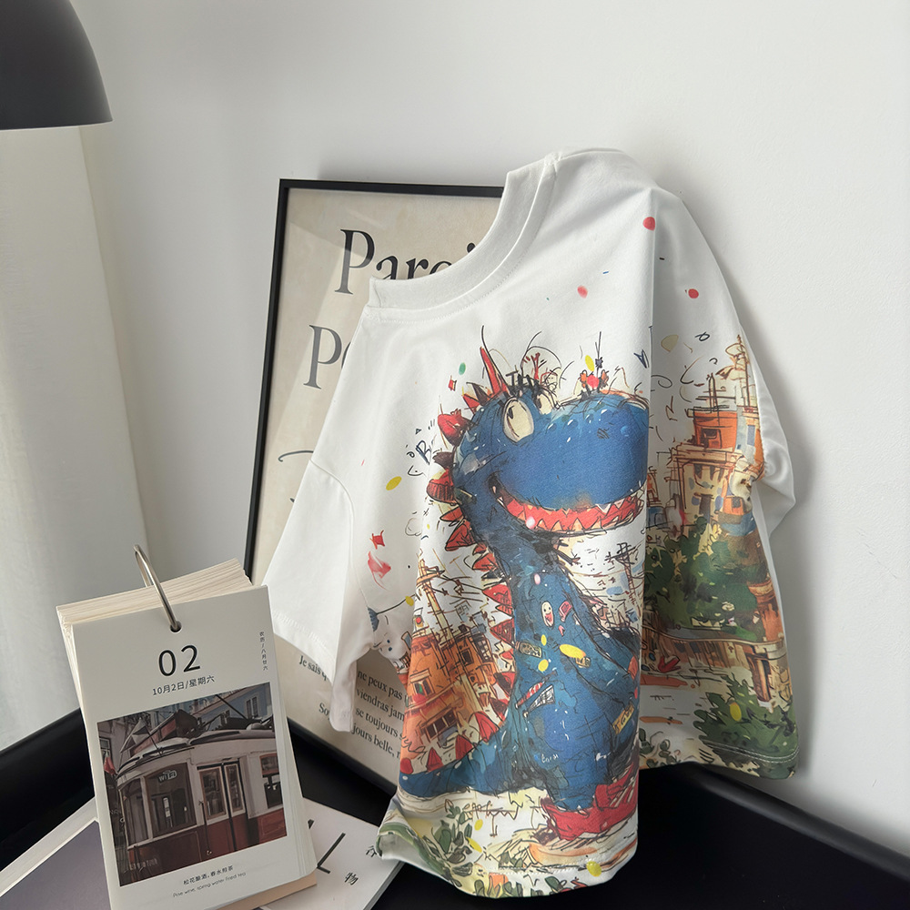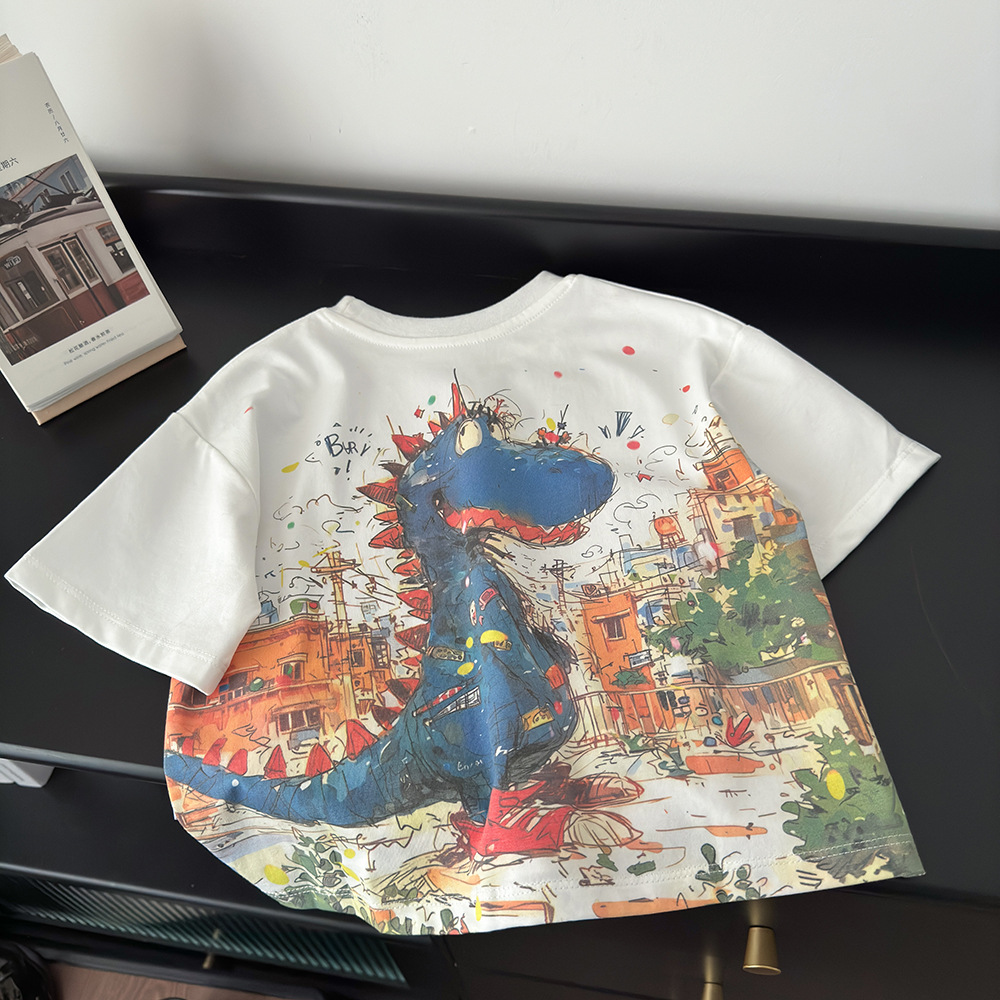 어린이 반팔 여름 새 루즈 티셔츠 풀 백 워터 마크 공룡 프린트 톱 2025 트렌디 쿨 보이즈 의류스토어 가기