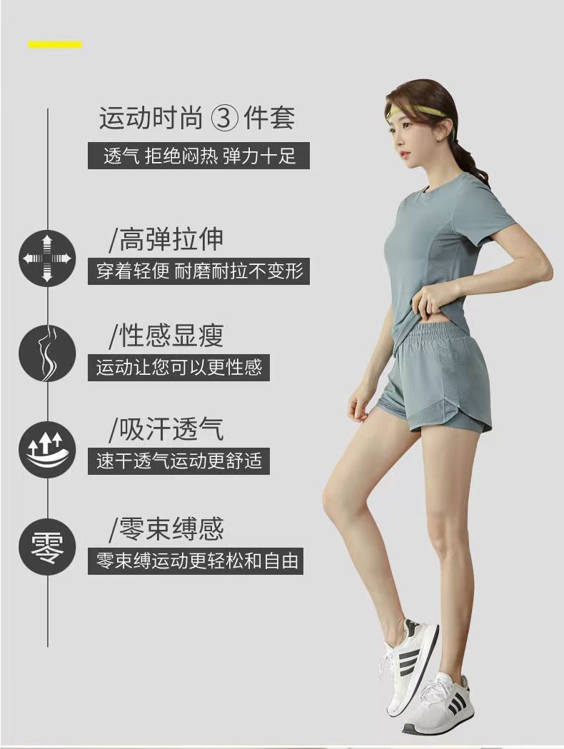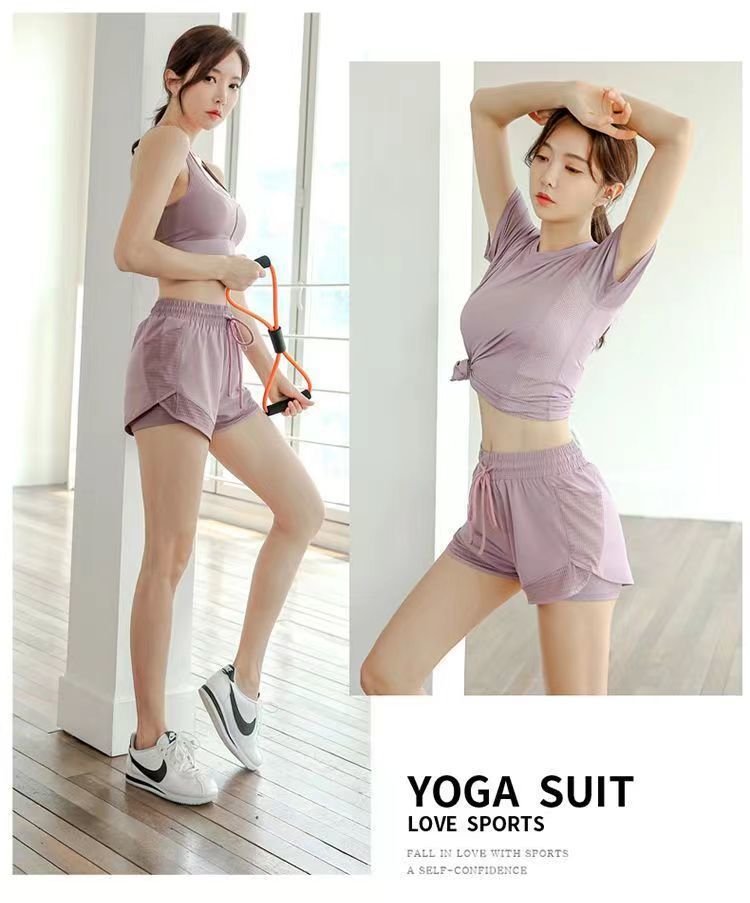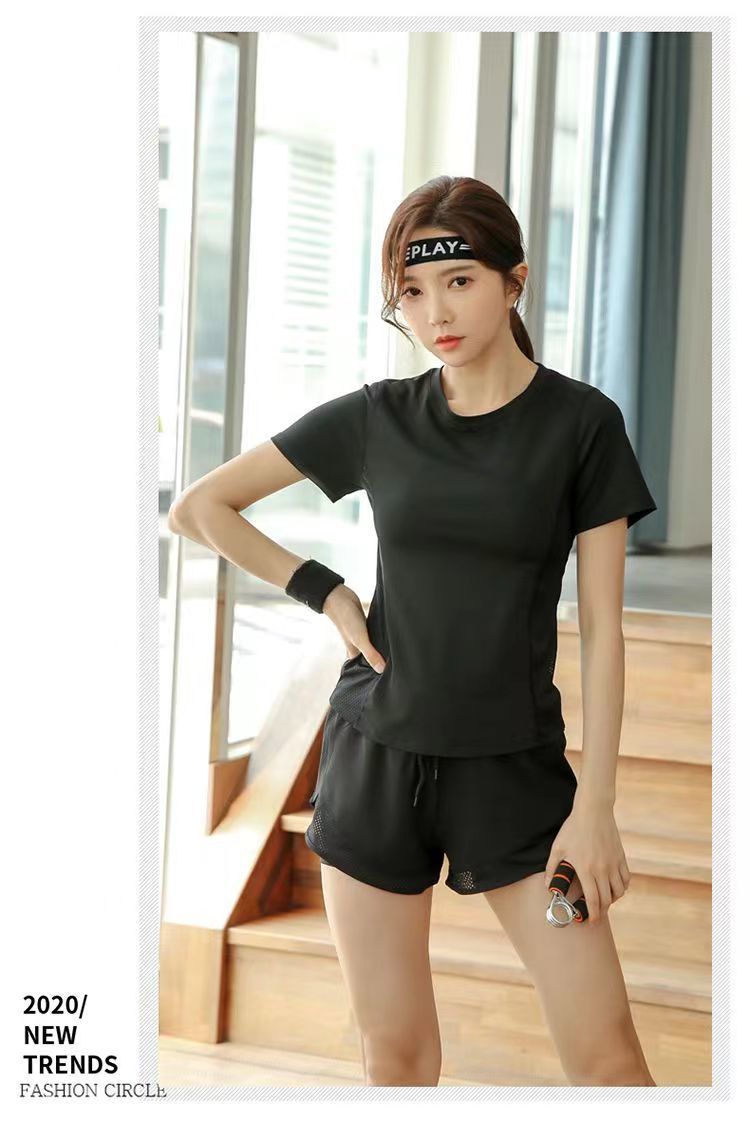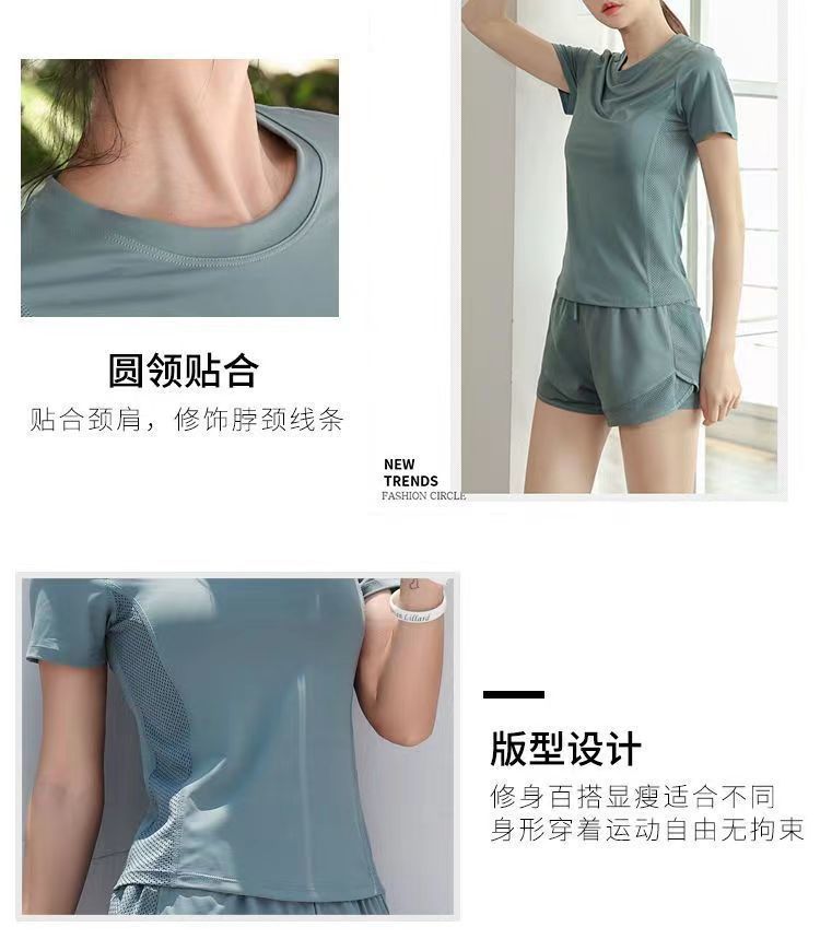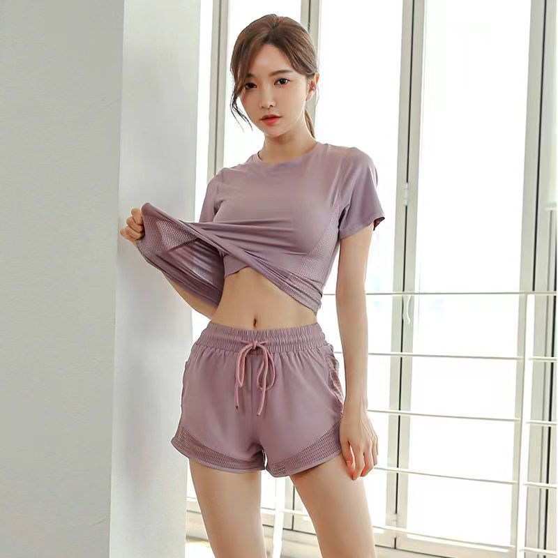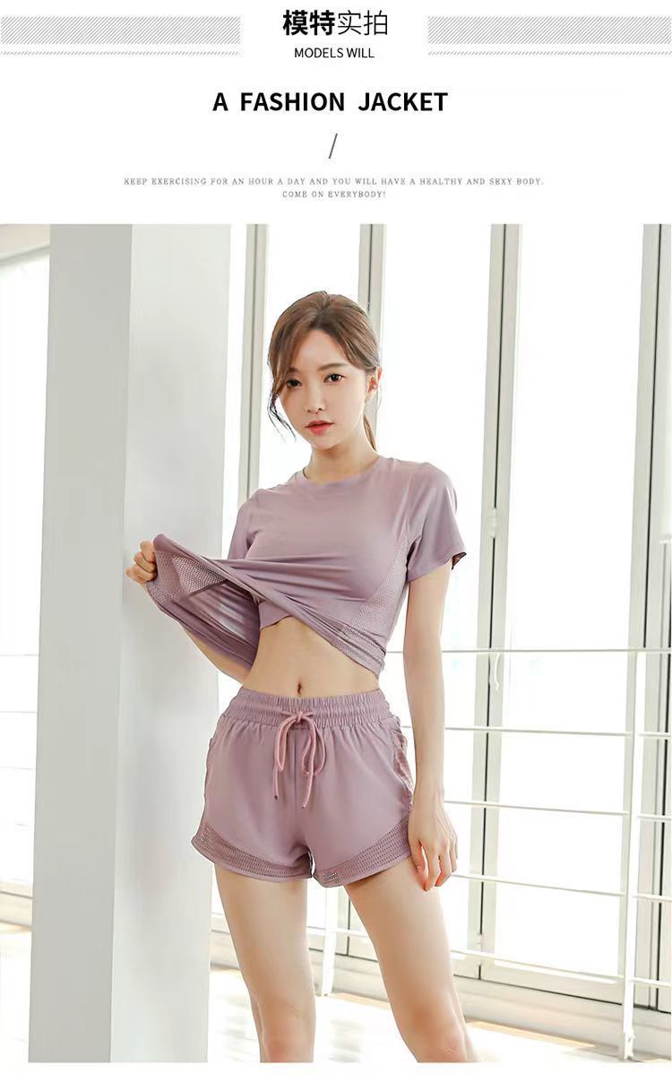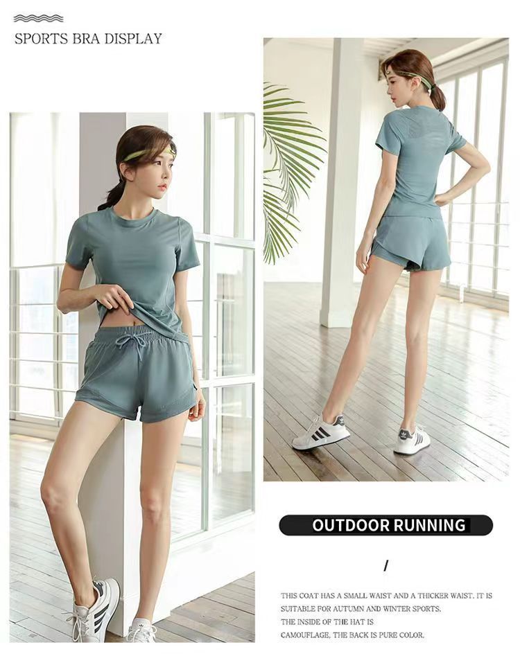 여자 요가 스포츠 세트 섹시한 패션 통기성 땀-위킹 반팔 티셔츠 여름 러닝 반바지 2 개 세트