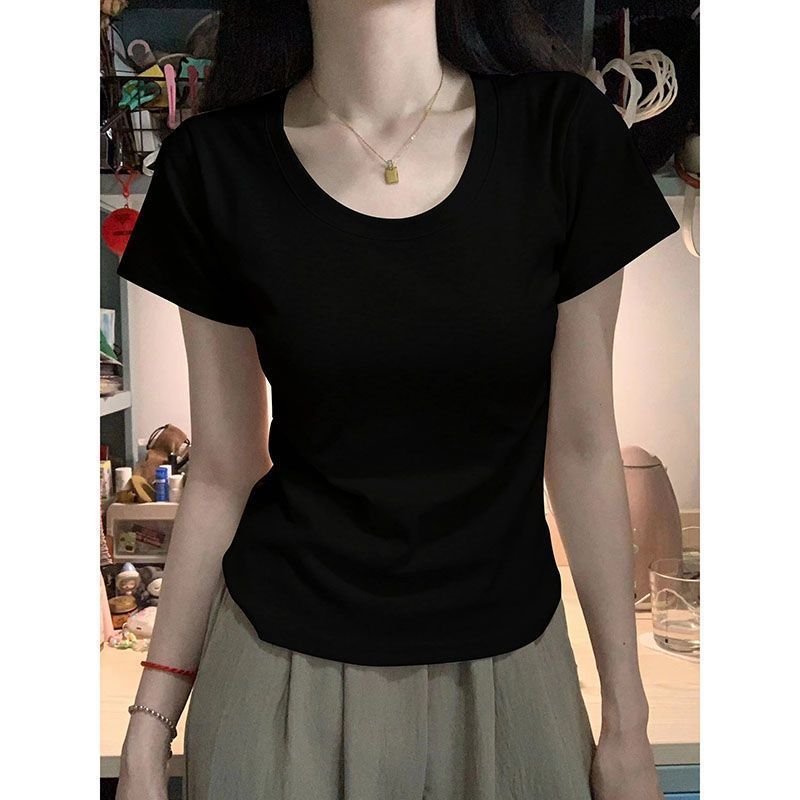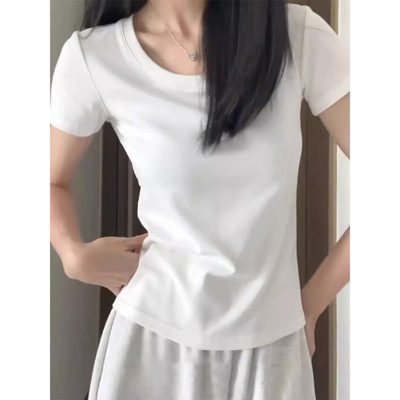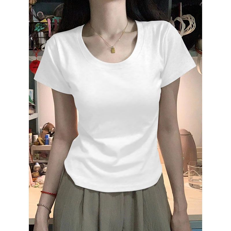 퓨어 코튼 화이트 U 칼라 어깨 반팔 여름 슬림 핏 티셔츠 간단한 올 매치 기본 캐주얼 솔리드 컬러 니치 탑스토어 가기