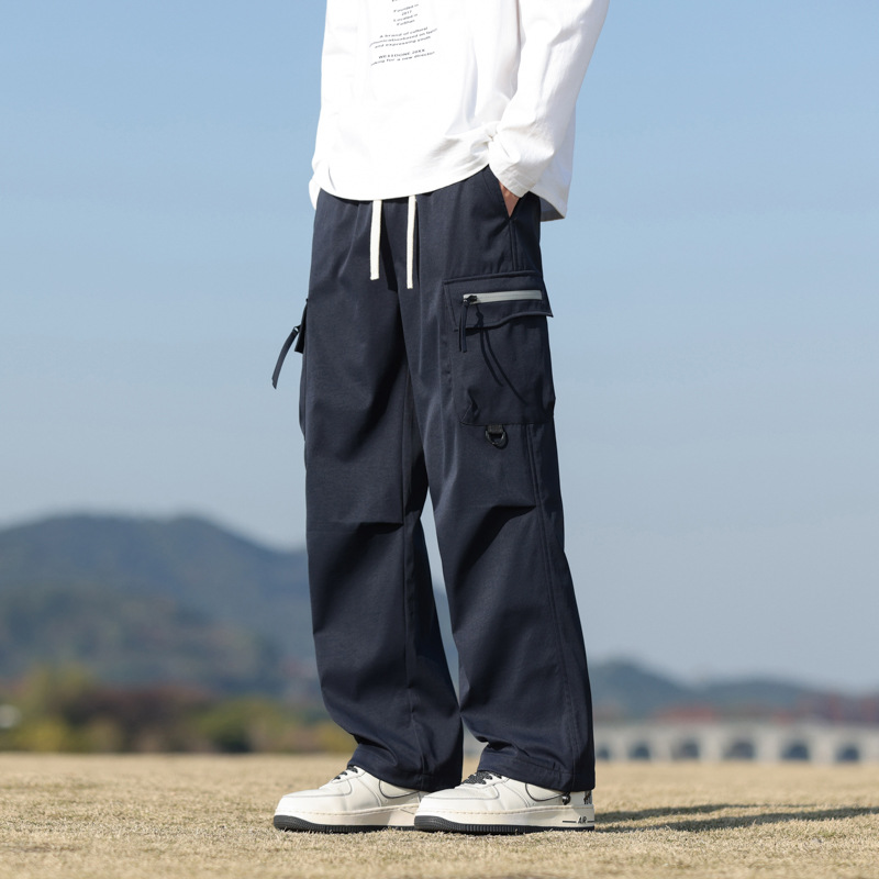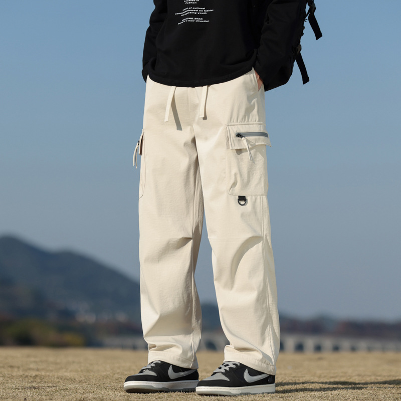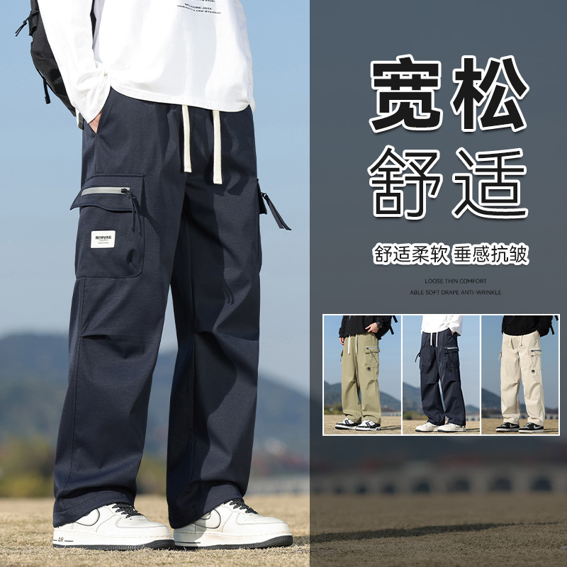 무료 배송 2025 봄 새로운 홍콩 스타일 툴링 커플 캐주얼 바지 남성용 느슨한 솔리드 컬러 스트레이트 바지 남성용 지방 플러스 사이즈