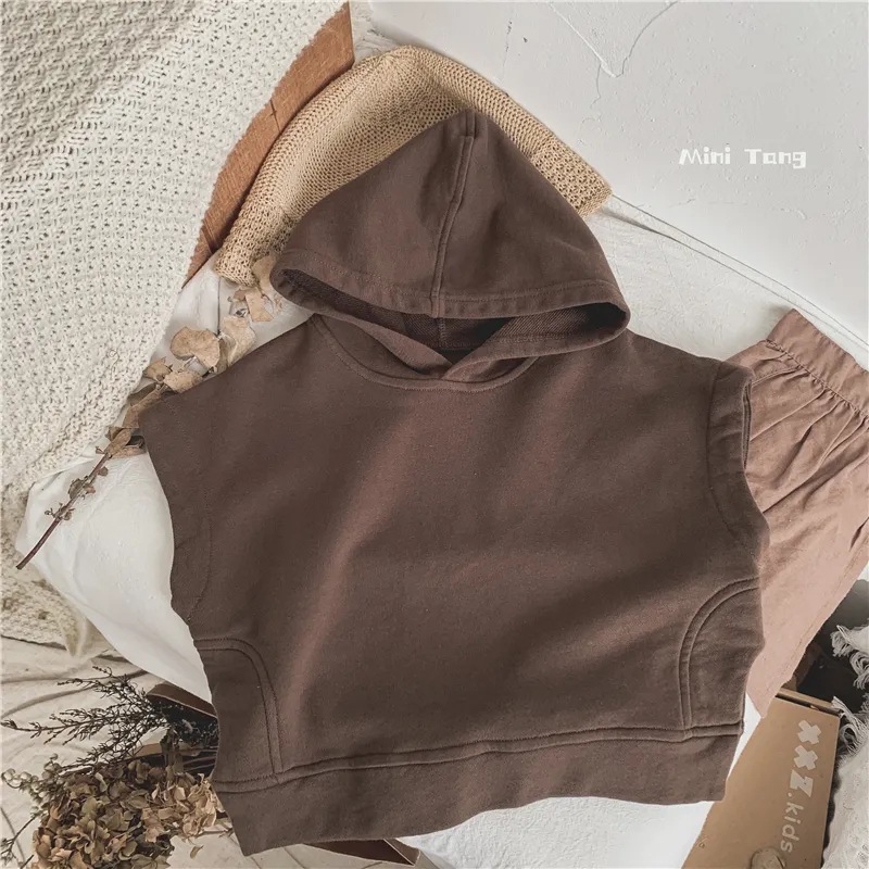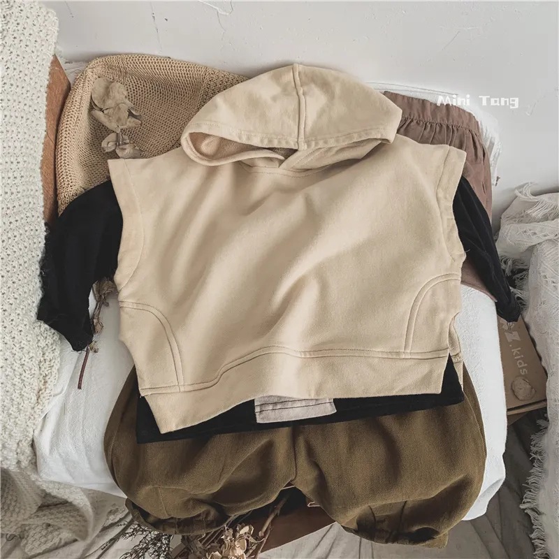 한국판 개성 ~ 어린이 후드 테리 소재 조끼 남녀 아기 슬릿 조끼는 봄과 가을 아동복 조끼입니다.