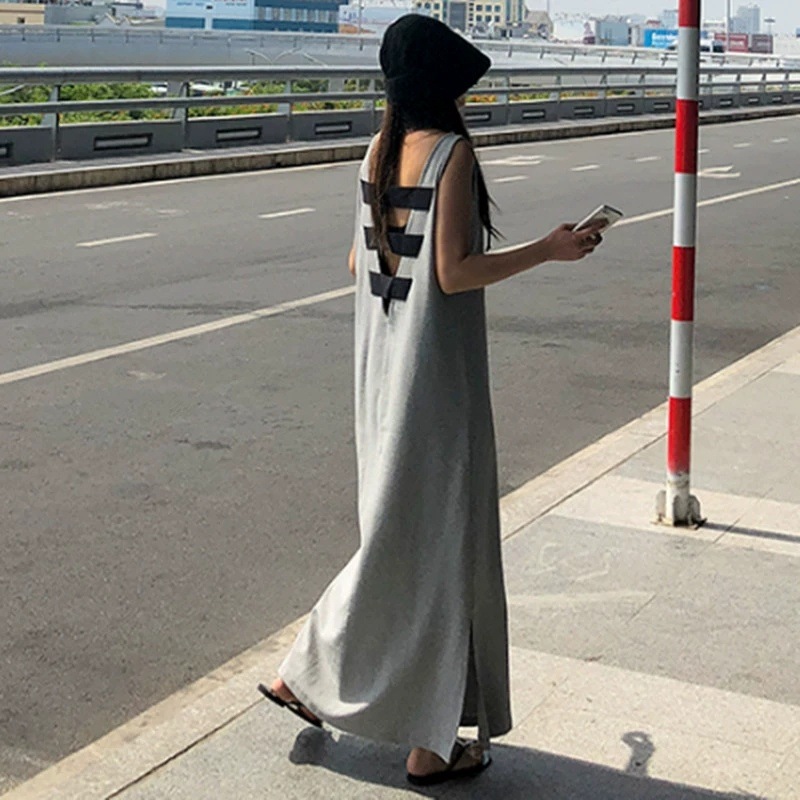 [포켓] 여름 국경 원피스 플러스 사이즈 멜빵 유럽 및 미국 새로운 민소매 분할 무릎 조끼 원피스