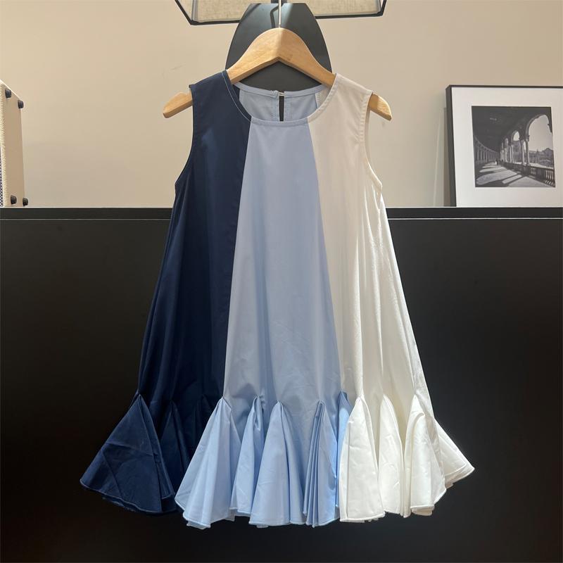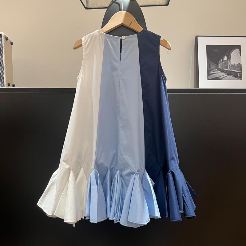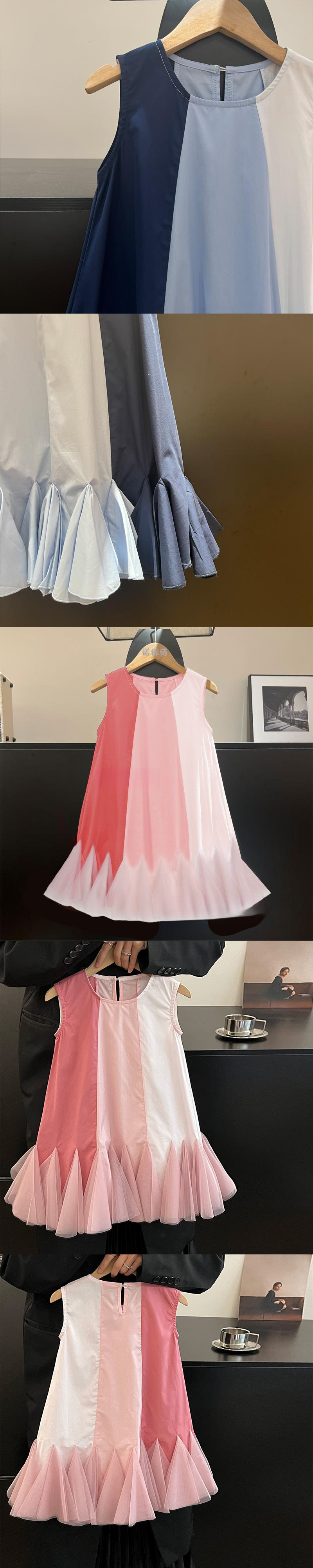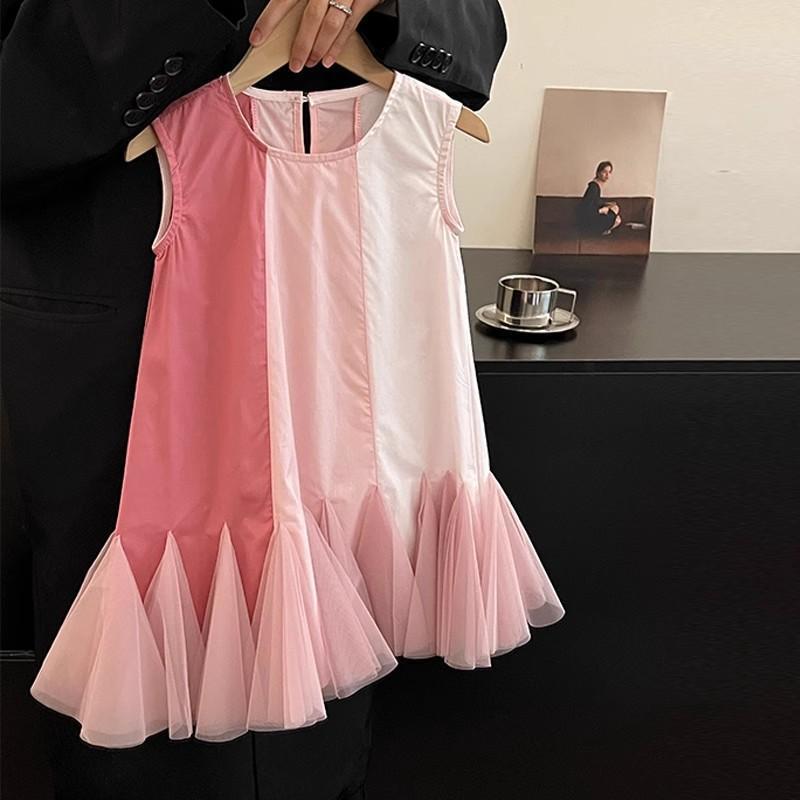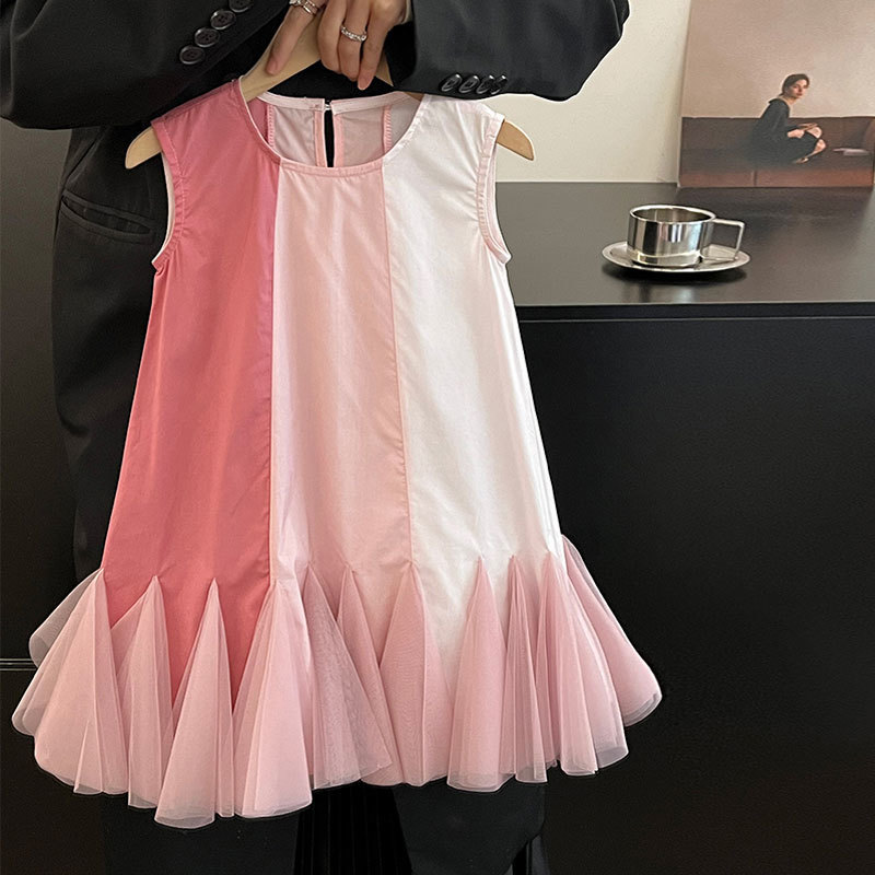 한국 아동복 2025 여름 소녀 원피스 유행 우아한 컬러 매칭 로터스 리프 민소매 Vip 스커트