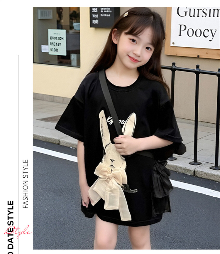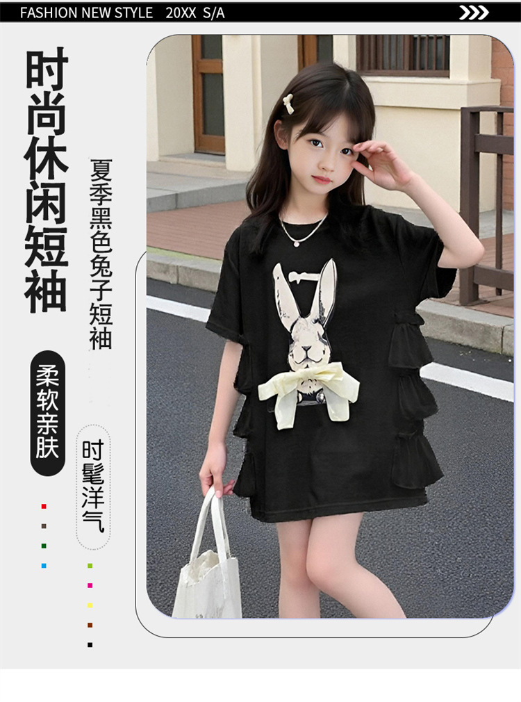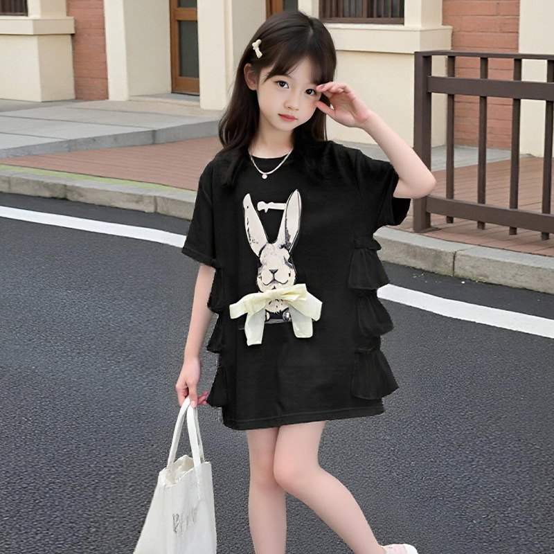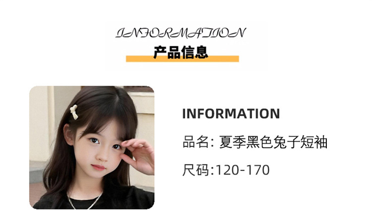 소녀의 검은 토끼 반팔 티셔츠 여름 얇은 2025 여름 새 도착 중견 어린이 반소매 티셔츠스토어 가기