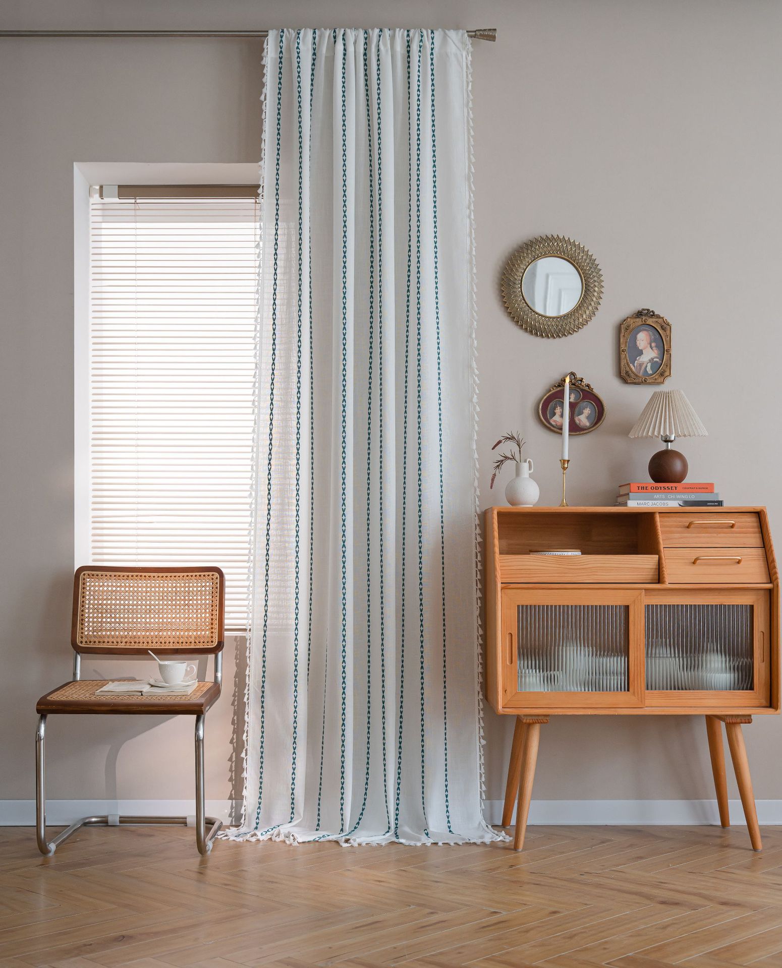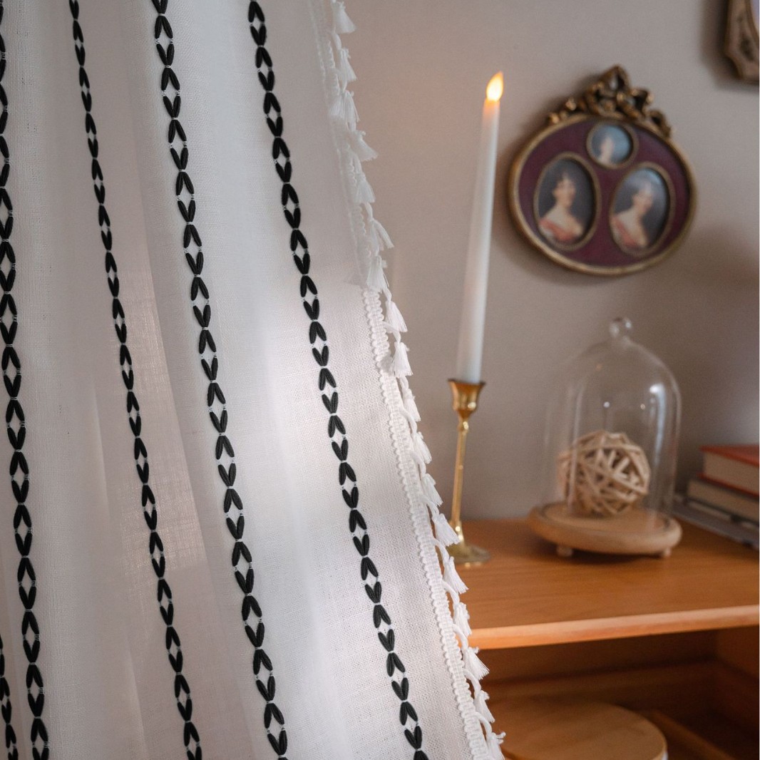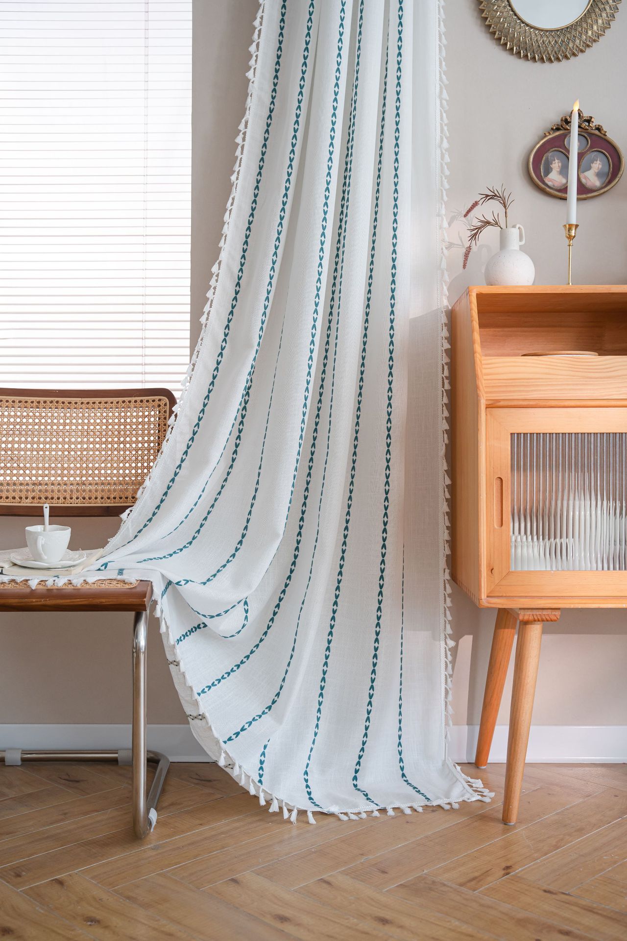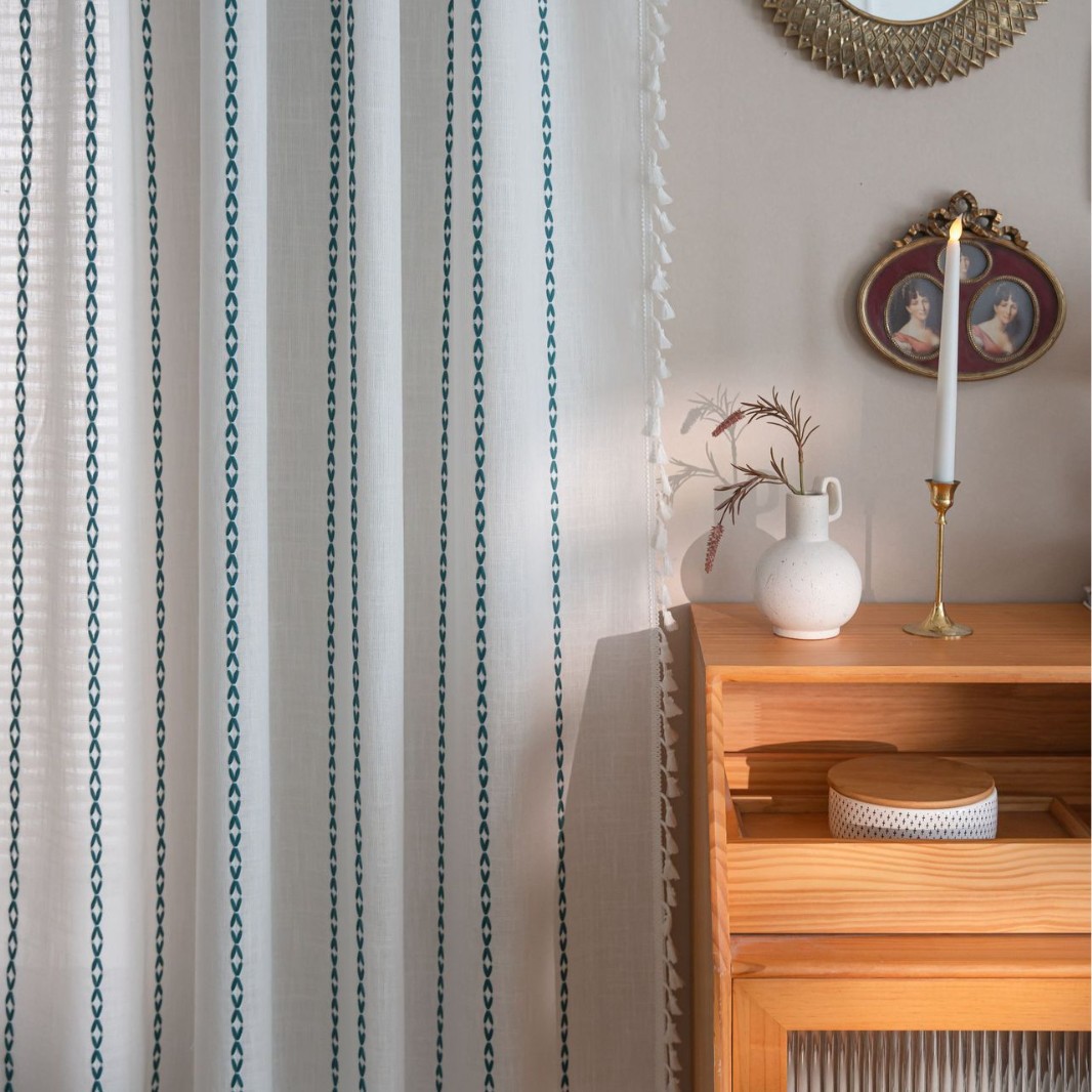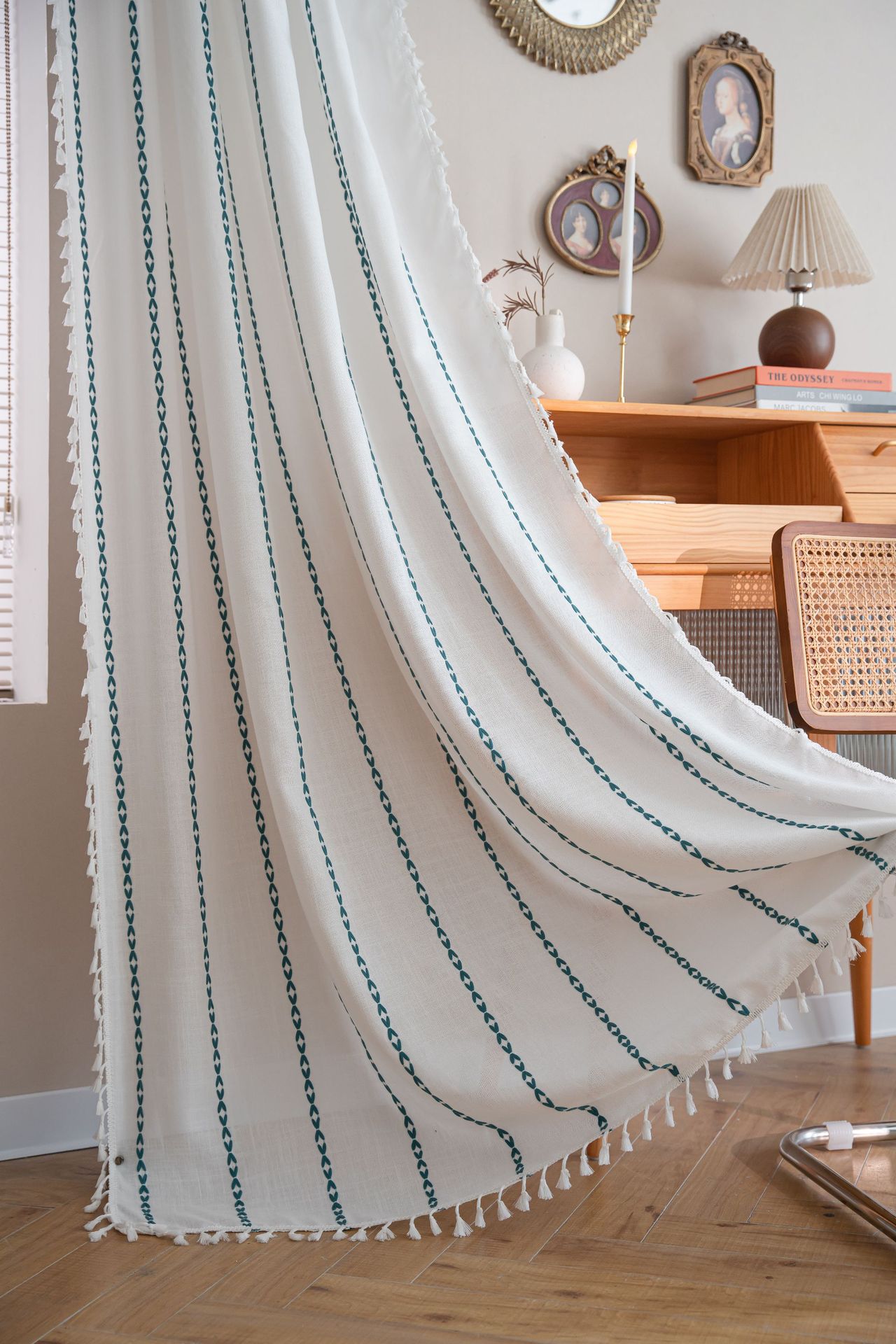 Yimanqiyun 커튼 완제품 줄무늬 수 놓은 단색 대비 색상 주방 커튼 미국 컨트리 스타일 반 차광 창