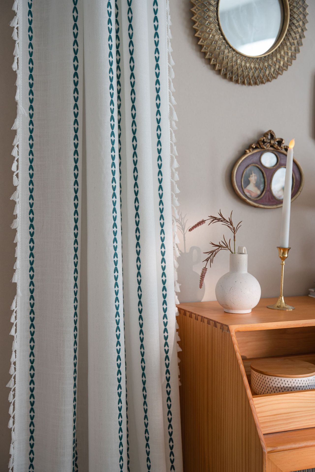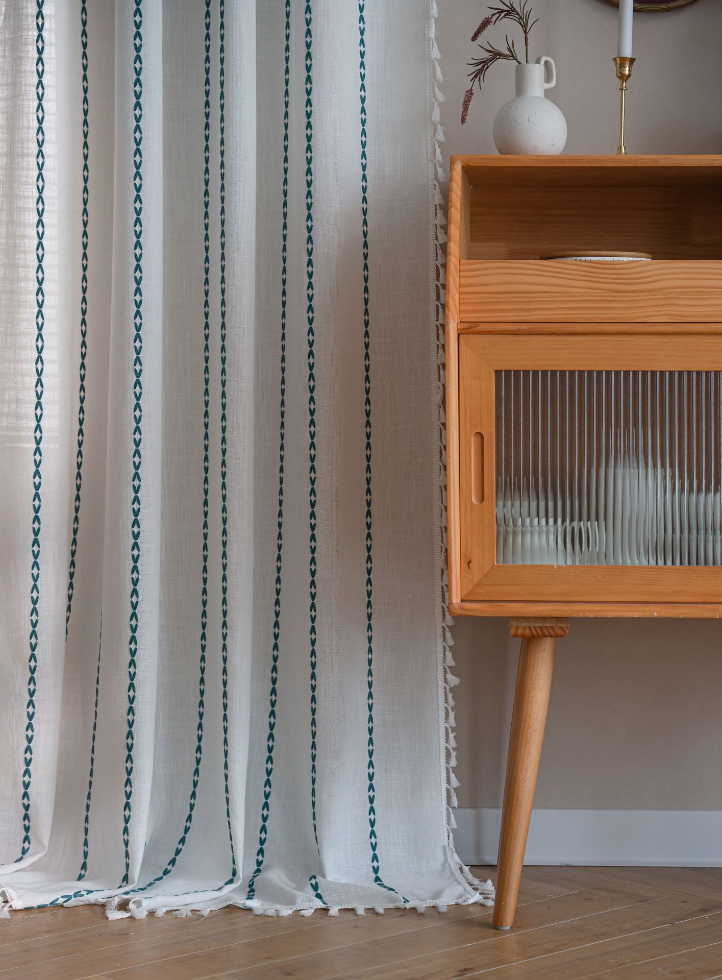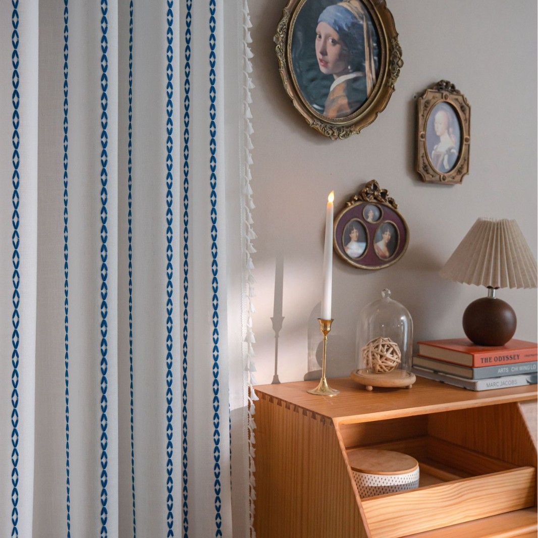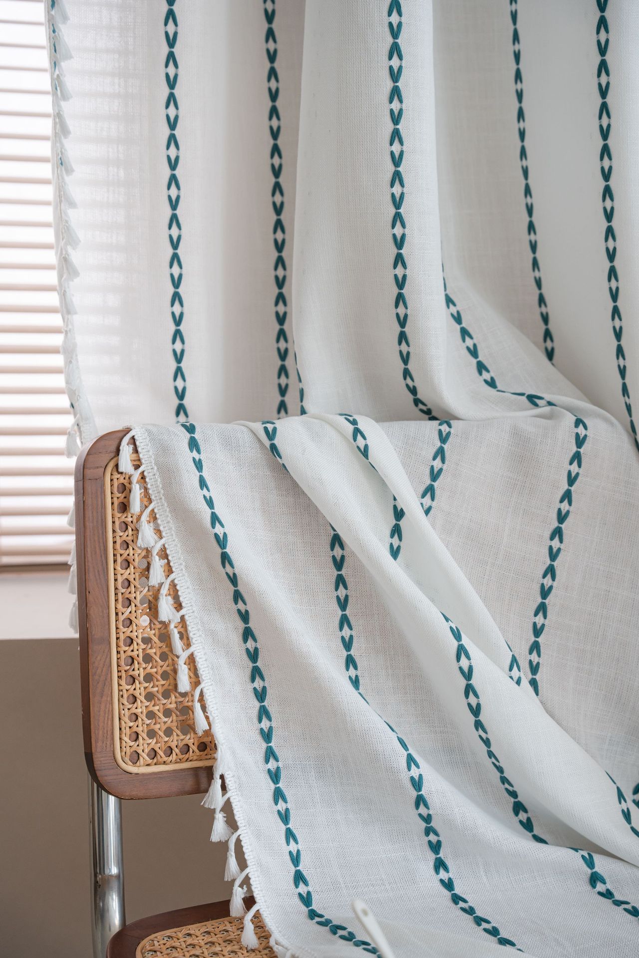 Yimanqiyun 커튼 완제품 줄무늬 수 놓은 단색 대비 색상 주방 커튼 미국 컨트리 스타일 반 차광 창