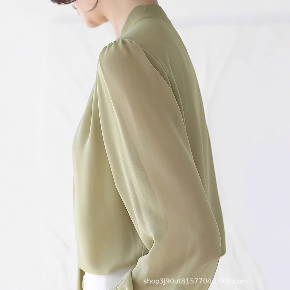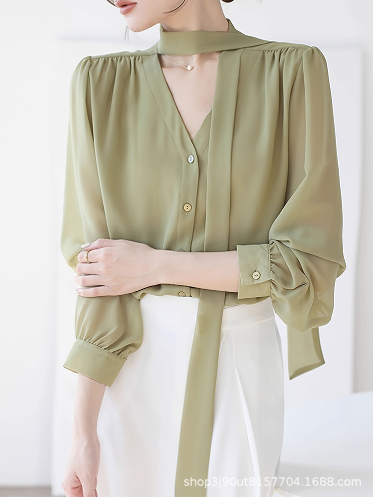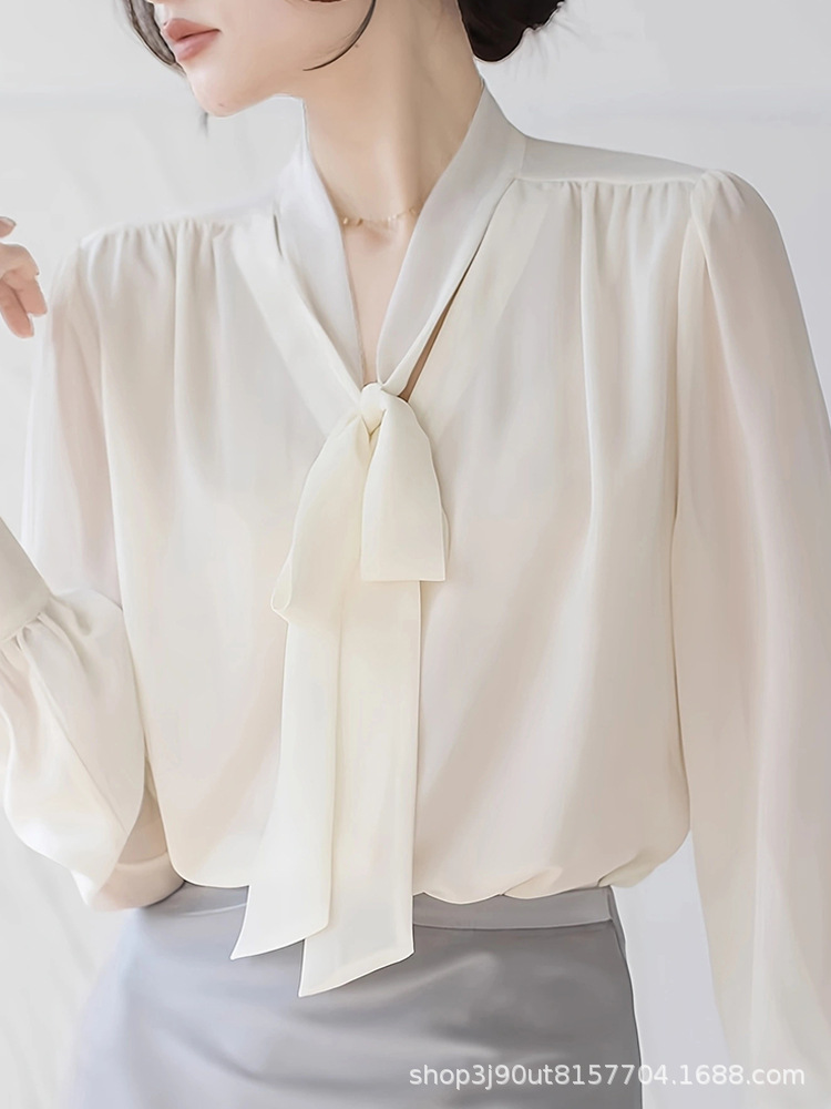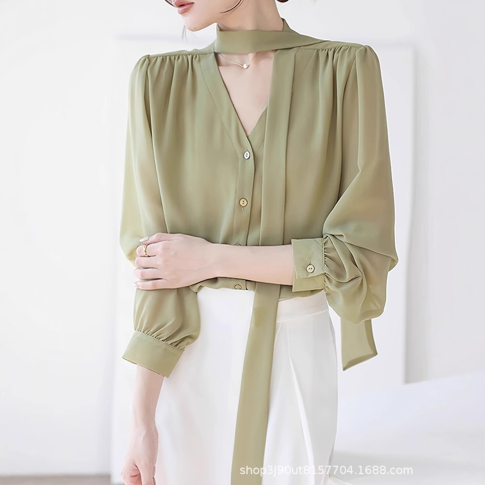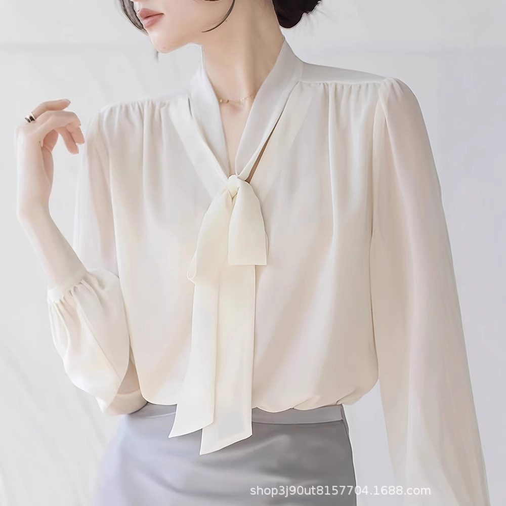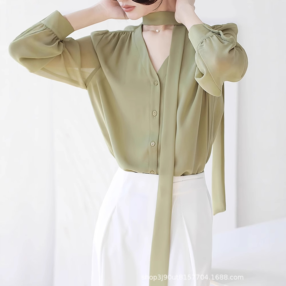 프랑스 스타일의 부드러운 스트랩 화이트 셔츠 여성의 2025 봄과 가을 새로운 틈새 우아한 V 넥 슬림 룩 올 매치 탑스토어 가기