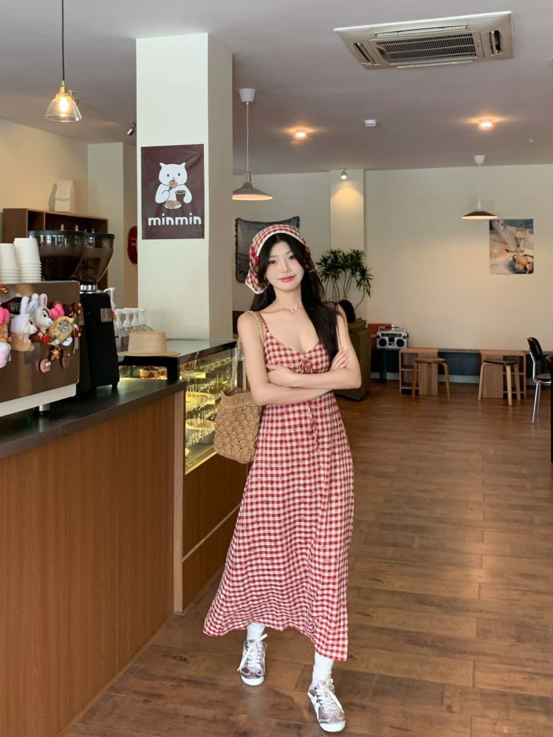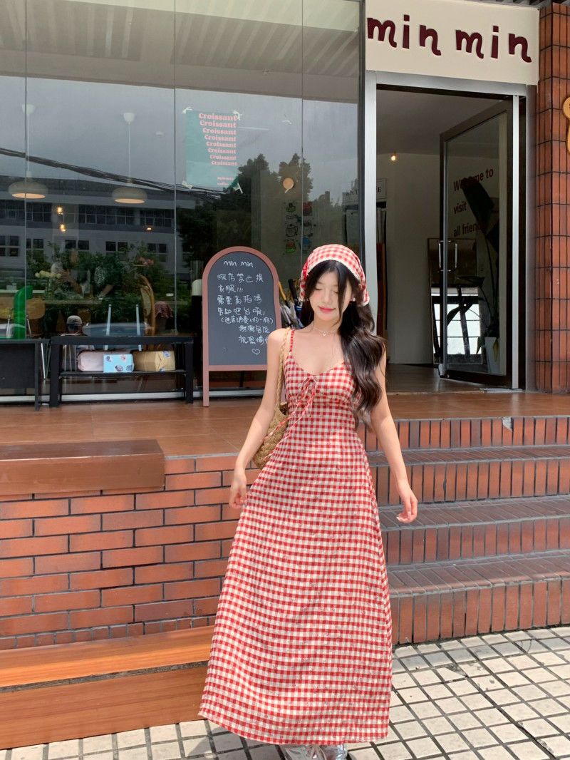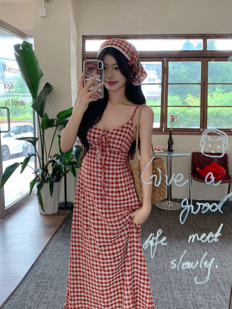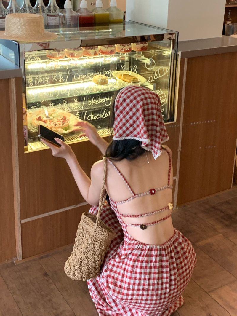 Backless Red Plaid Sling 원피스 여성 여름 새로운 도착 프랑스 목가적 인 슬림-피트 타이트 허리 슬리밍 롱 스커트스토어 가기