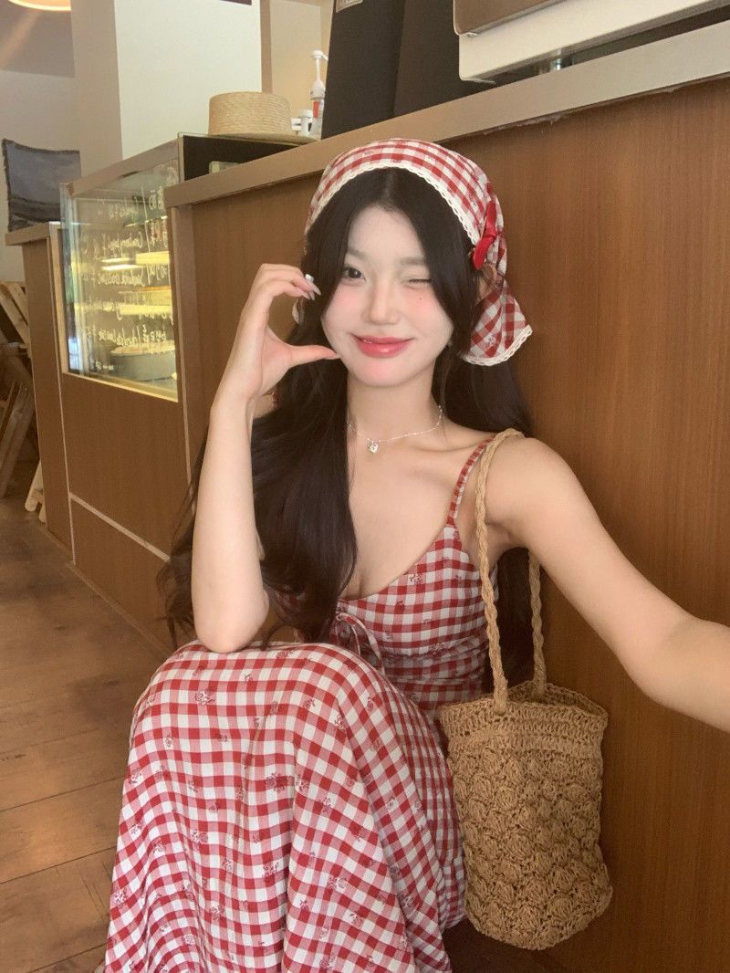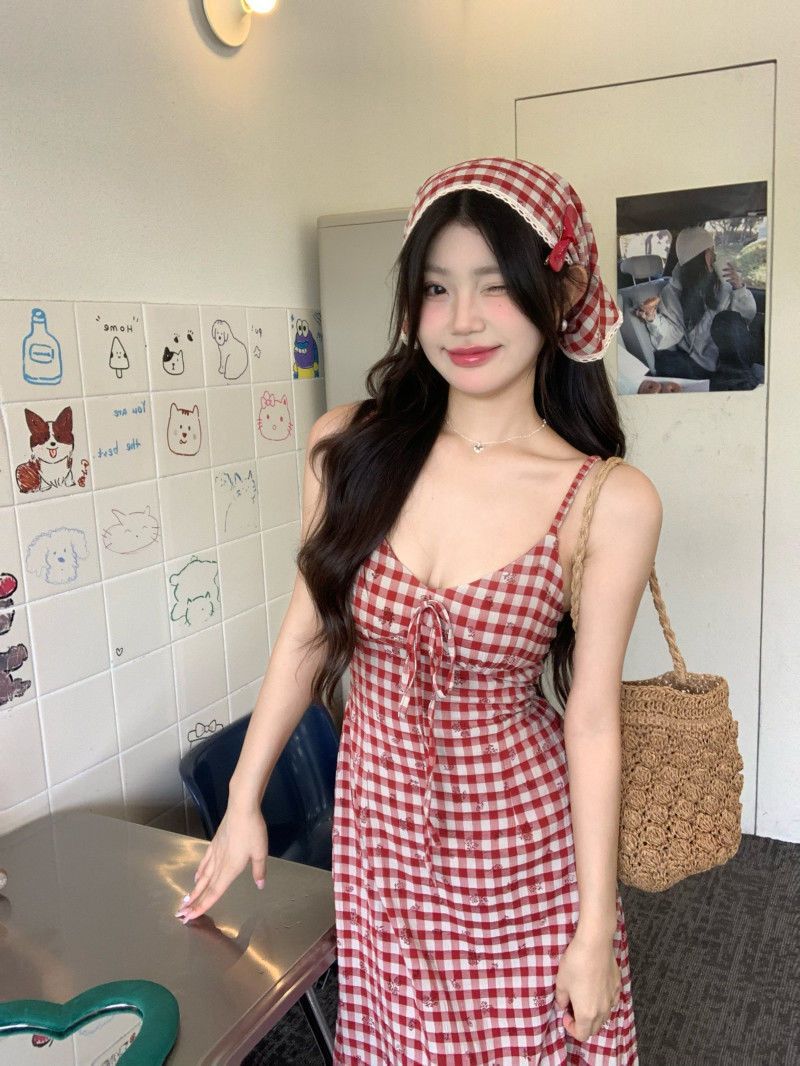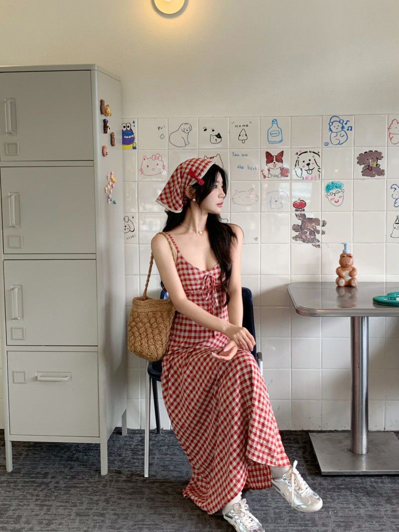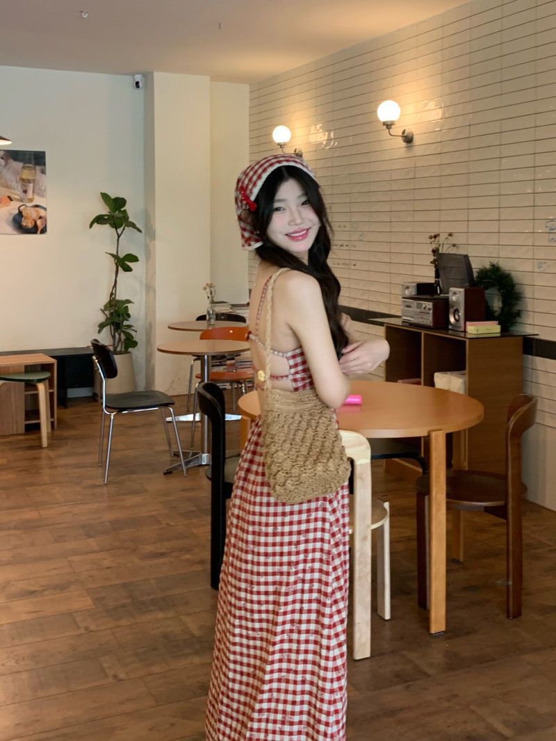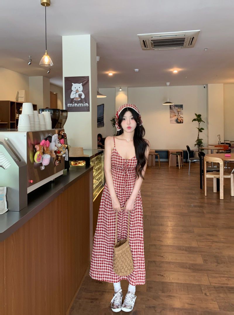 Backless Red Plaid Sling 원피스 여성 여름 새로운 도착 프랑스 목가적 인 슬림-피트 타이트 허리 슬리밍 롱 스커트스토어 가기