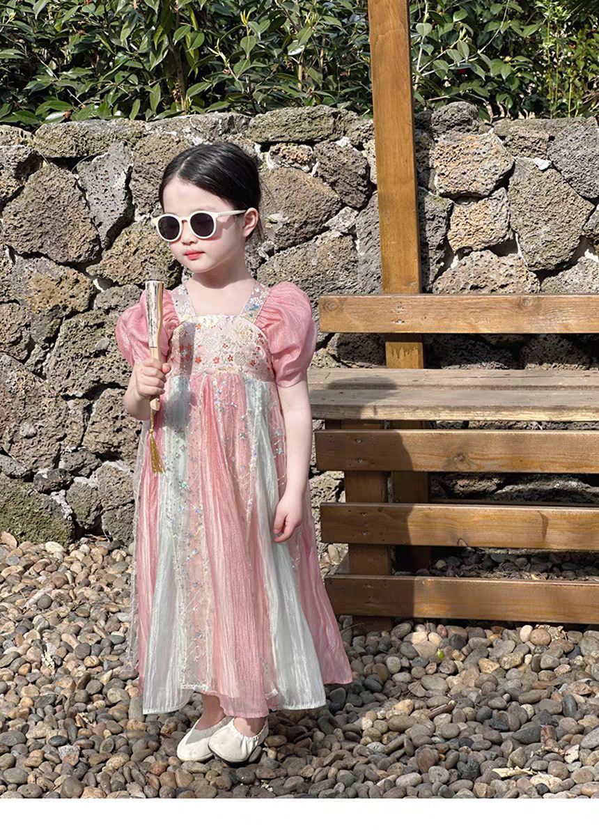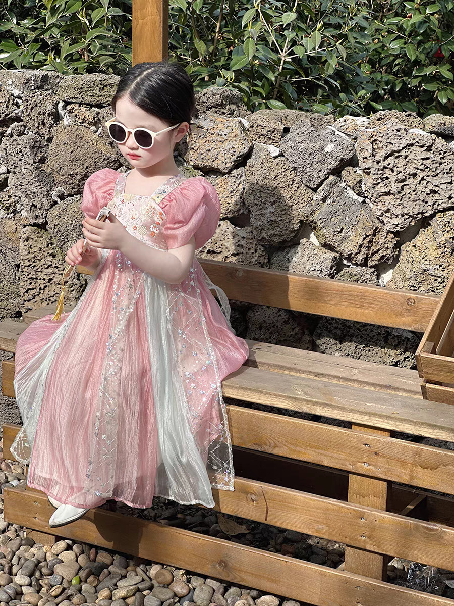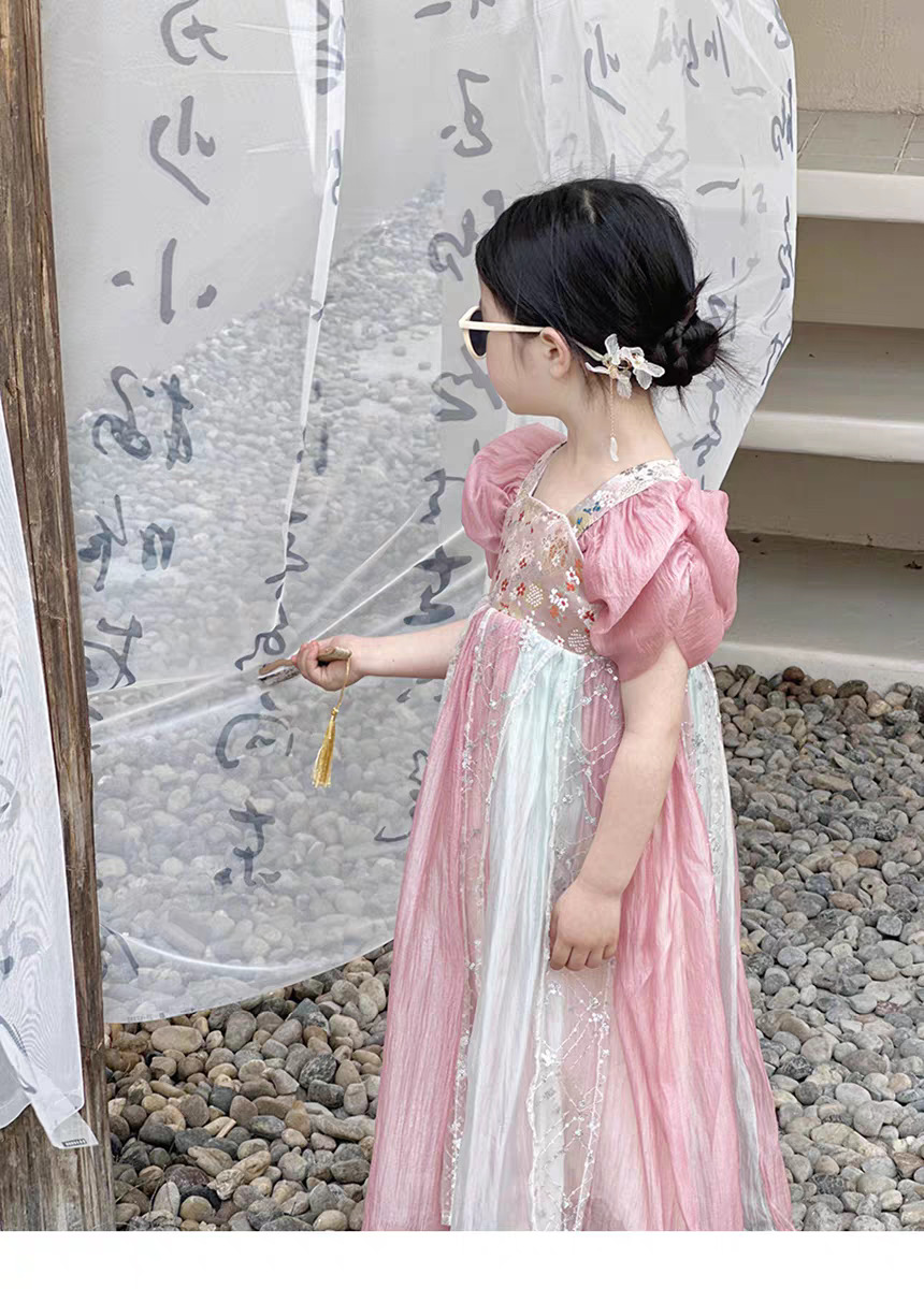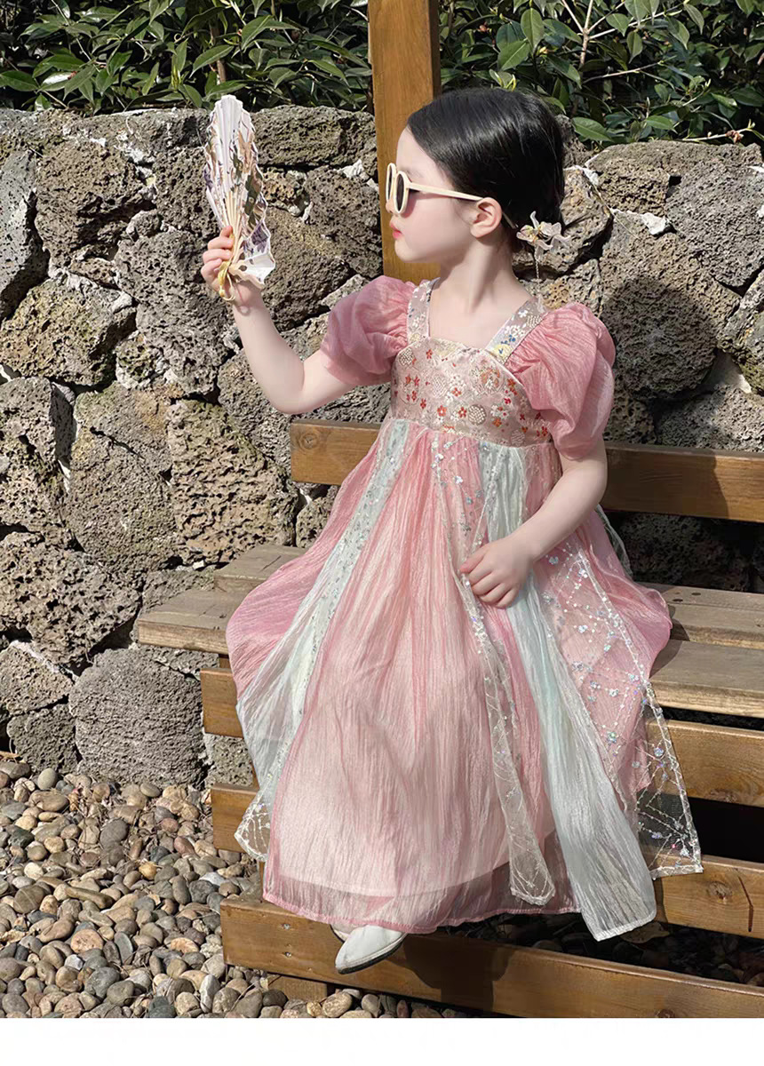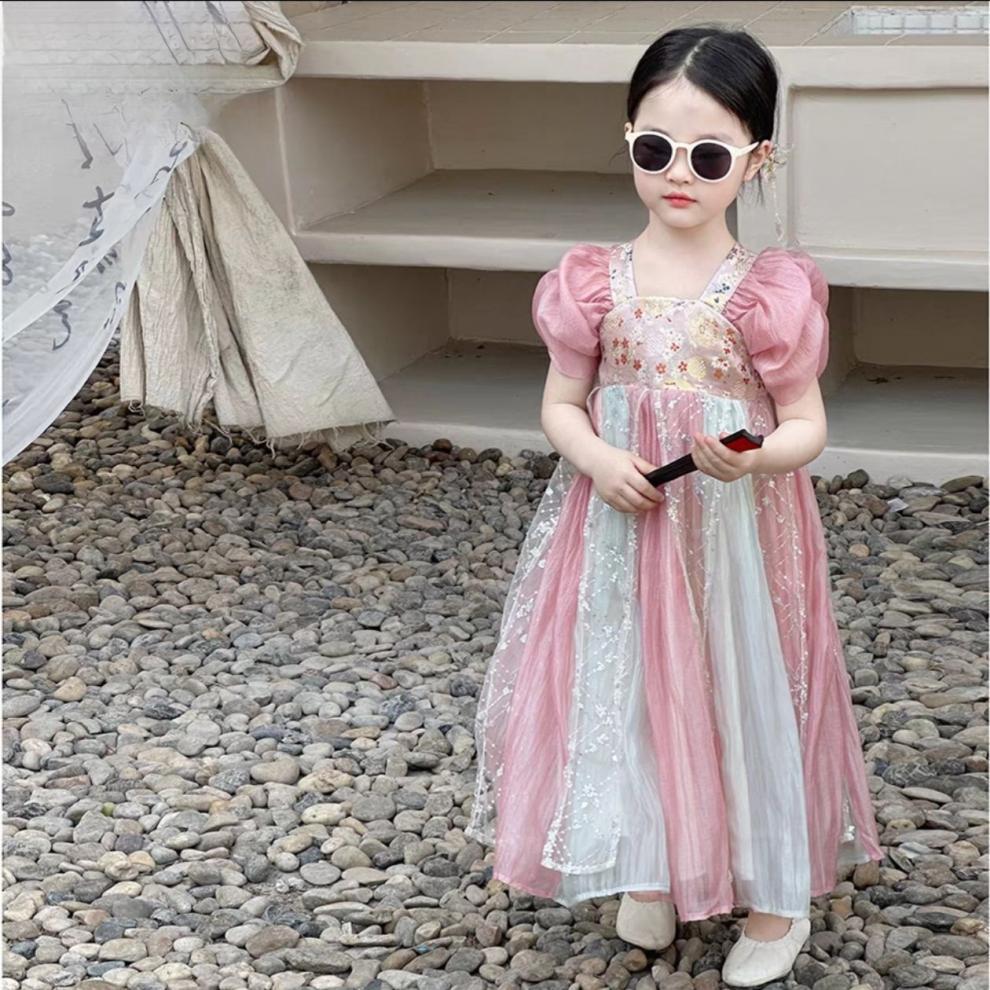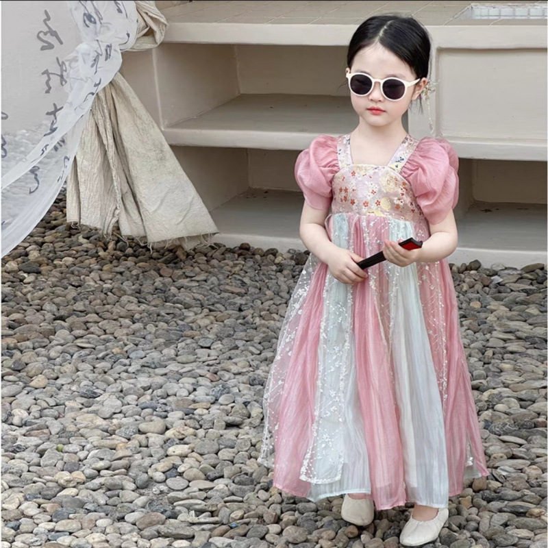 소녀의 새로운 중국 스타일 한푸 원피스 여름 새로운 어린이 메쉬 원피스 버블 슬리브 골동품 공주 원피스 원피스 긴 원피스