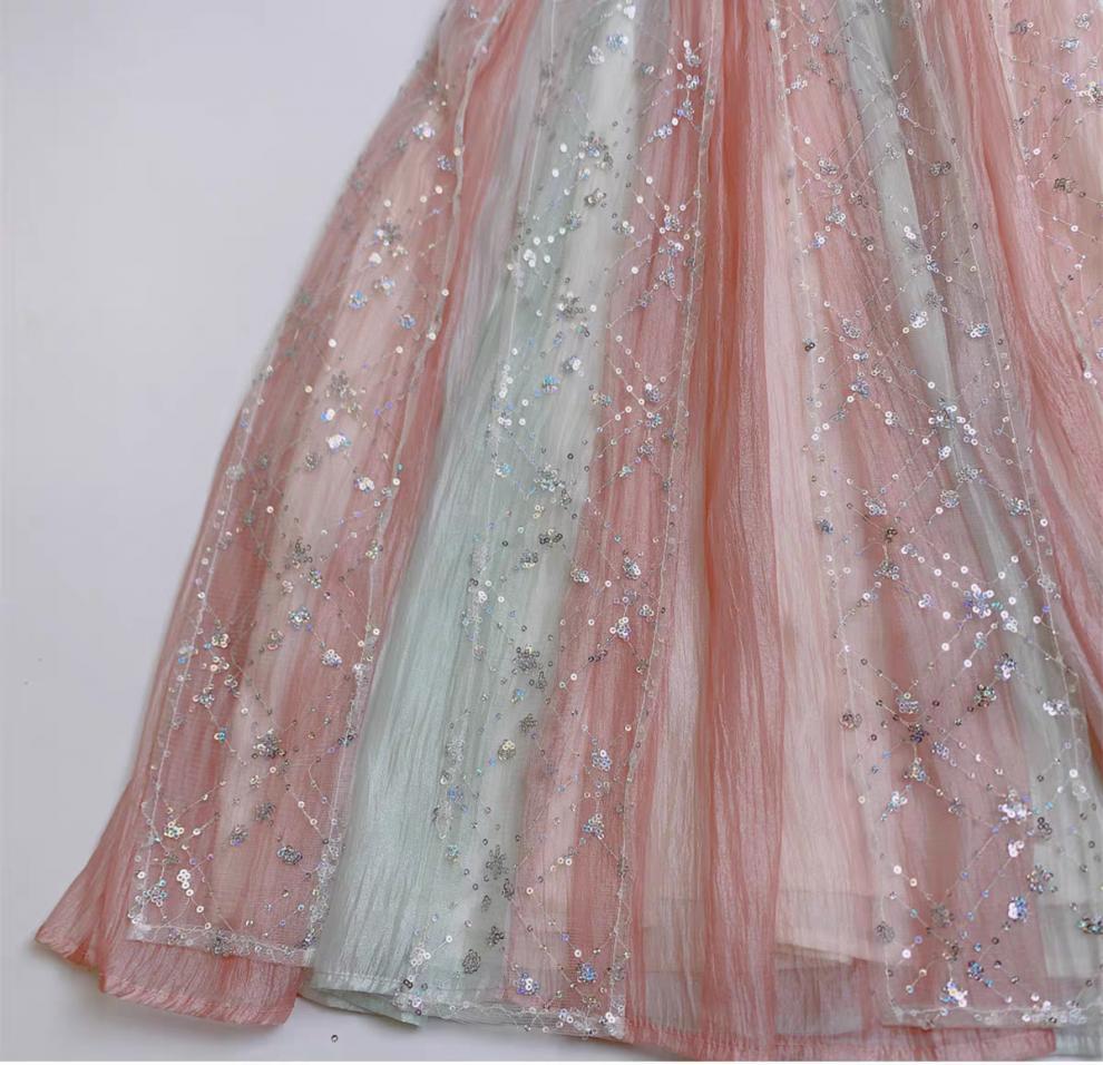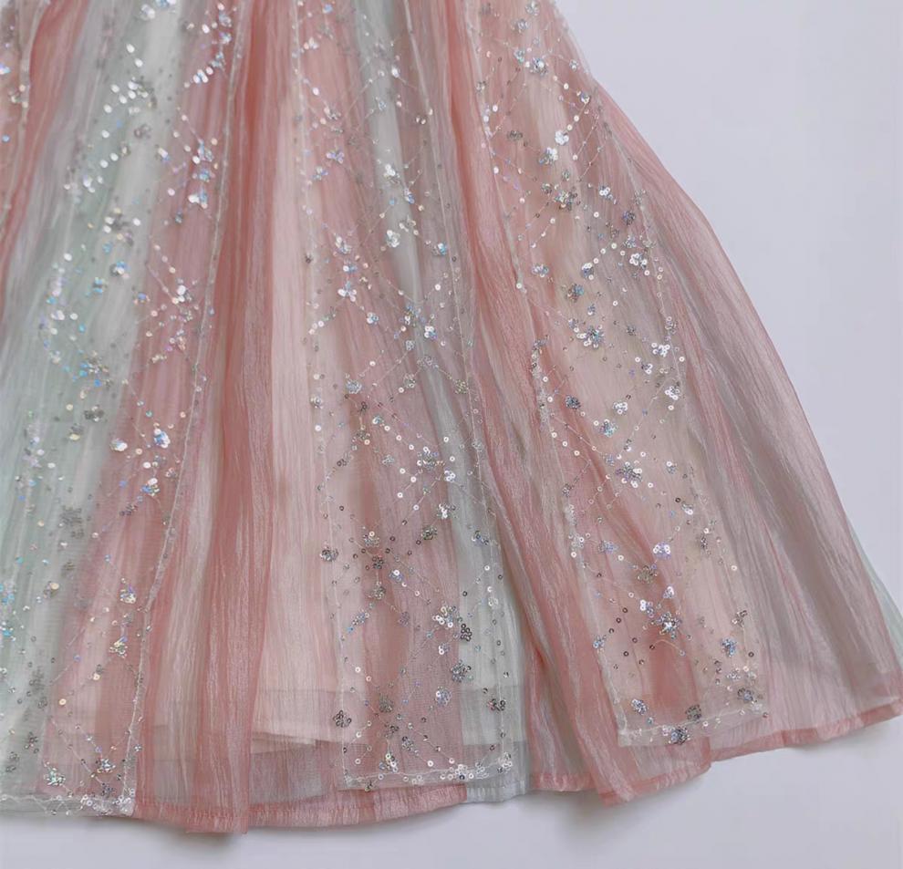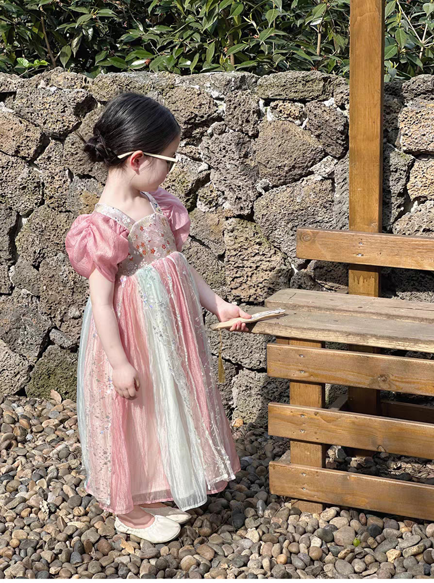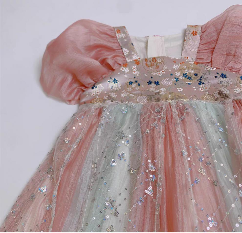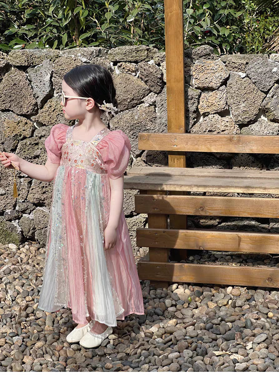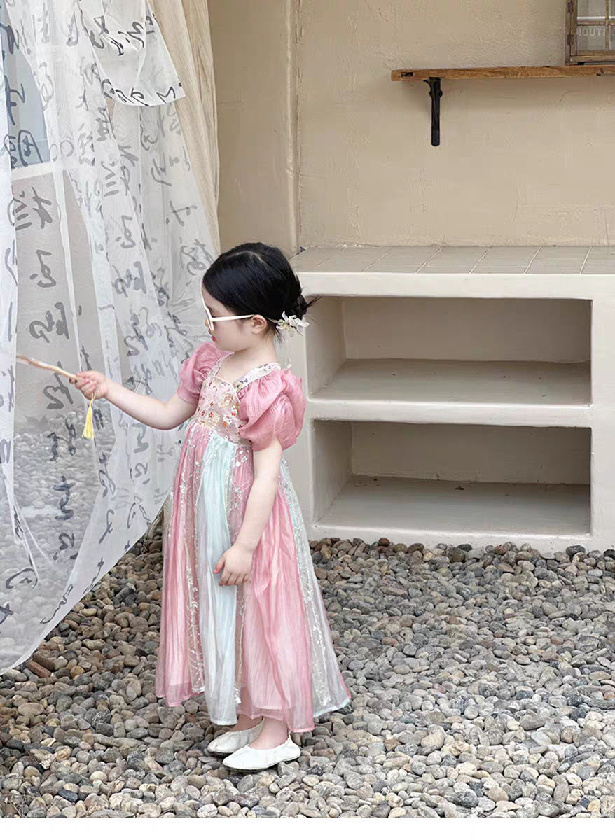 소녀의 새로운 중국 스타일 한푸 원피스 여름 새로운 어린이 메쉬 원피스 버블 슬리브 골동품 공주 원피스 원피스 긴 원피스