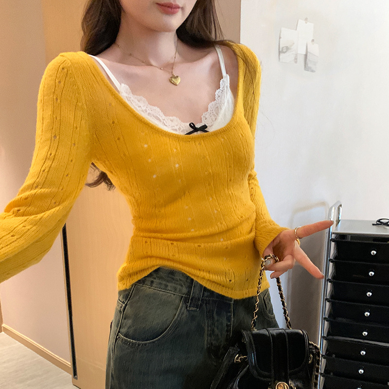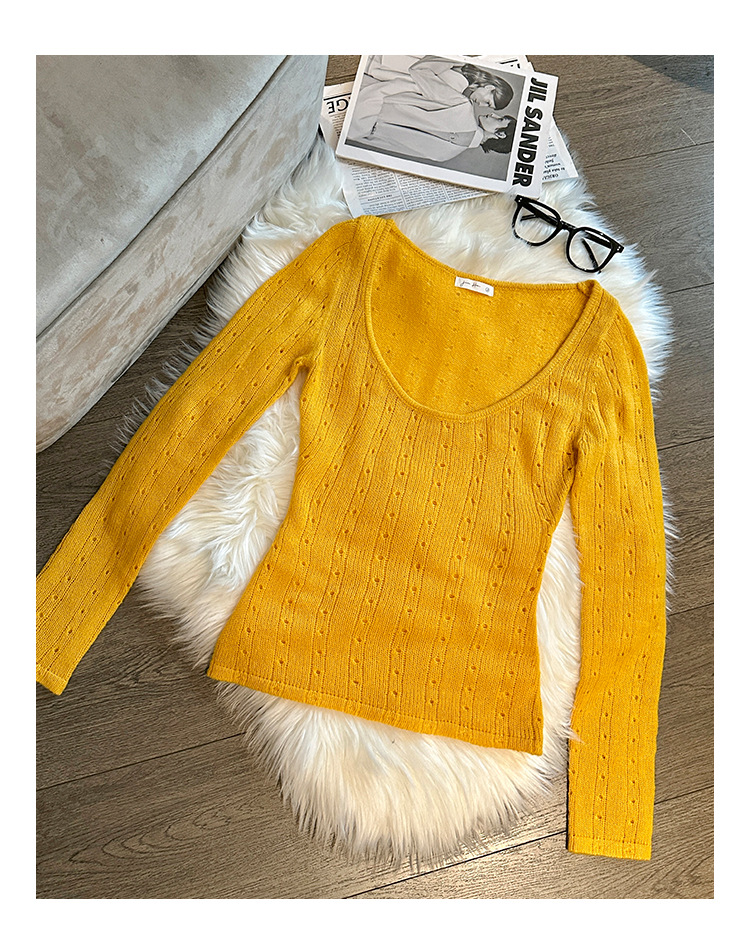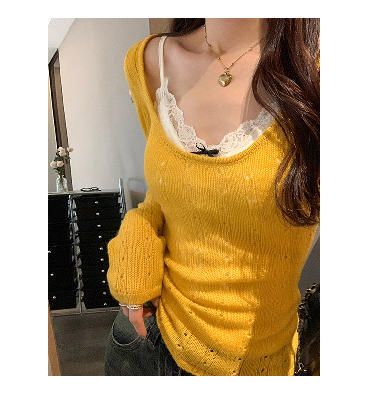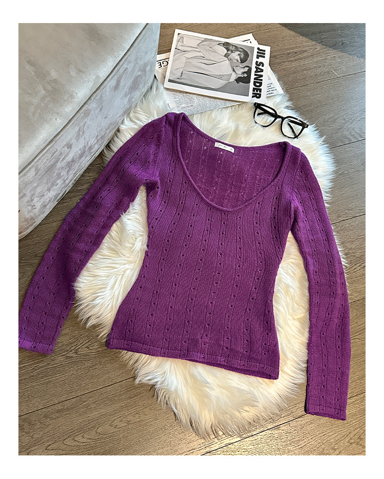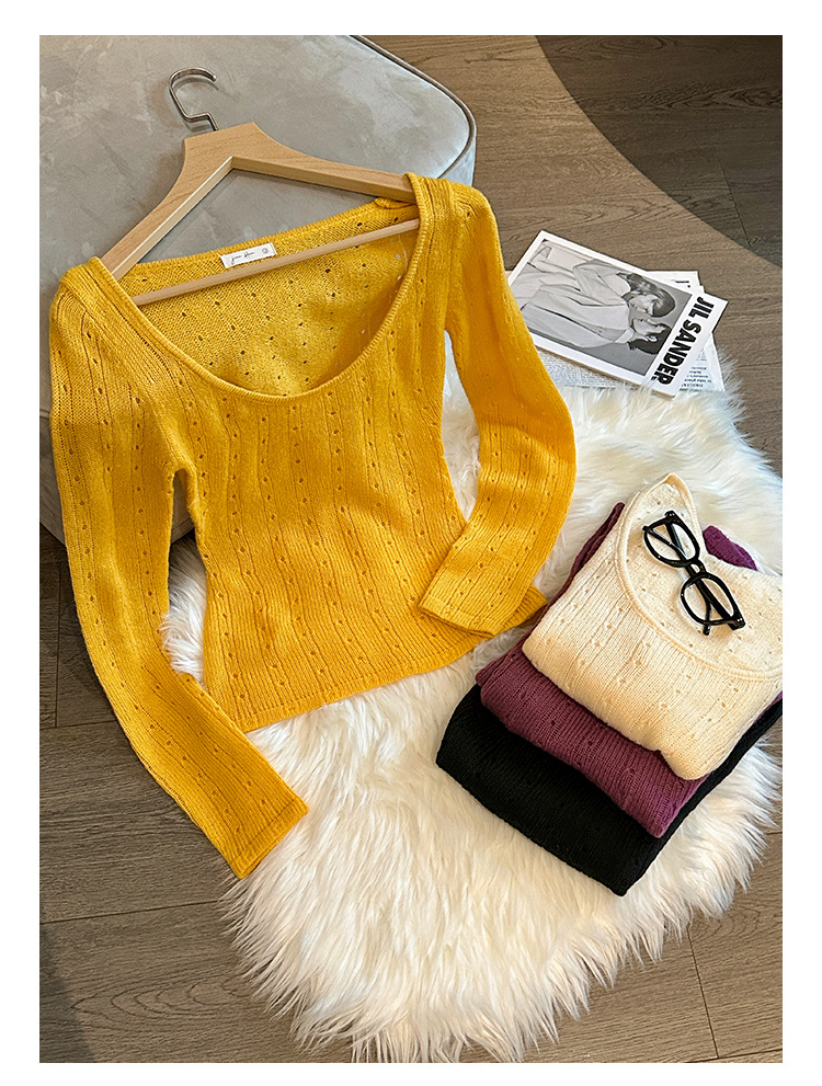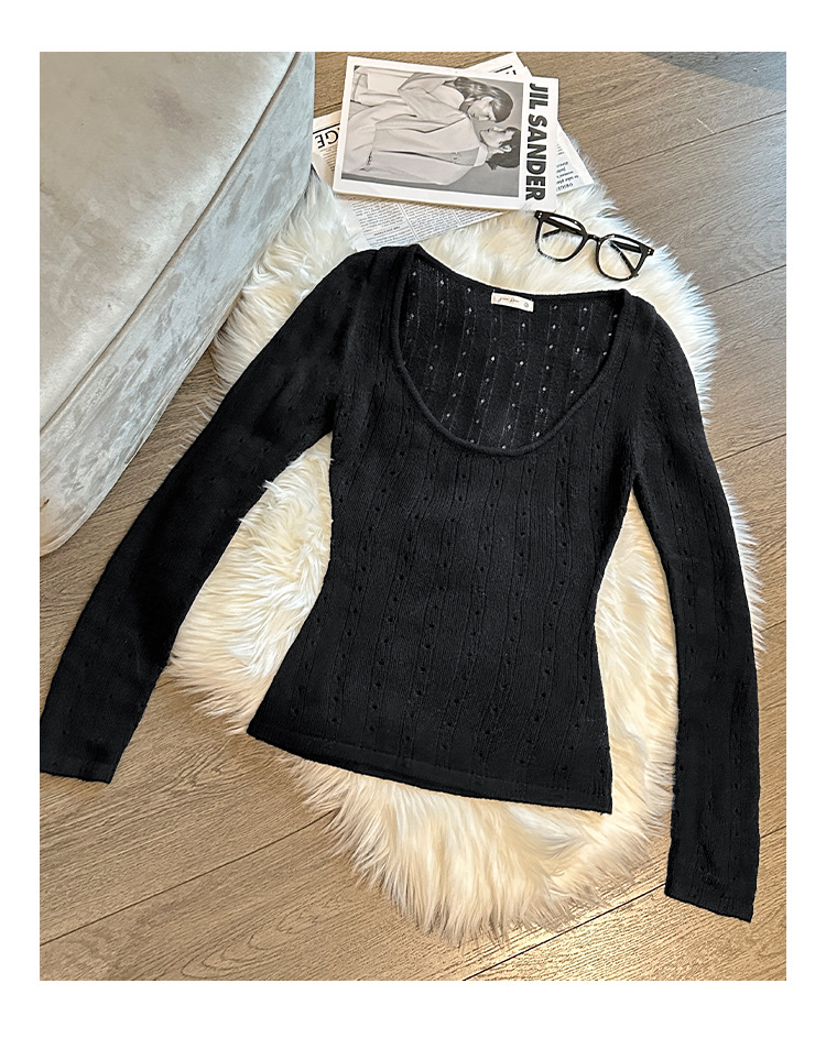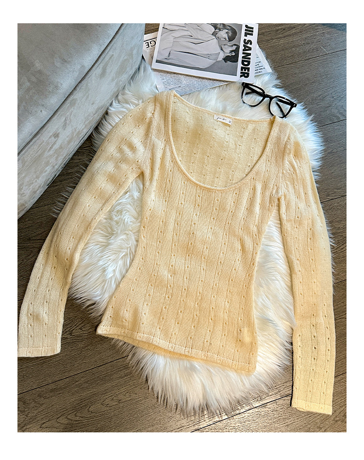 2025 봄 새로운 낮은 칼라 중공 긴 소매 양모 스웨터 여성의 순수한 섹시한 소녀 슈퍼 잘 생긴 기질 탑