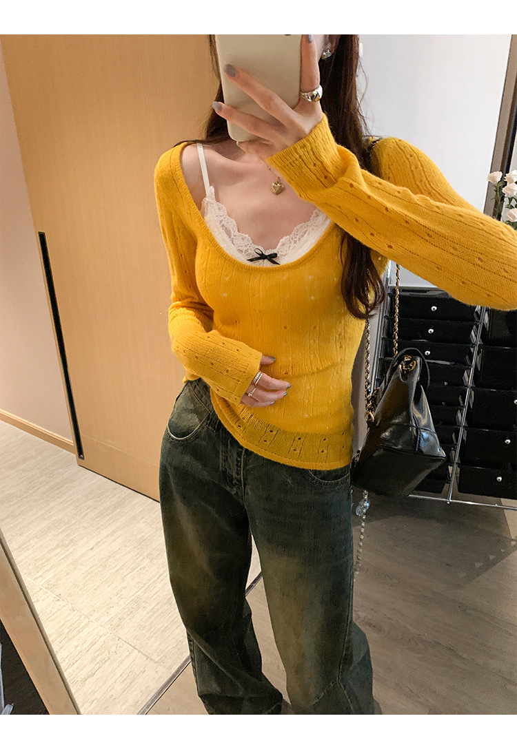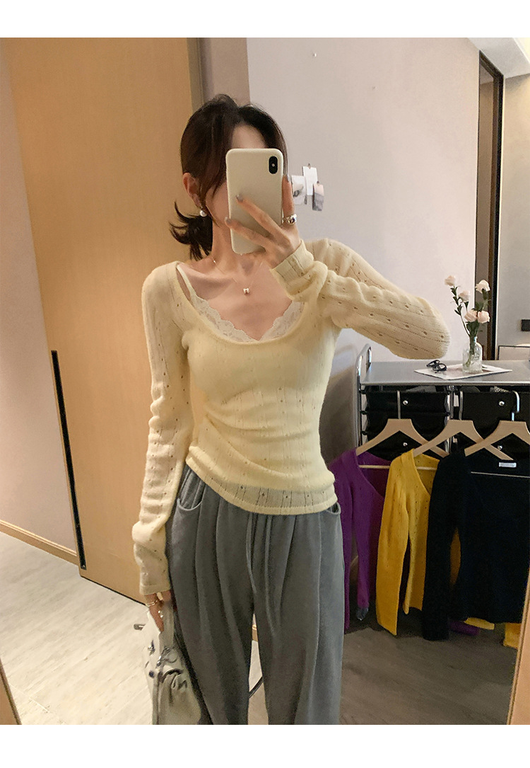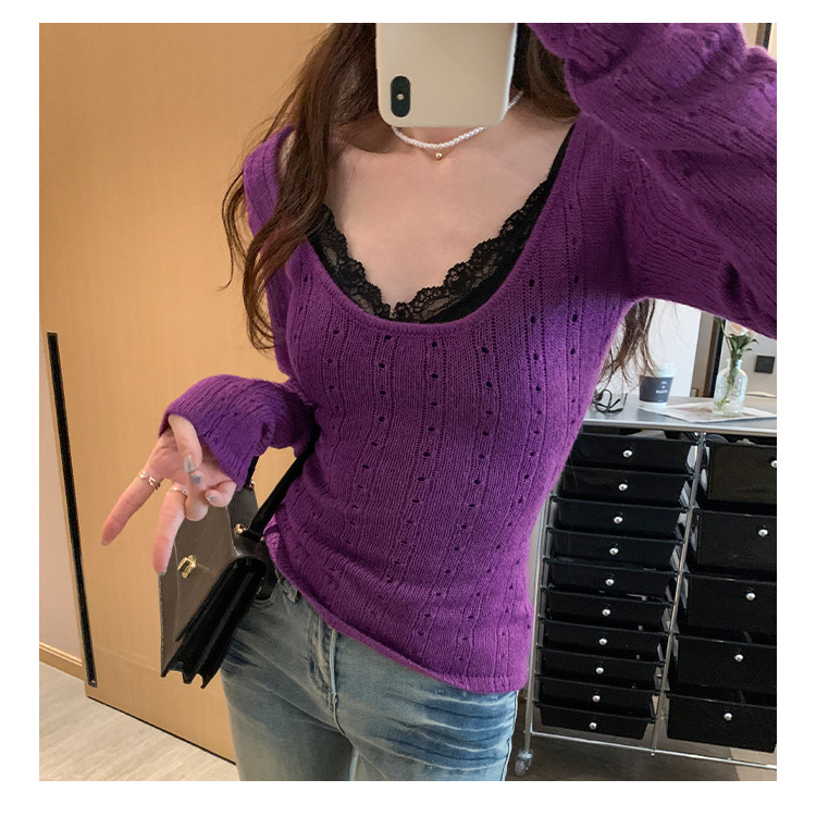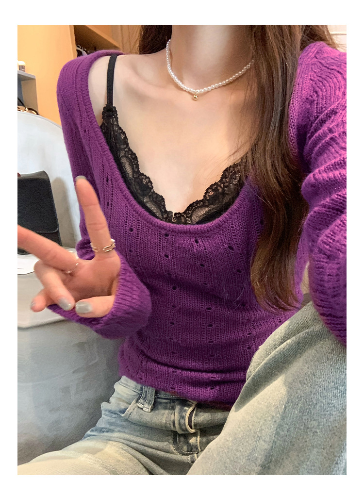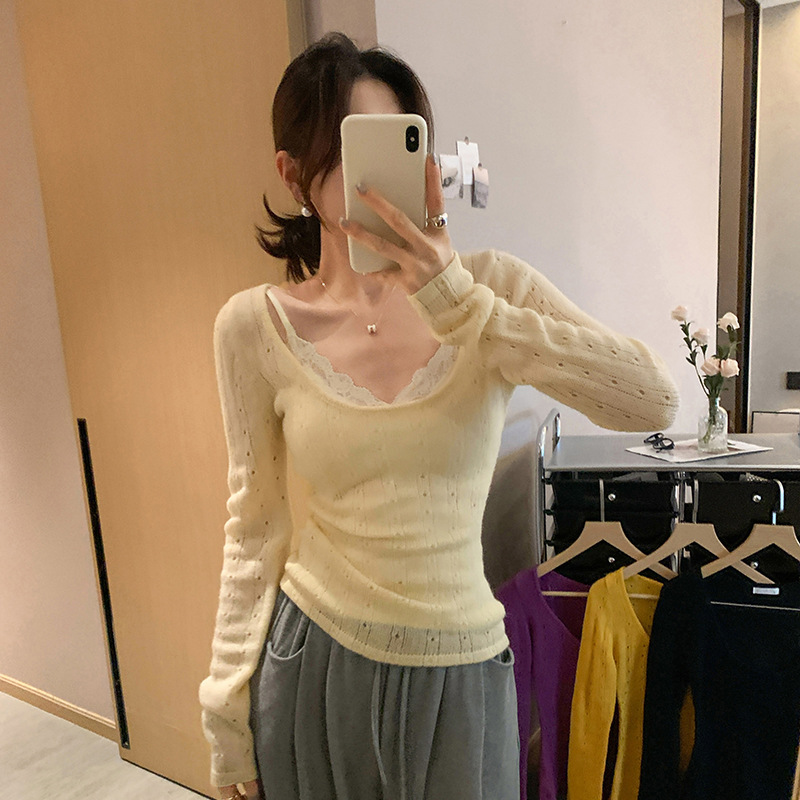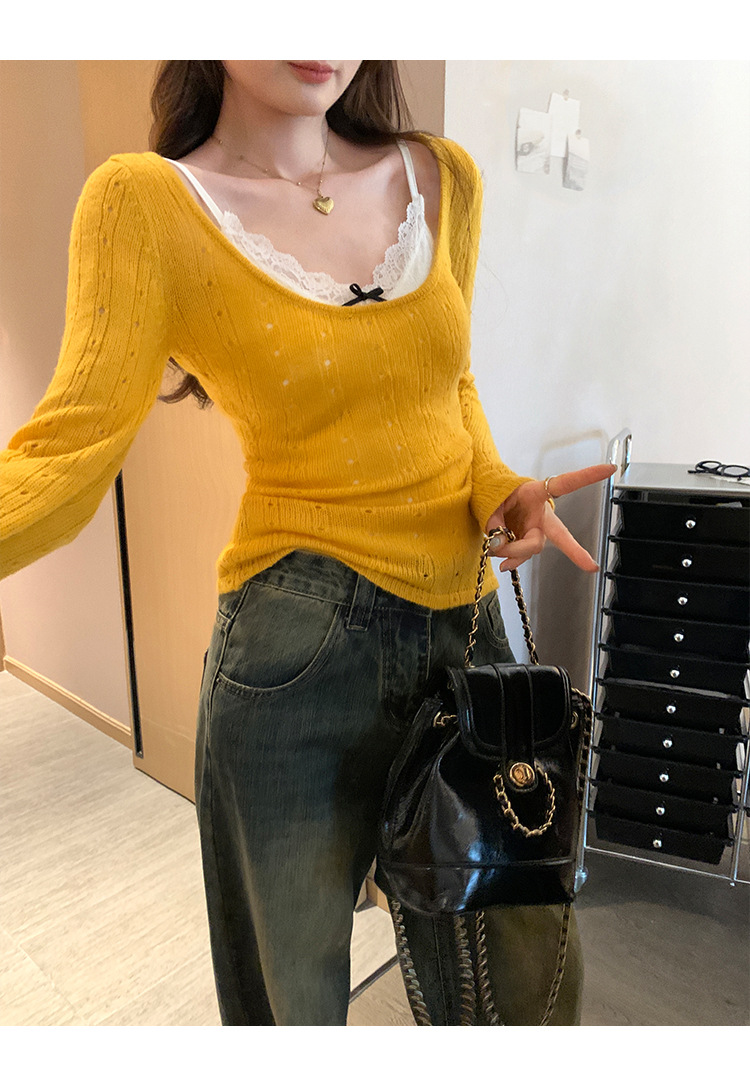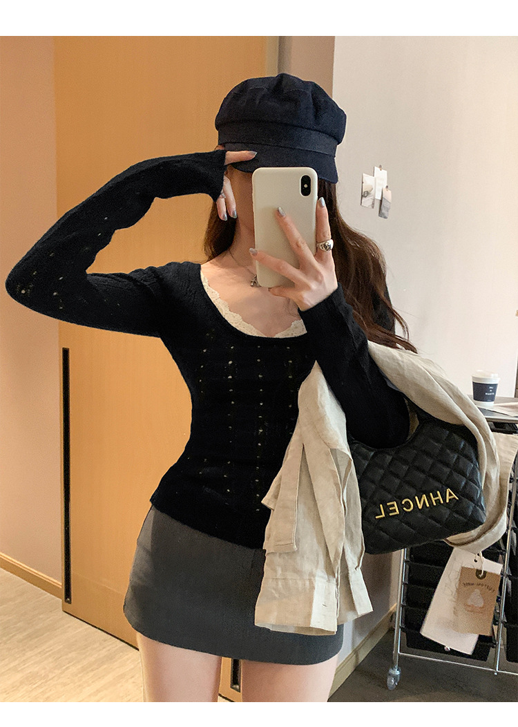 2025 봄 새로운 낮은 칼라 중공 긴 소매 양모 스웨터 여성의 순수한 섹시한 소녀 슈퍼 잘 생긴 기질 탑