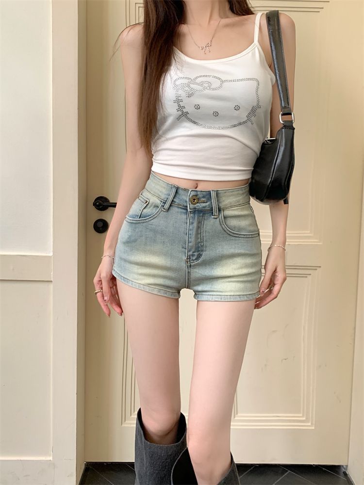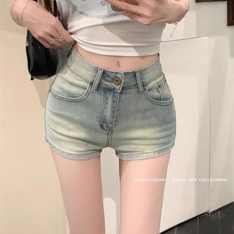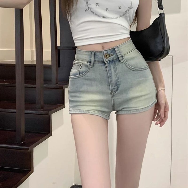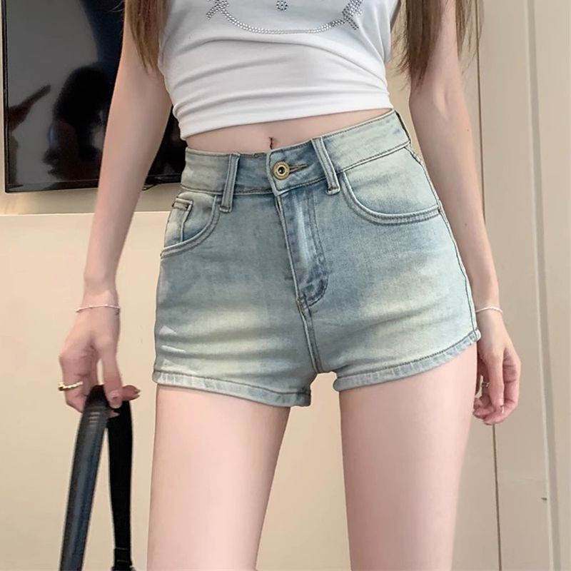올드 라이트 컬러 데님 반바지 여성 여름 레트로 높은 허리 캐주얼 스트레이트 바지 스파이스 걸스 슈퍼 슬림 슬림 핏 핫 팬츠스토어 가기