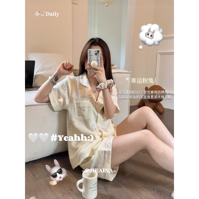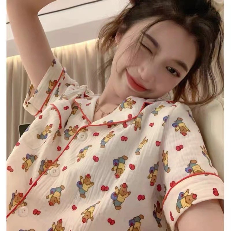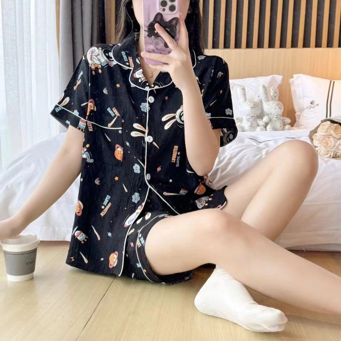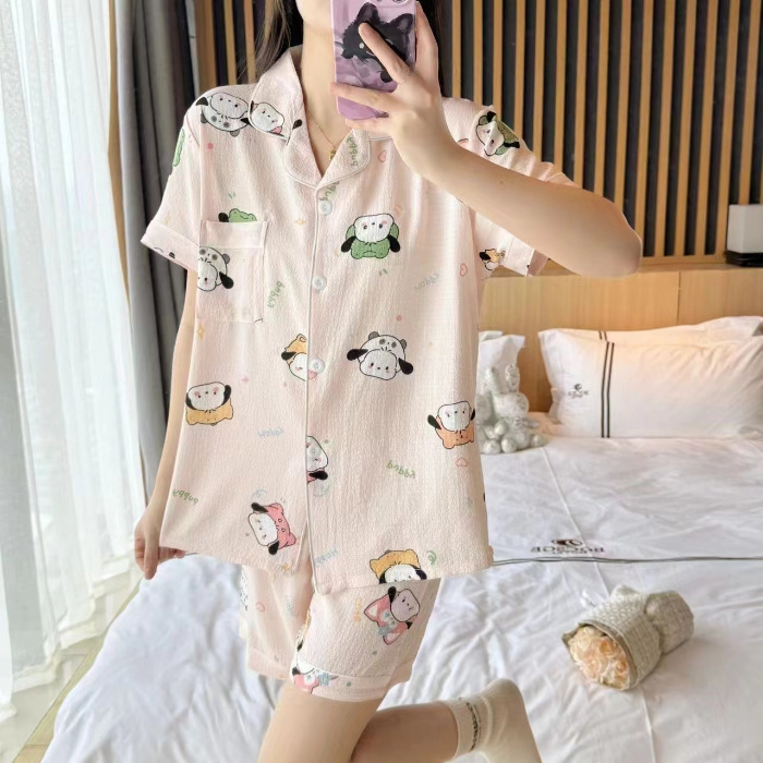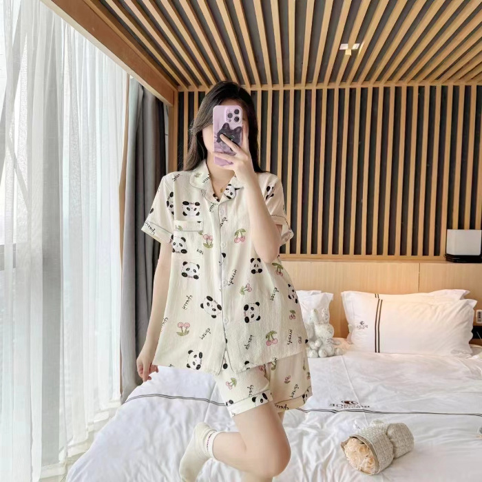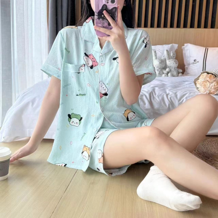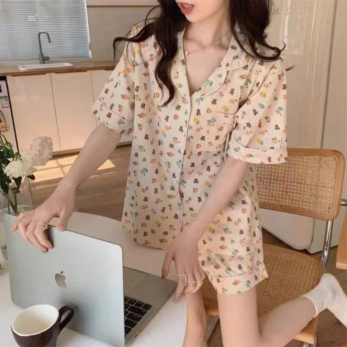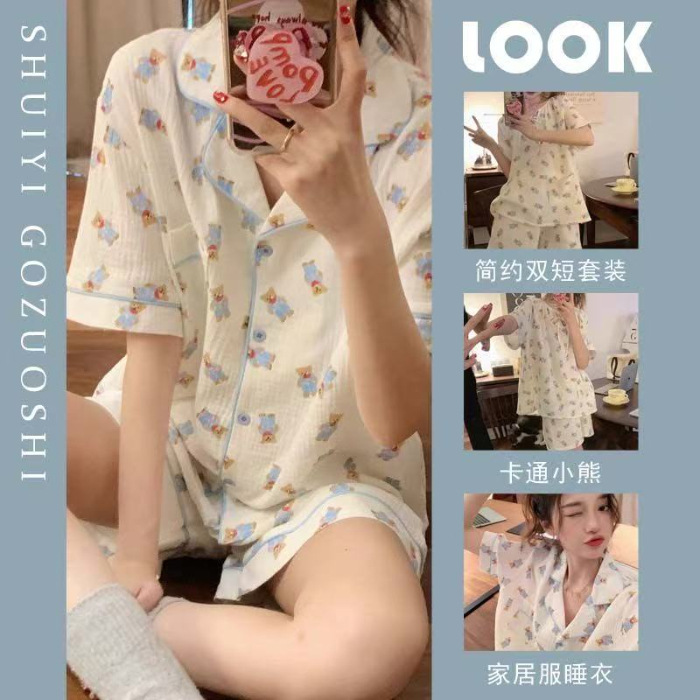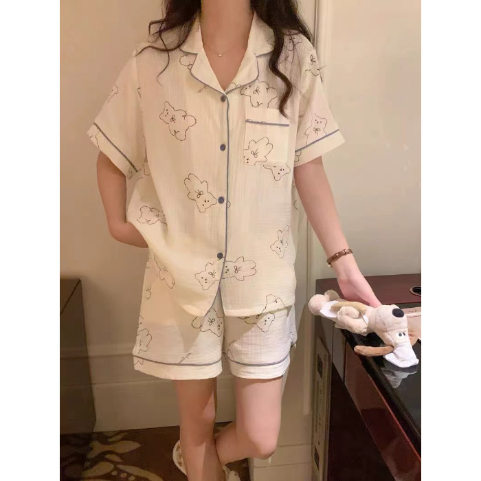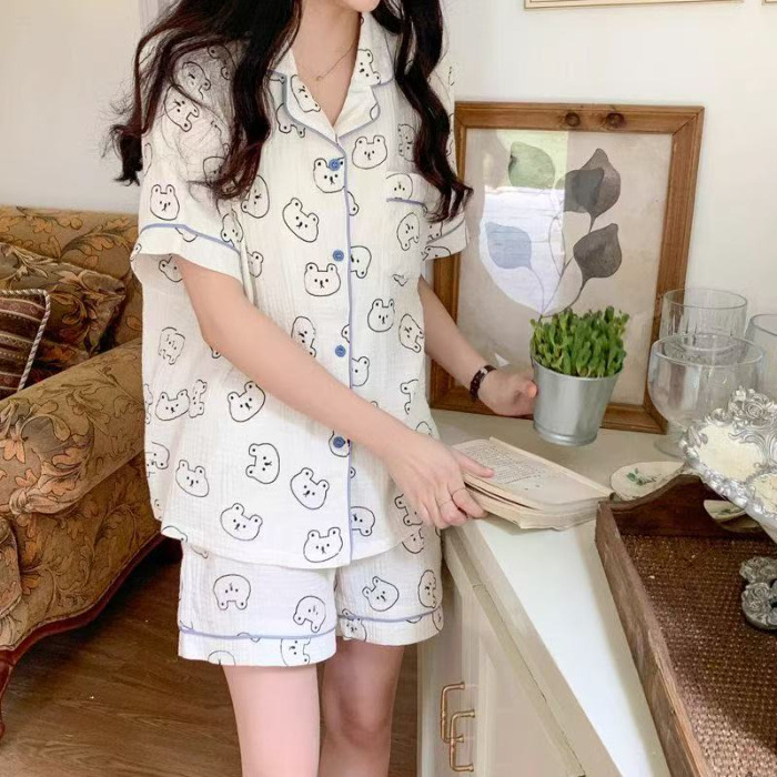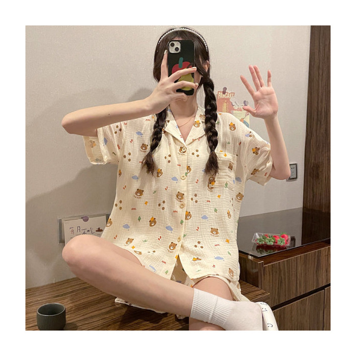 라이브 팩 폭발 짧은 소매 반바지 버블 코튼 파자마 여성 카디건 만화 귀여운 학생 홈 옷스토어 가기