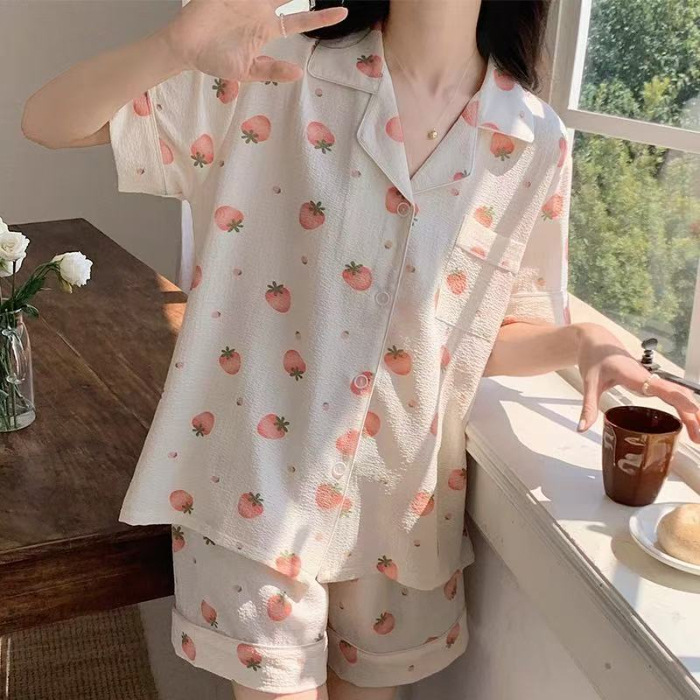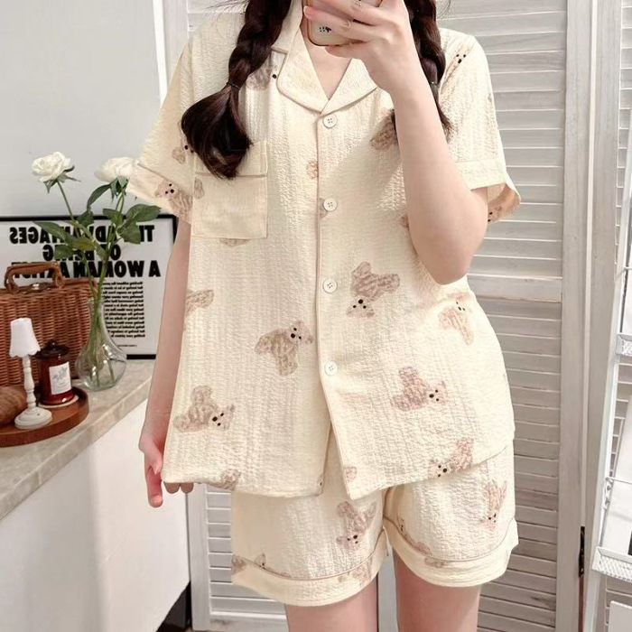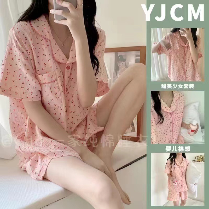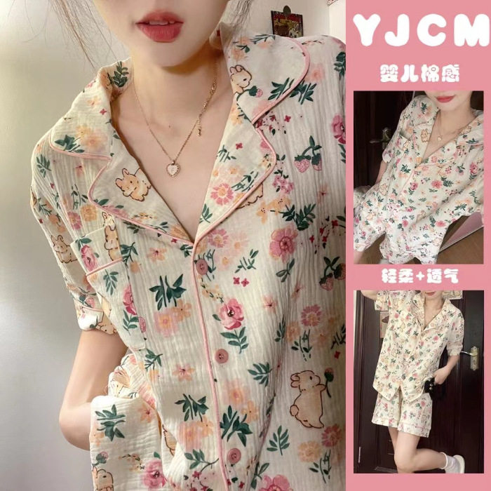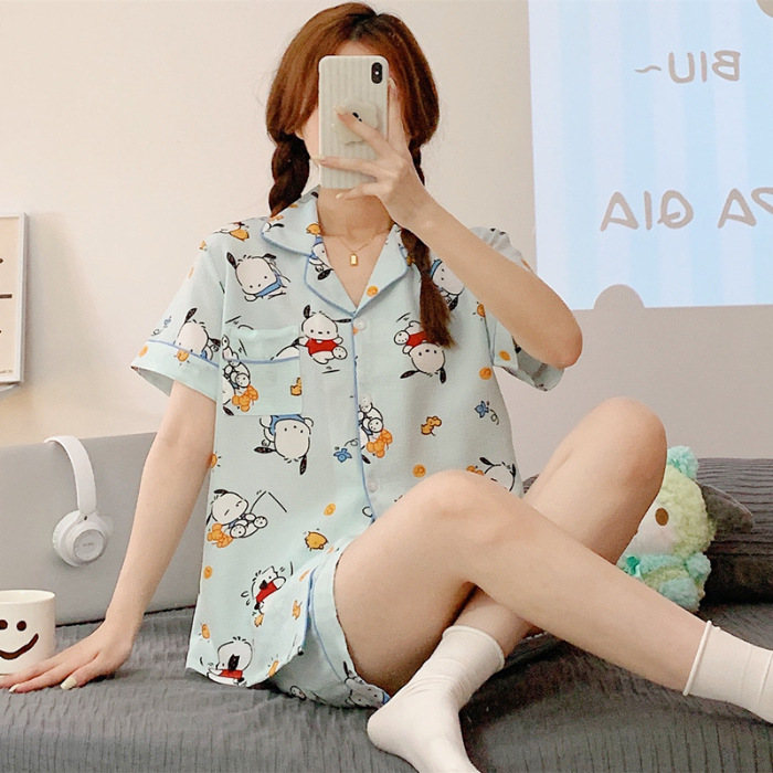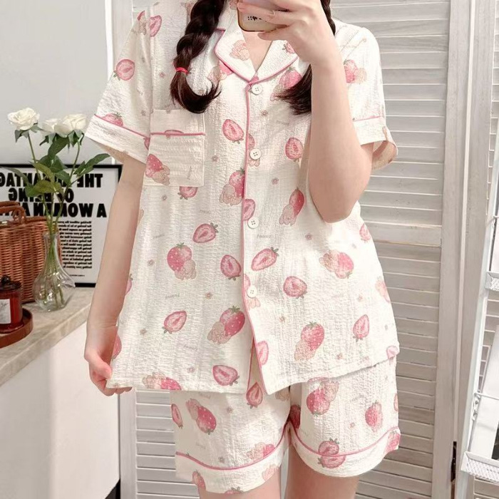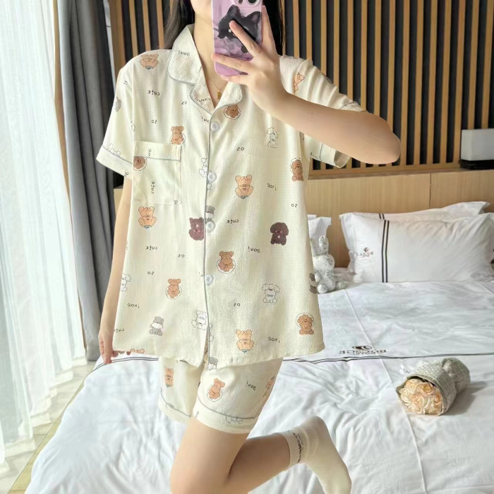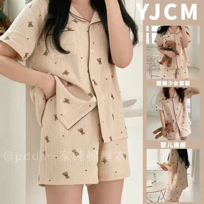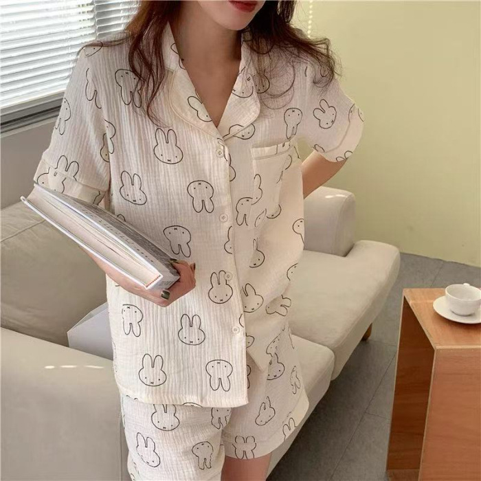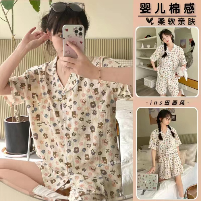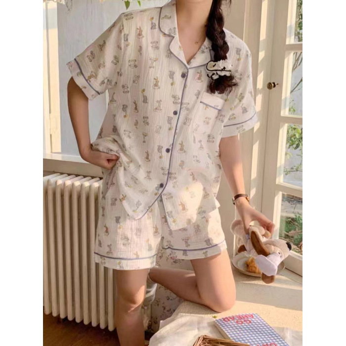 라이브 팩 폭발 짧은 소매 반바지 버블 코튼 파자마 여성 카디건 만화 귀여운 학생 홈 옷스토어 가기