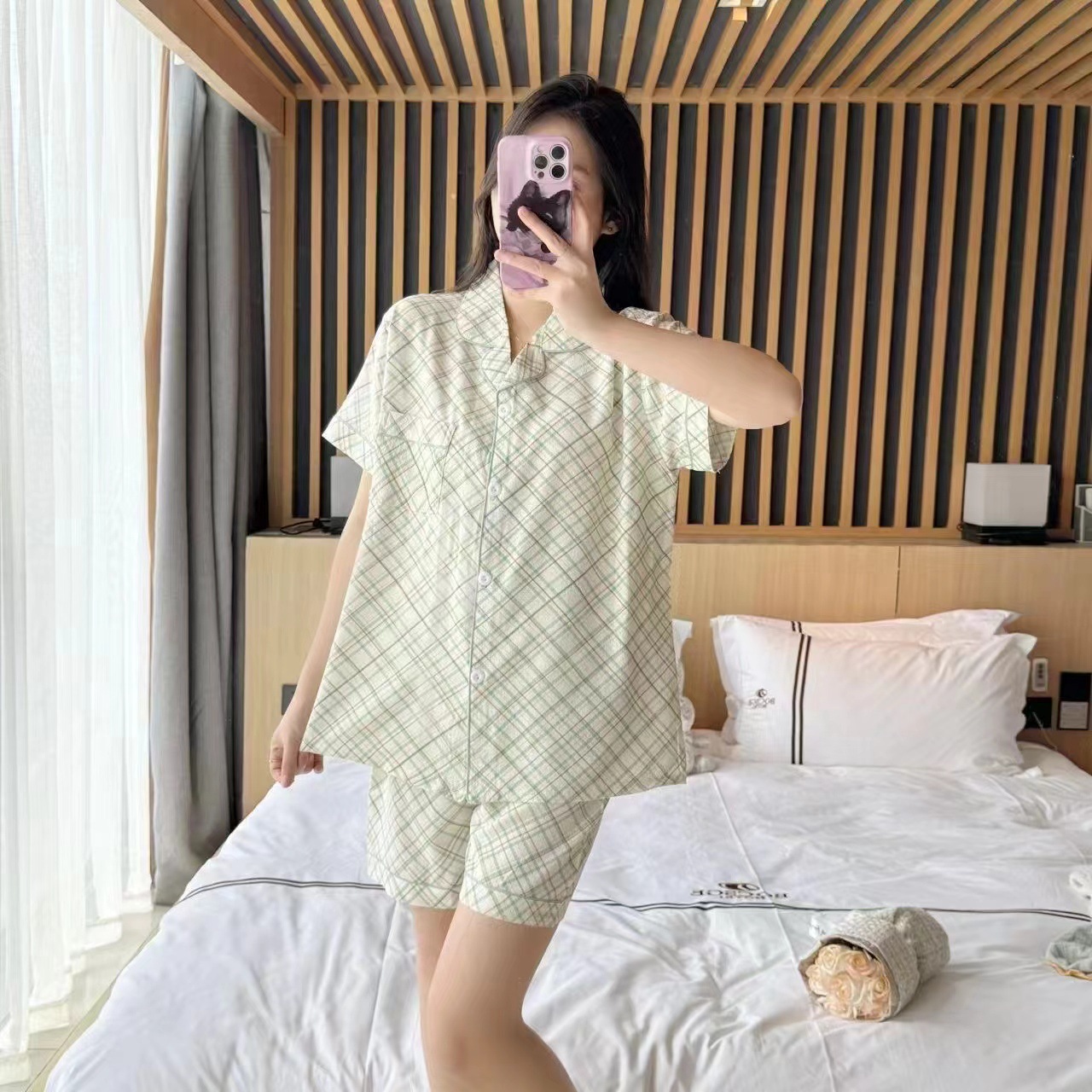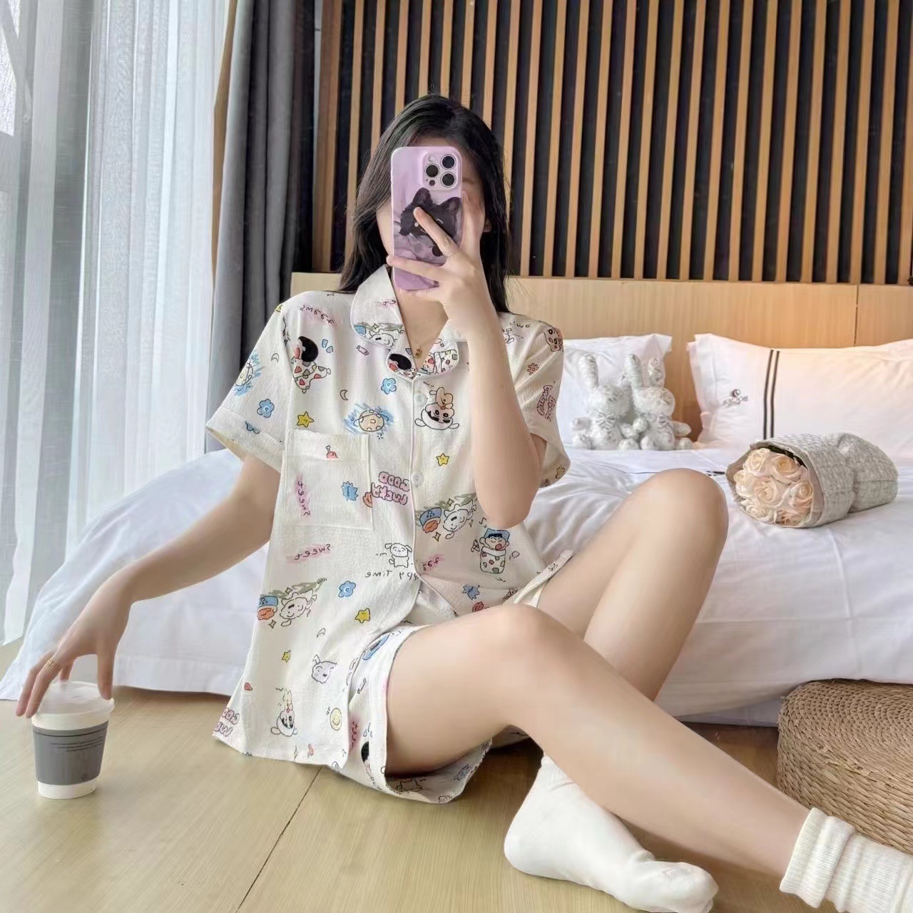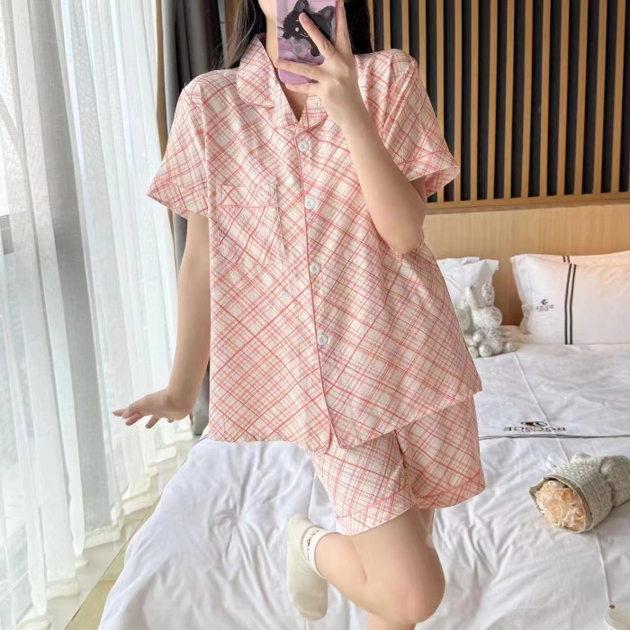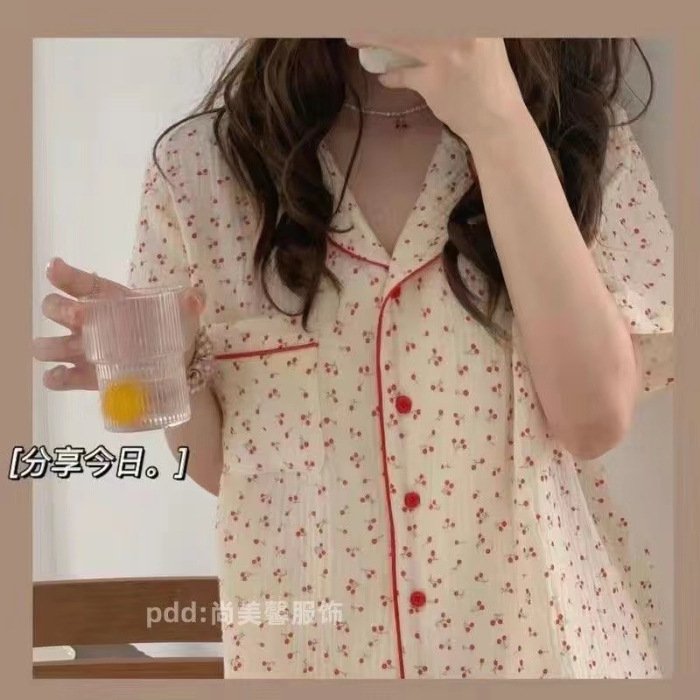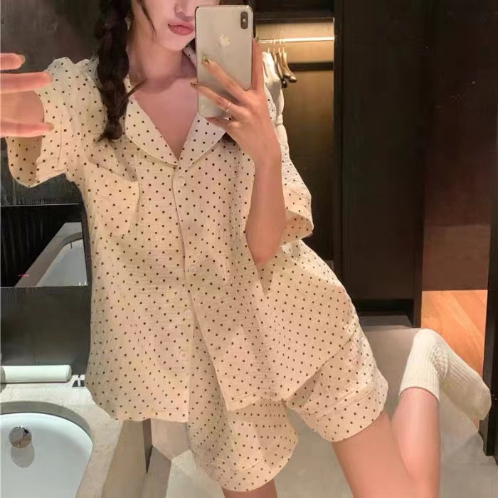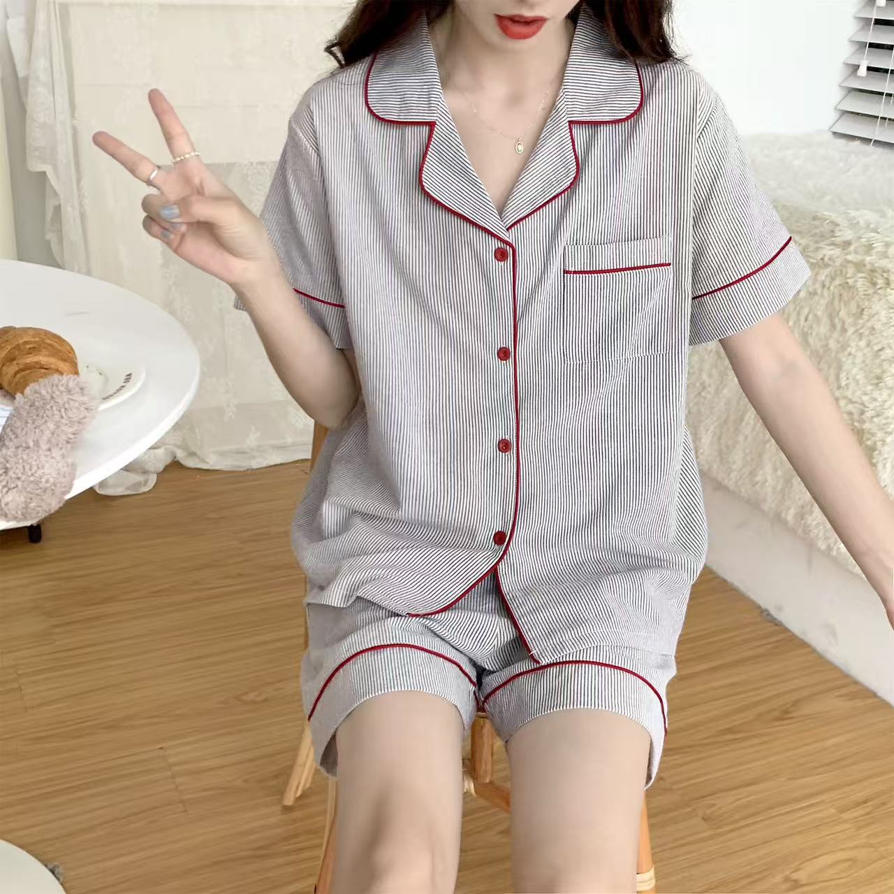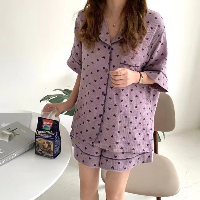 라이브 팩 폭발 짧은 소매 반바지 버블 코튼 파자마 여성 카디건 만화 귀여운 학생 홈 옷스토어 가기