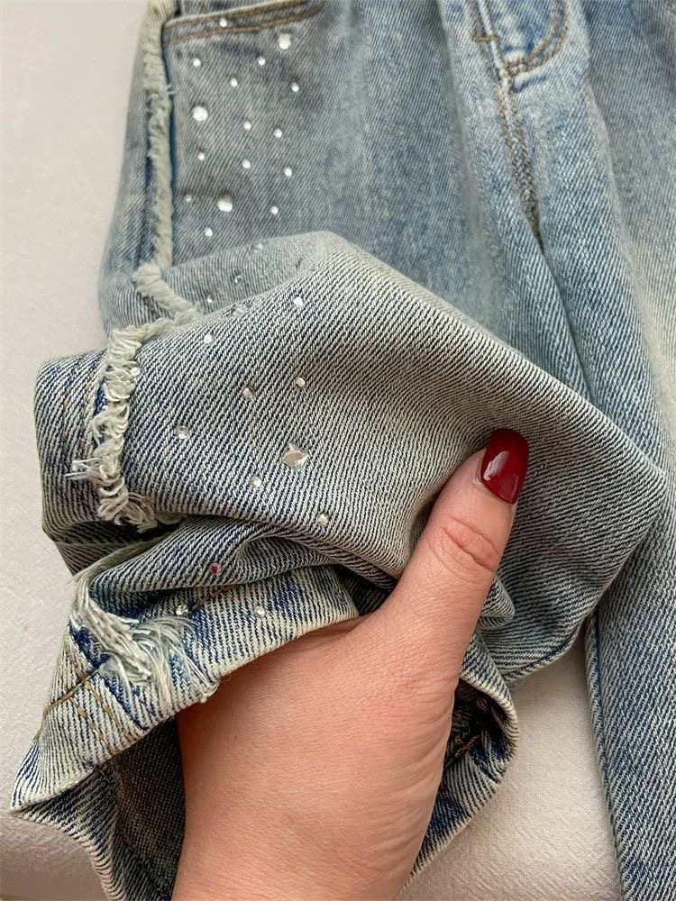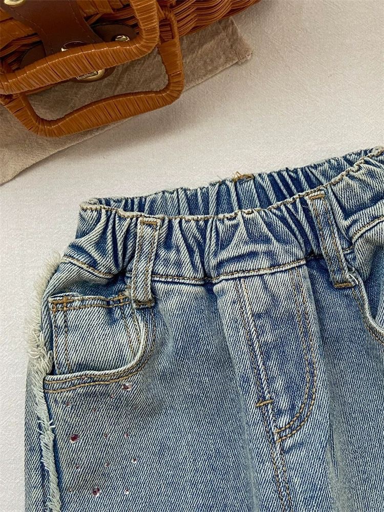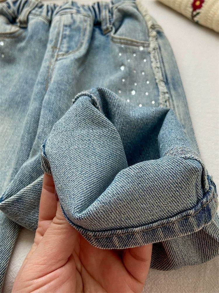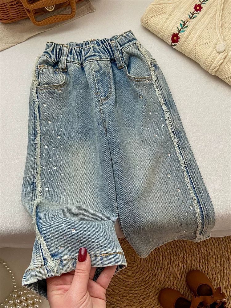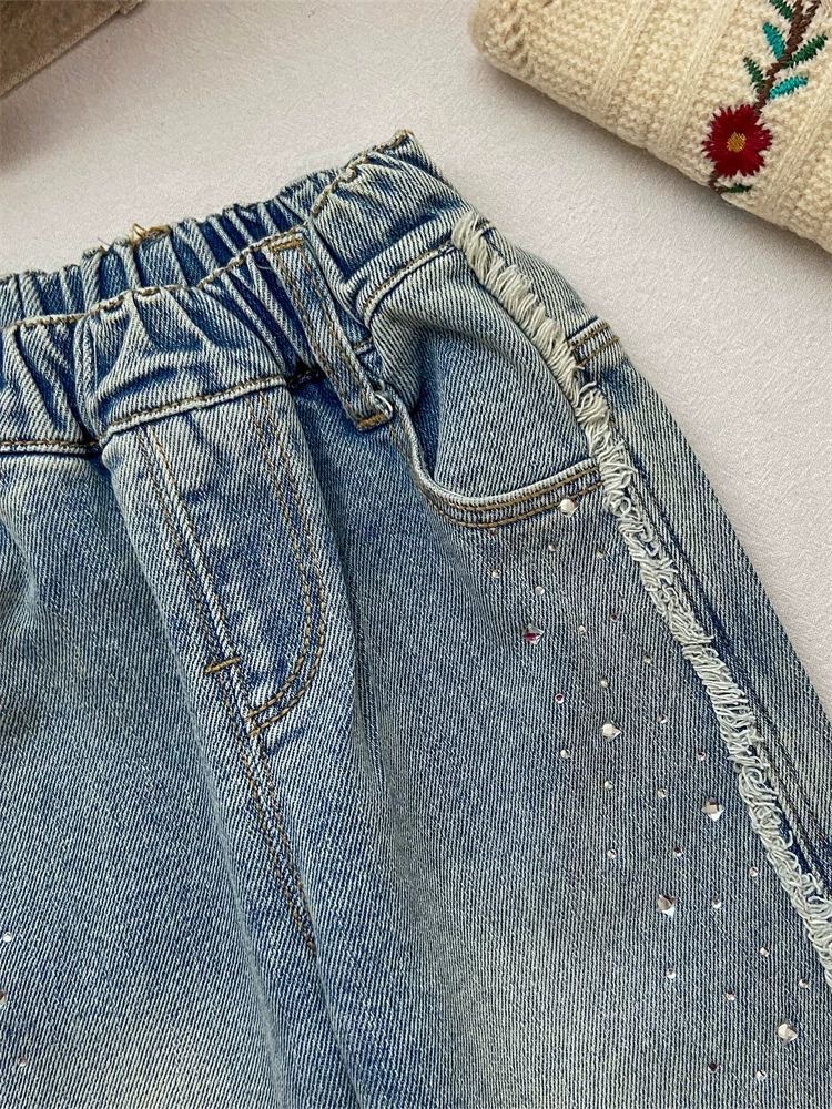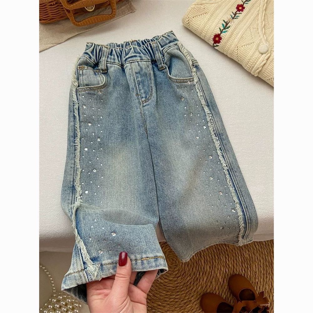소녀 청바지 봄 넓은 다리 바지 어린이 서양 스타일 세련된 절묘한 핫 드릴링 밝은 플래시 긴 바지 유행 스트레이트 바지스토어 가기