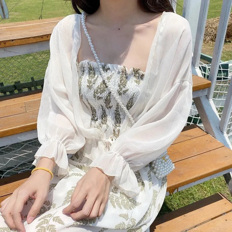 러플 레이스 업 쇼트 선 스크린 의류 여성용 느슨한 시폰 카디건 랜턴 긴 소매 아우터 숄, 스트랩 스커트