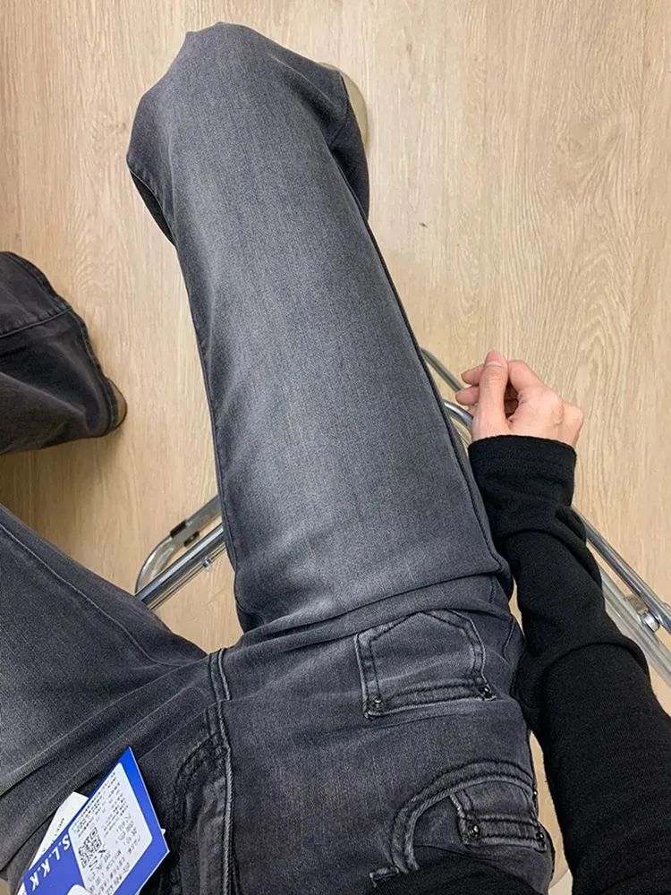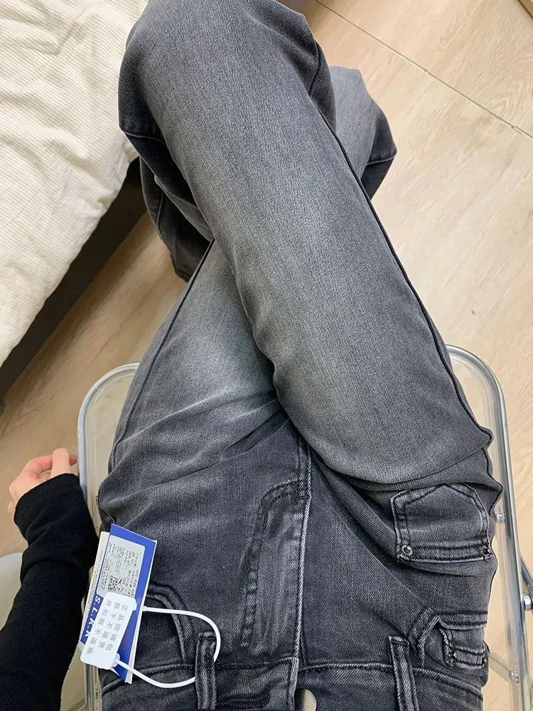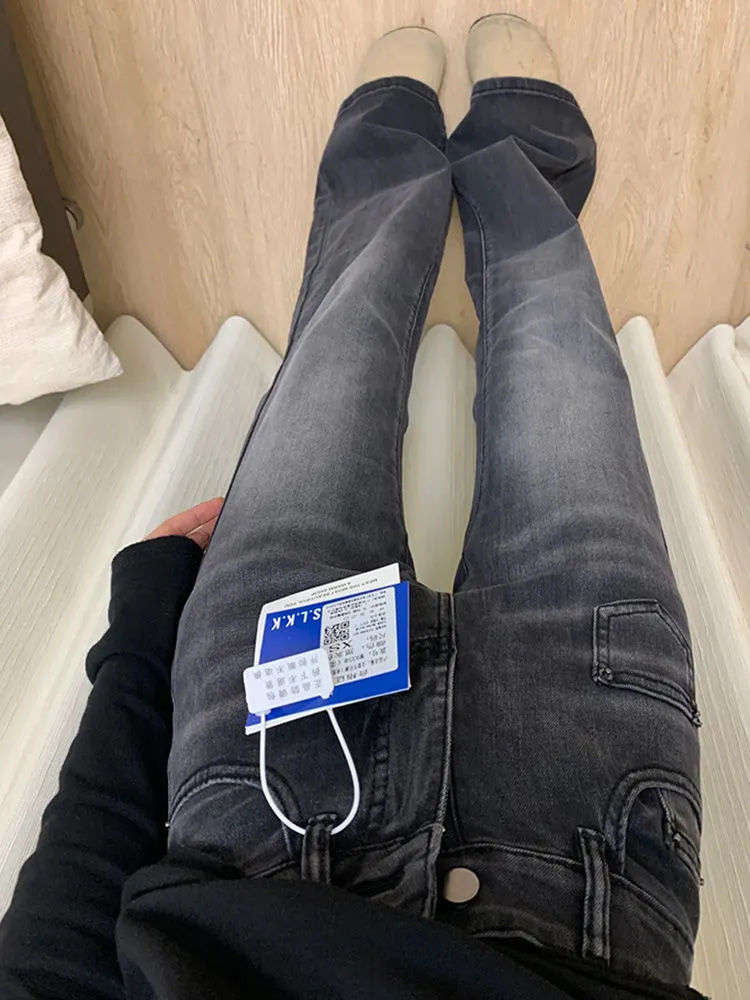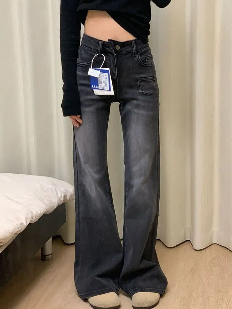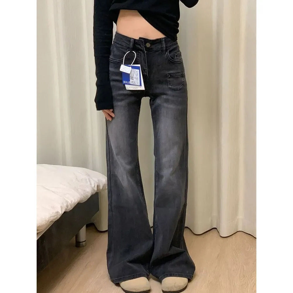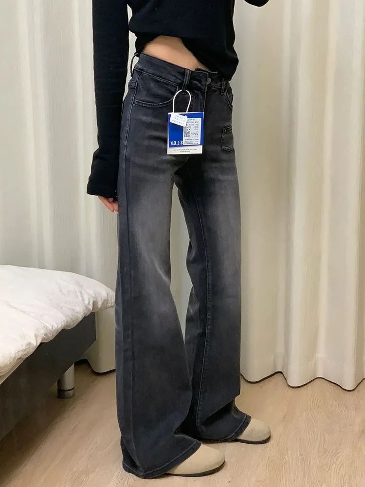 블랙 그레이 플라 드 청바지 아메리칸 스타일 레트로 하이 허리 뉴 와이드 레그 슬리밍 루즈 스트레이트 걸레 바지스토어 가기