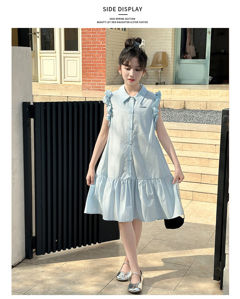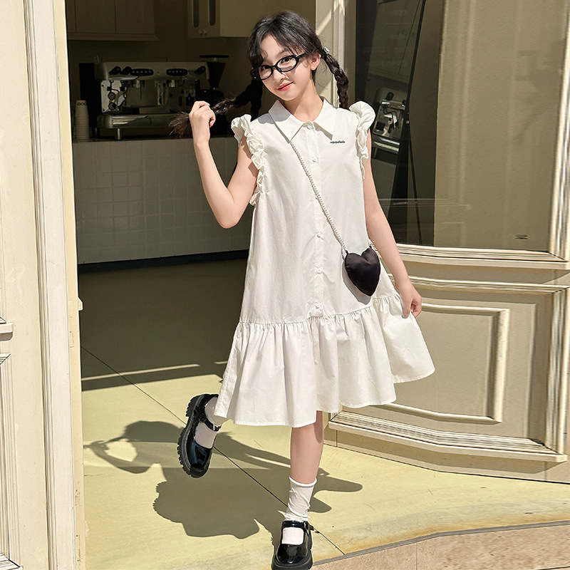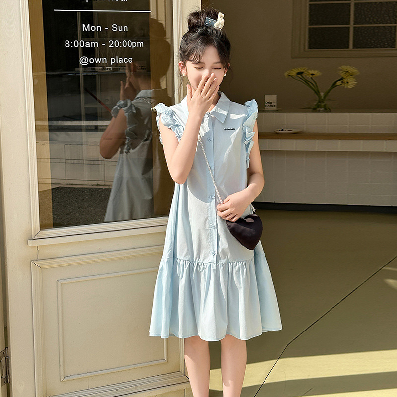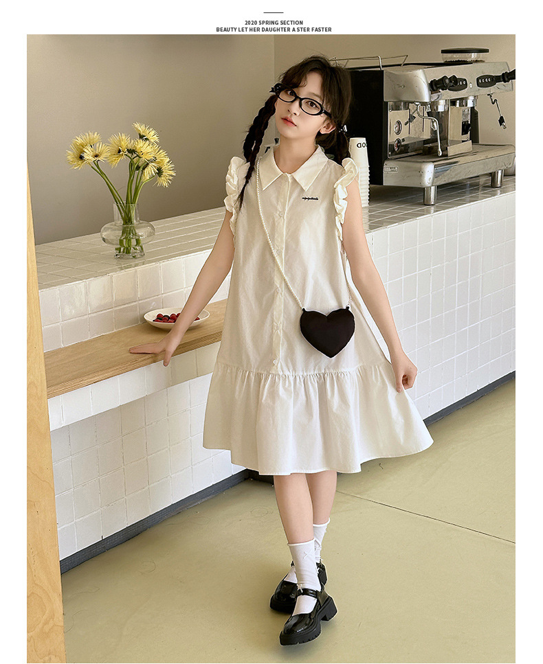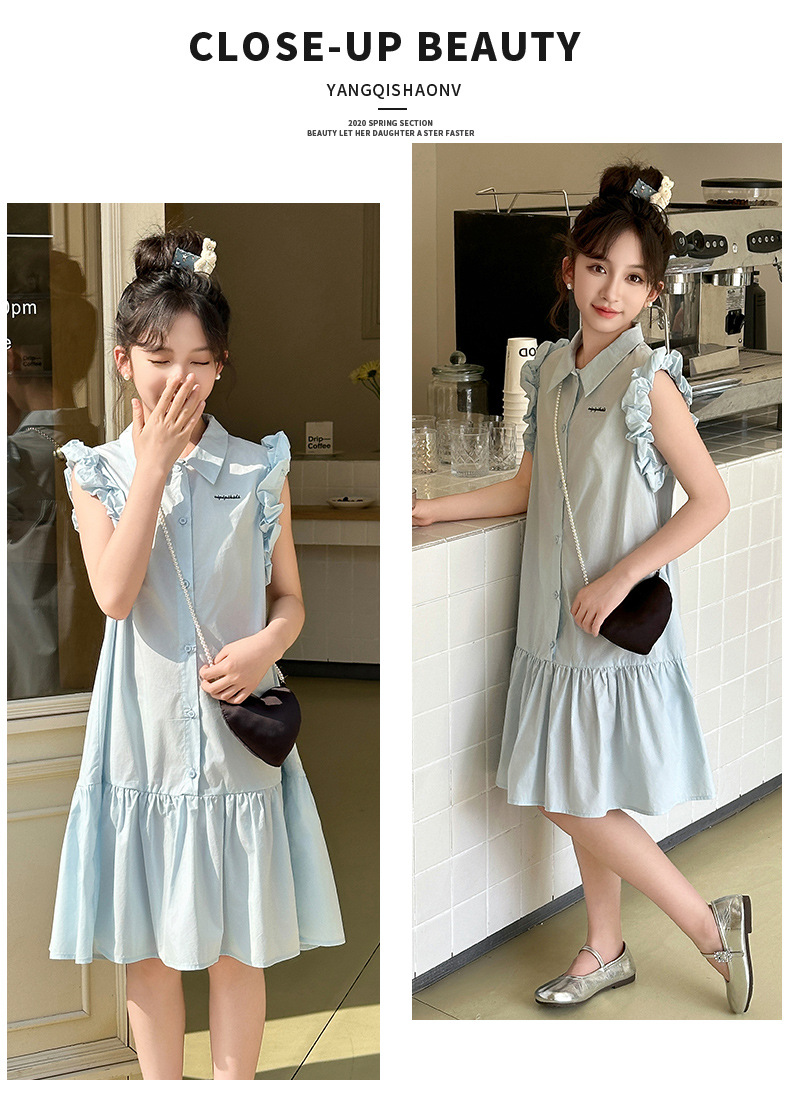 소녀의 큰 소년의 플라잉 슬리브 원피스 2025 여름 새 소녀의 세련된 유행 대학 스타일 셔츠 원피스 공주 원피스 트렌디스토어 가기