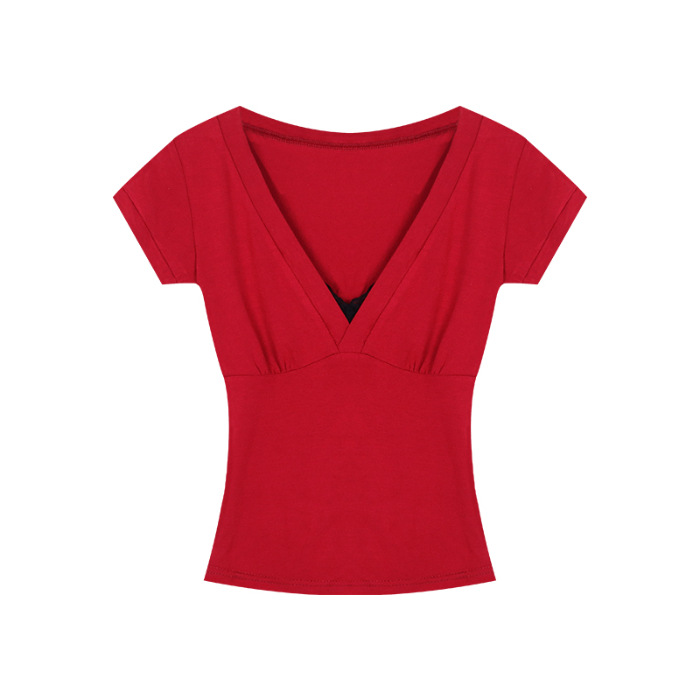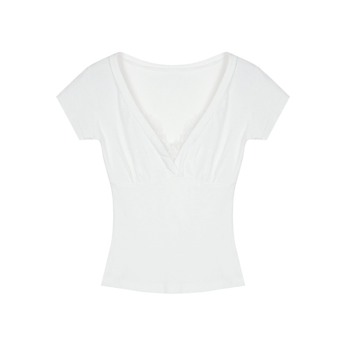 국경 여름 섹시한 레이스 스티칭 v-neck 짧은 소매 티셔츠 여성 핫 걸 슬림 슬림 짧은 코트