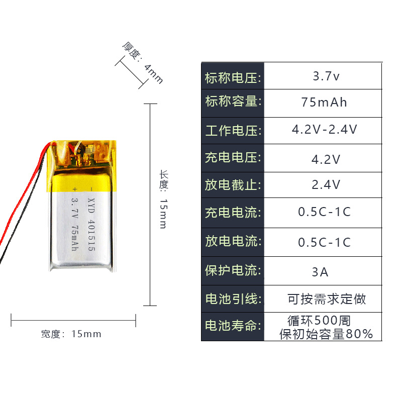 • 401515-75mAh 배터리 셀 및 보호 보드 콘센트