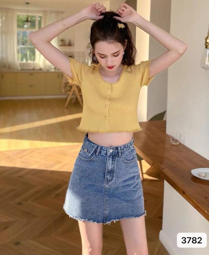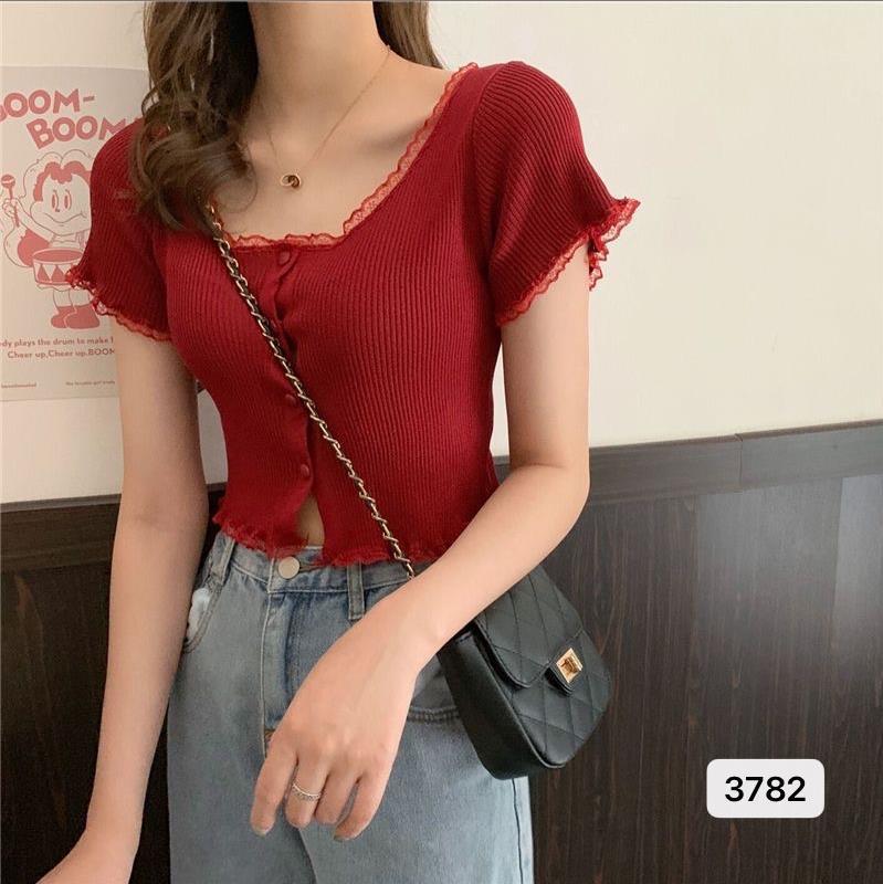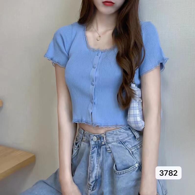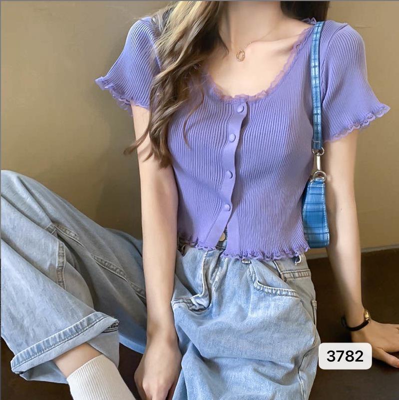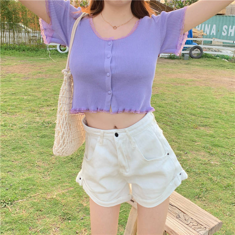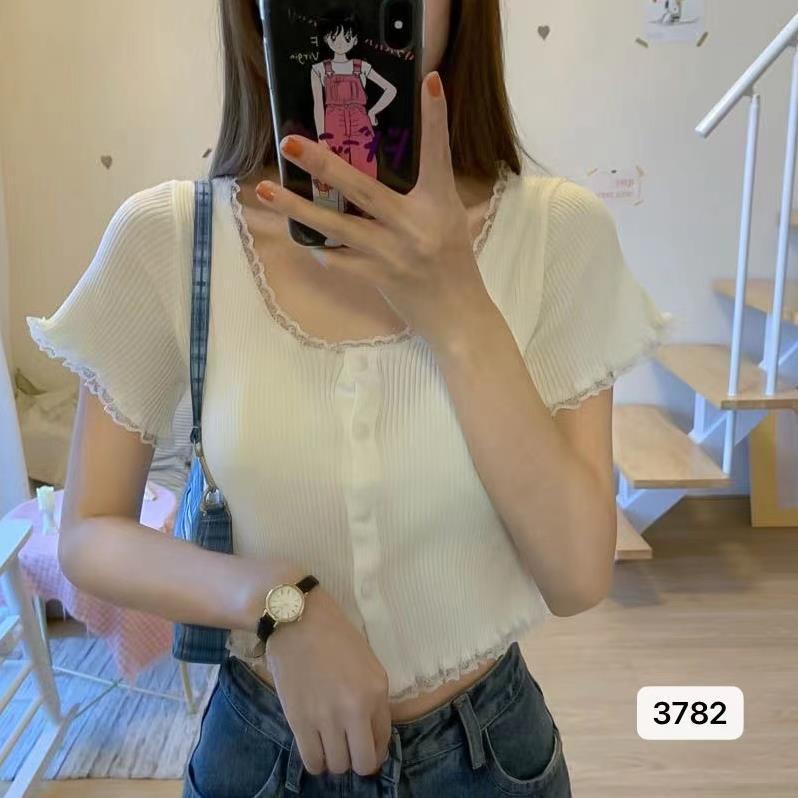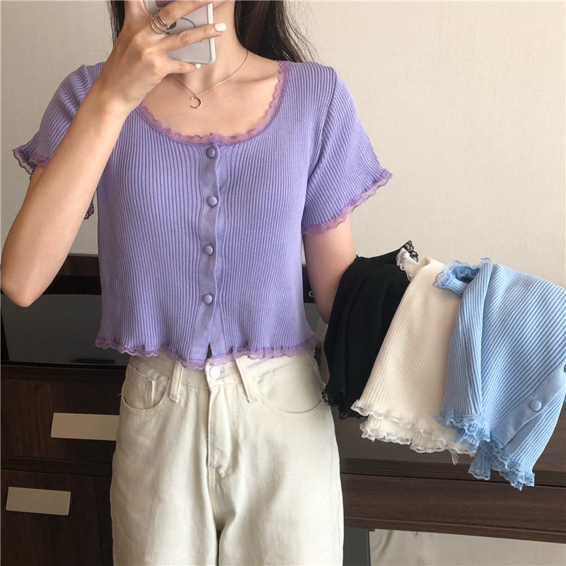 2023 년 여름 새로운 스위트 레이스 스티칭 슬림 핏 슬리밍 쇼트 U 칼라 얇은 반팔 스웨터 탑
