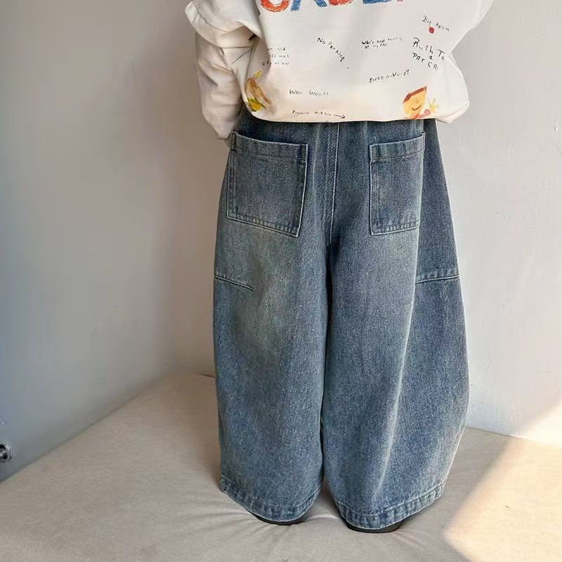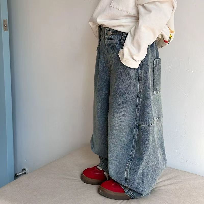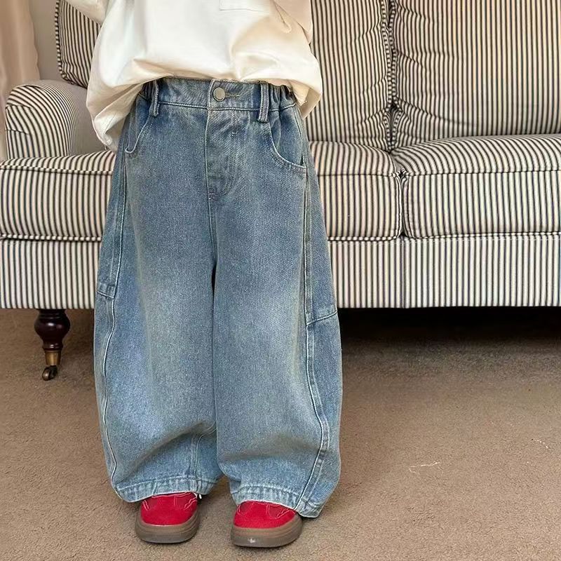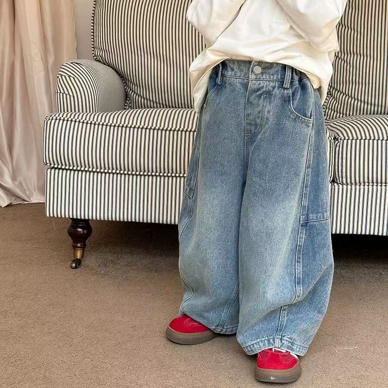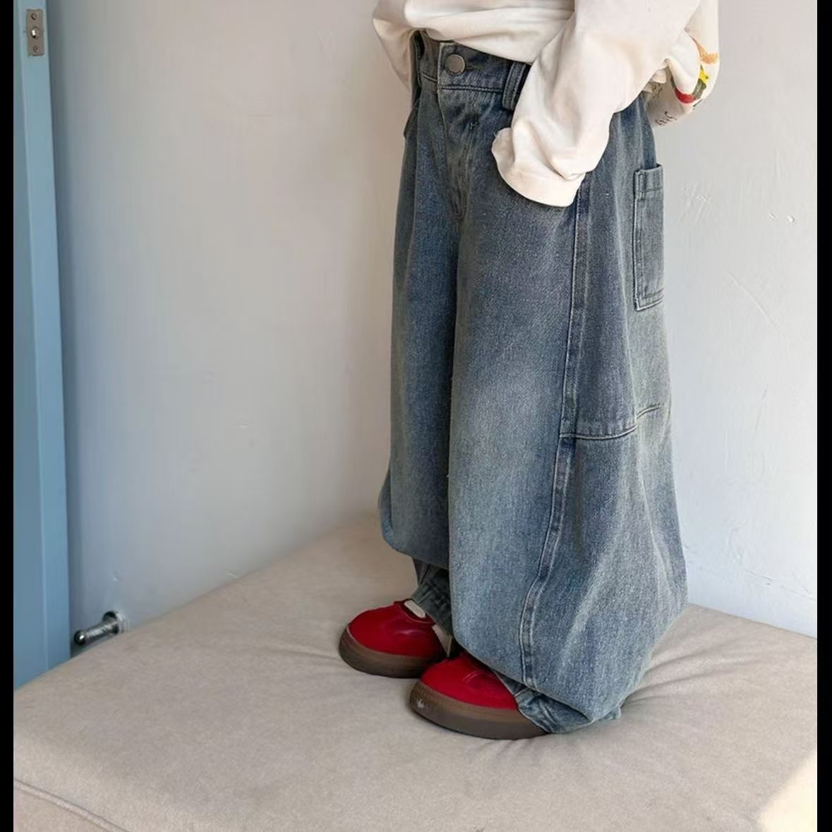 한국 스타일 봄 넓은 다리 청바지 아동복 한국 스타일 서양식 느슨한 캐주얼 바느질 청바지 소년 소녀스토어 가기