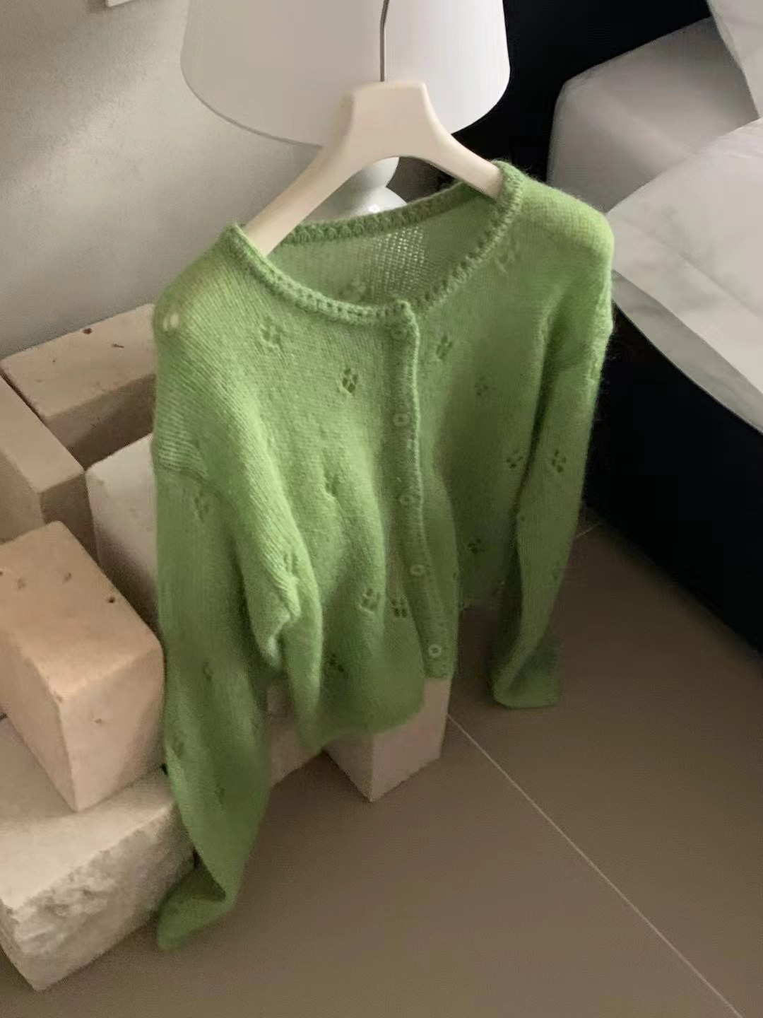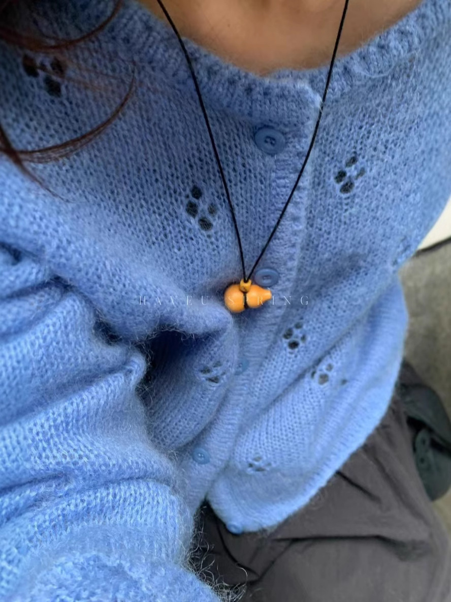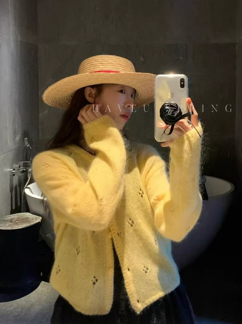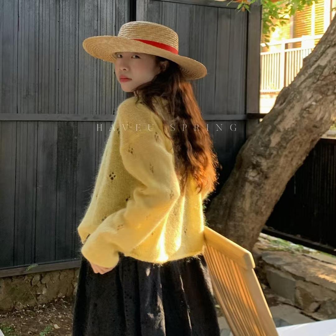 한국식 모헤어 라운드 넥 할로우 니트 카디건 여성의 봄 새로운 디자인 센스 아우터 쇼트 코트 얇은 탑스토어 가기