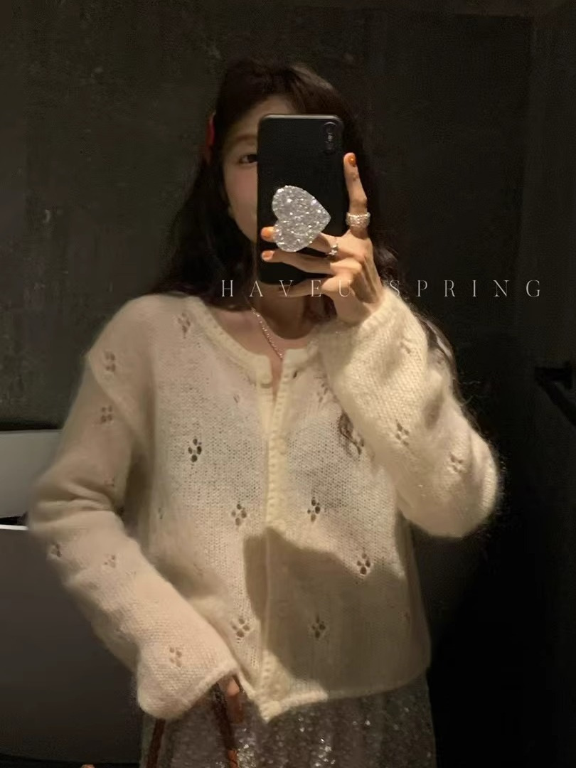 한국식 모헤어 라운드 넥 할로우 니트 카디건 여성의 봄 새로운 디자인 센스 아우터 쇼트 코트 얇은 탑