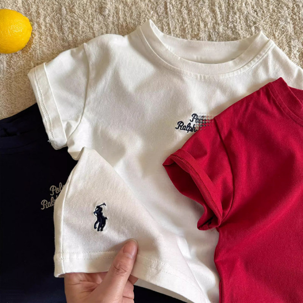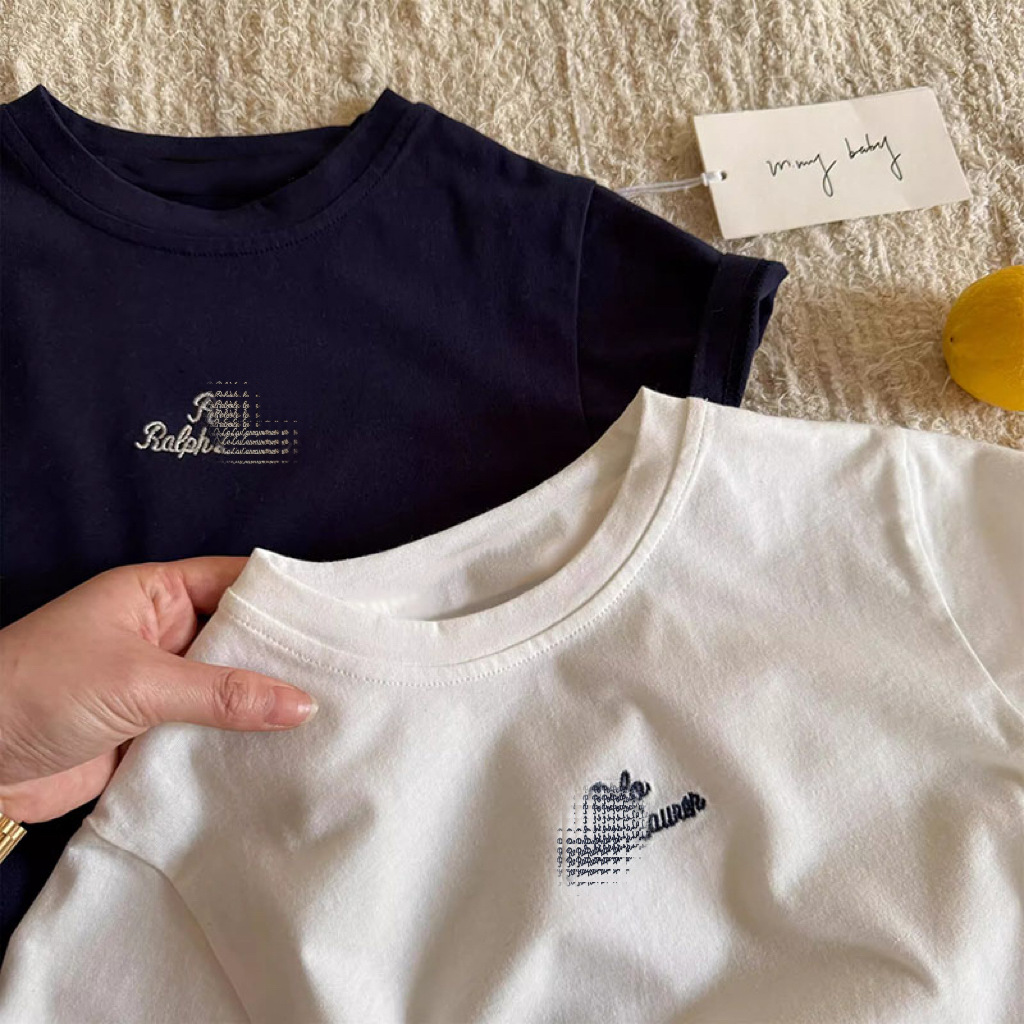 순수 코튼 어린이 반팔 티셔츠 여름 2025 새로운 다목적 패션 트렌디 브랜드 자수 캐주얼 탑 소년과 소녀