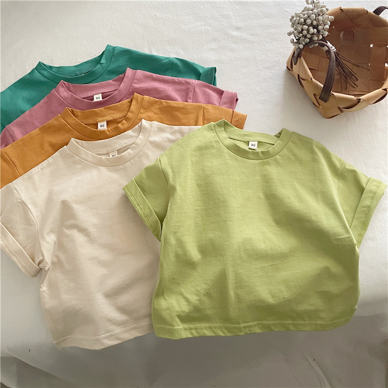 새로운 여름 한국 스타일 어린이 캔디 컬러 솔리드 컬러 코튼 티셔츠 남학생과 여자를위한 반팔 느슨한 어깨 탑