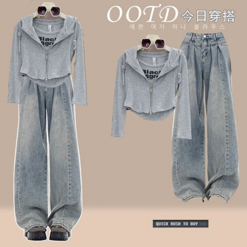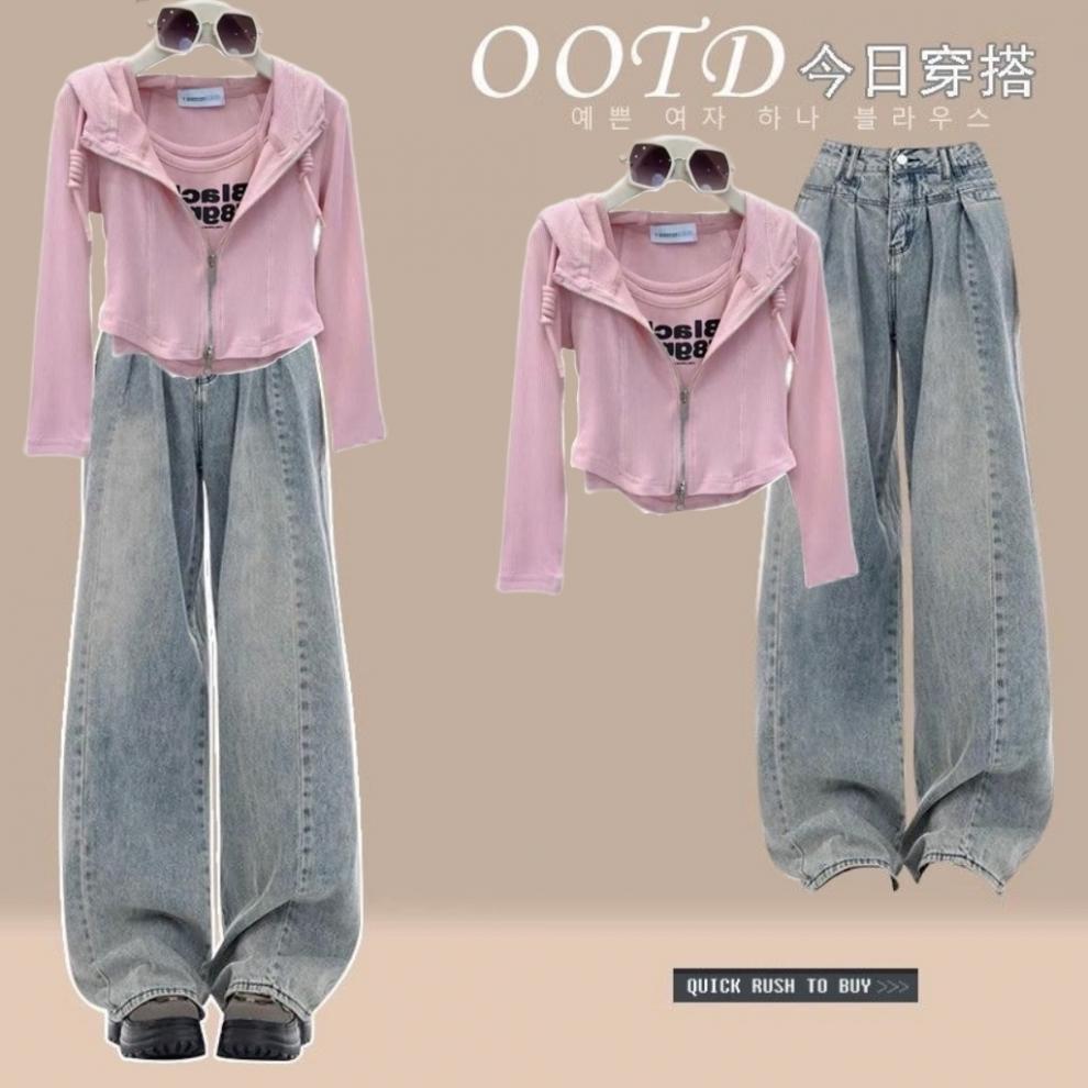 [6760 인민 컬렉션] 소녀의 봄과 가을 3 조각 세트 큰 아이들의 새로운 육체 덮음 슬림 느슨한 청바지
