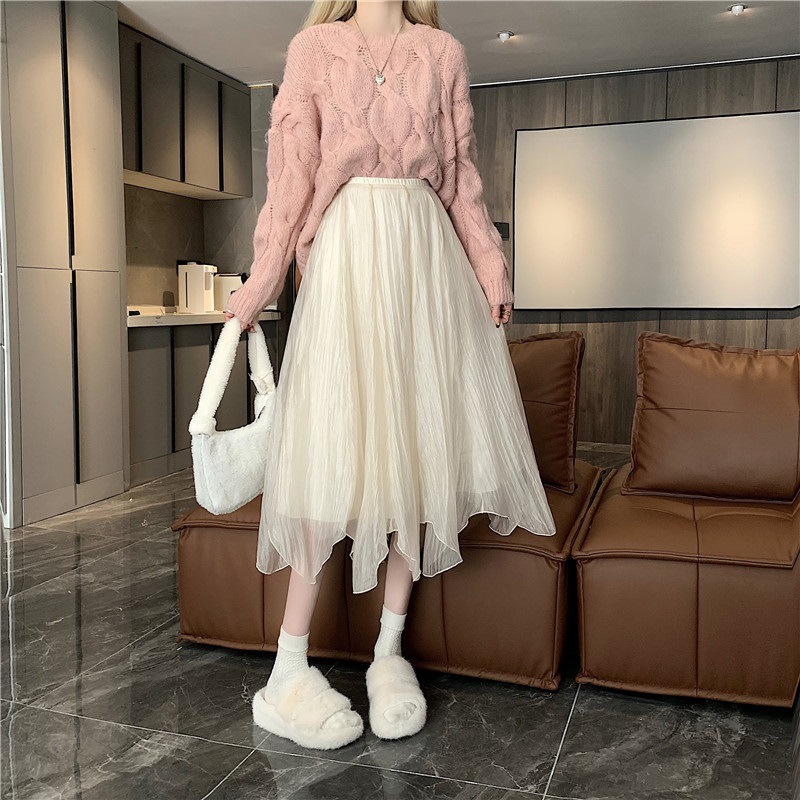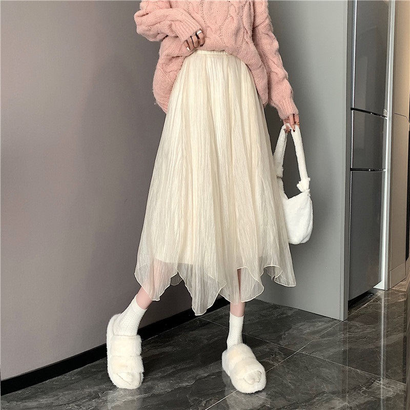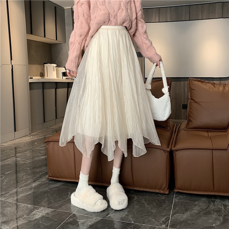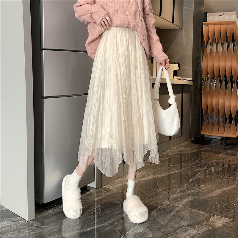 오간자 불규칙한 치마 여성의 봄과 여름 작은 높은 허리 A 라인 스커트 서양식 주름 중간 길이 스커트