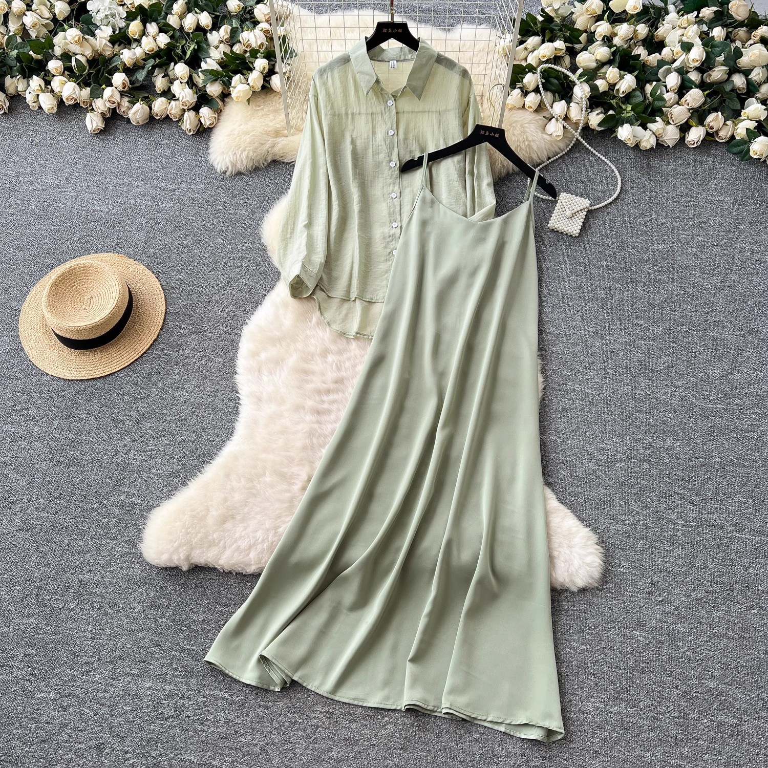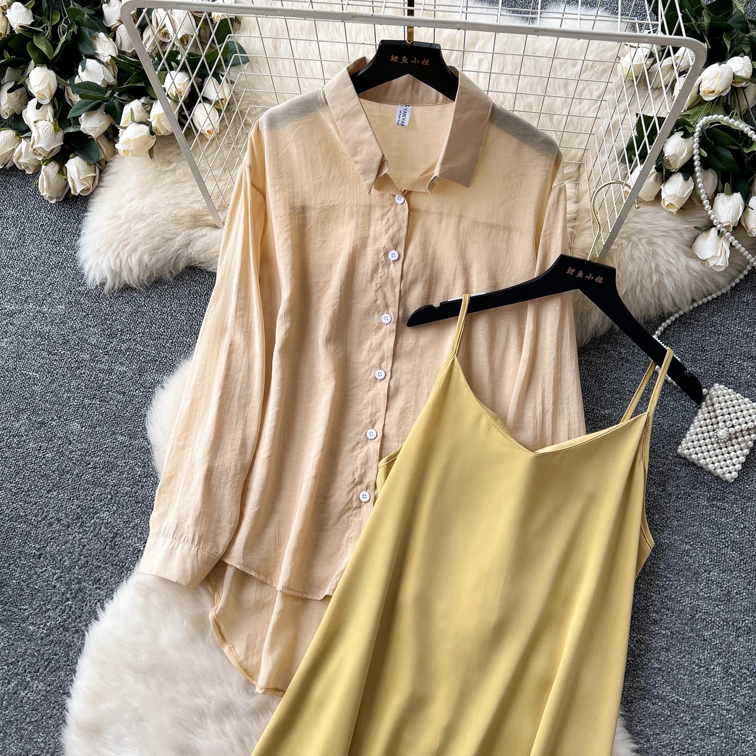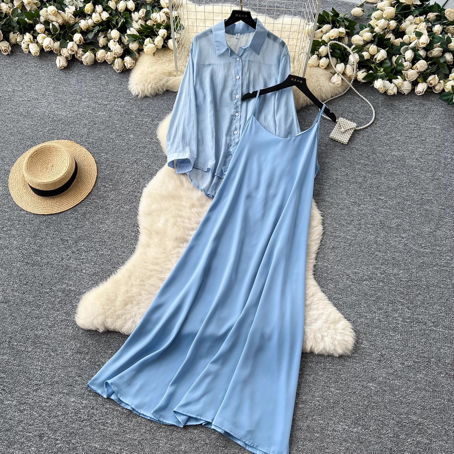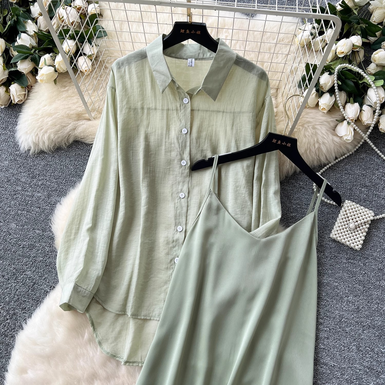 우아한 투피스 세트 여성용 틈새 게으른 스타일 아우터 원피스 스트랩이 달린 얇은 느슨한 긴팔 태양 보호 셔츠 재킷