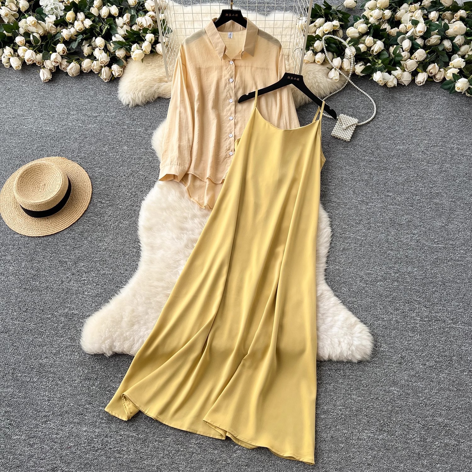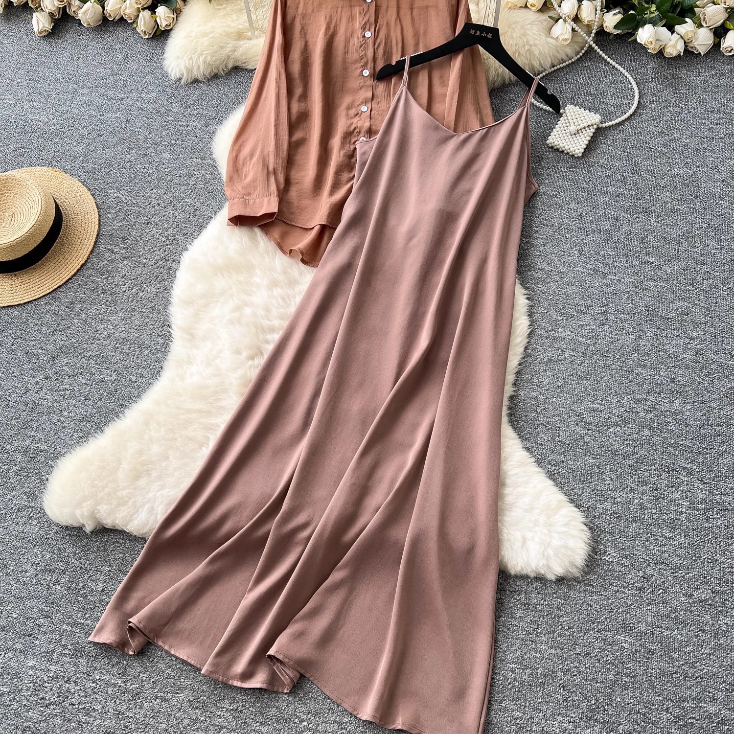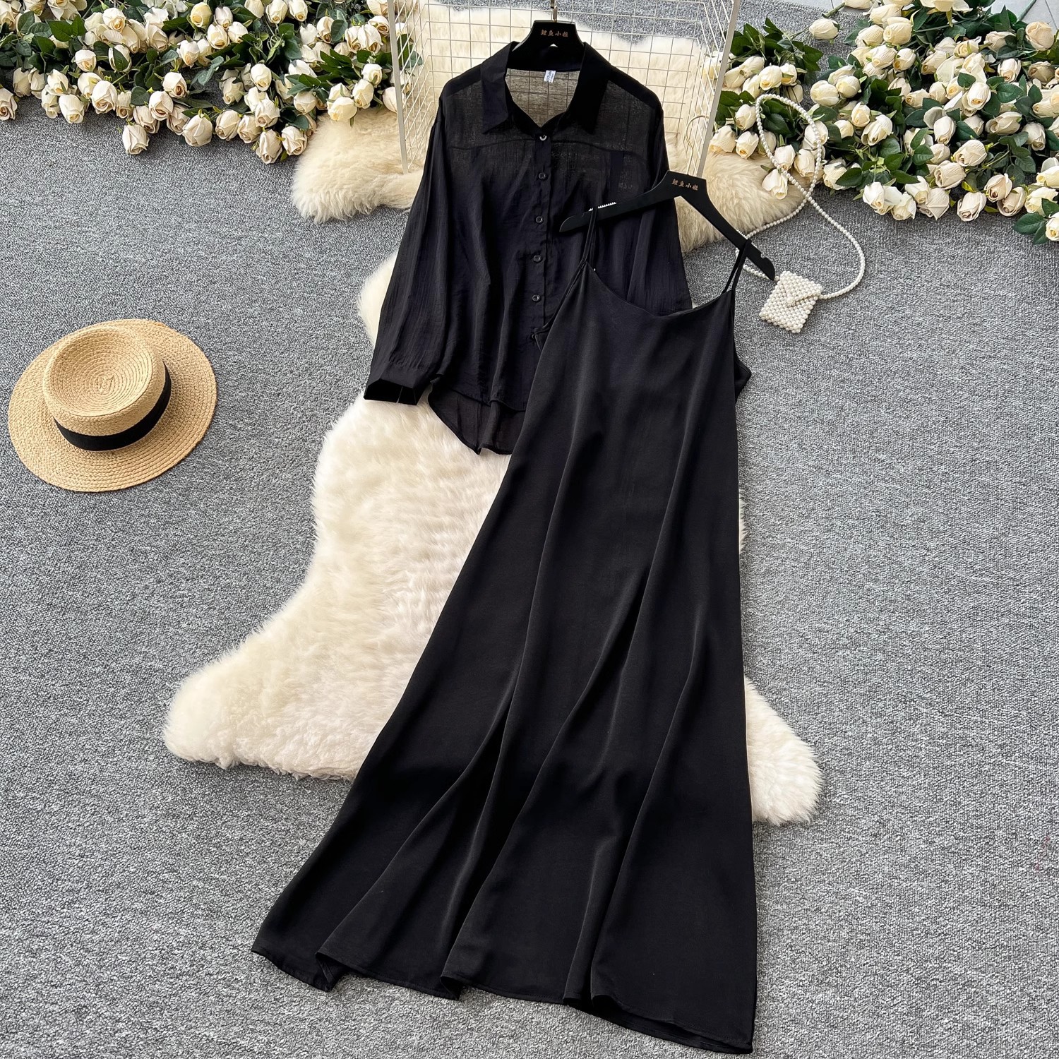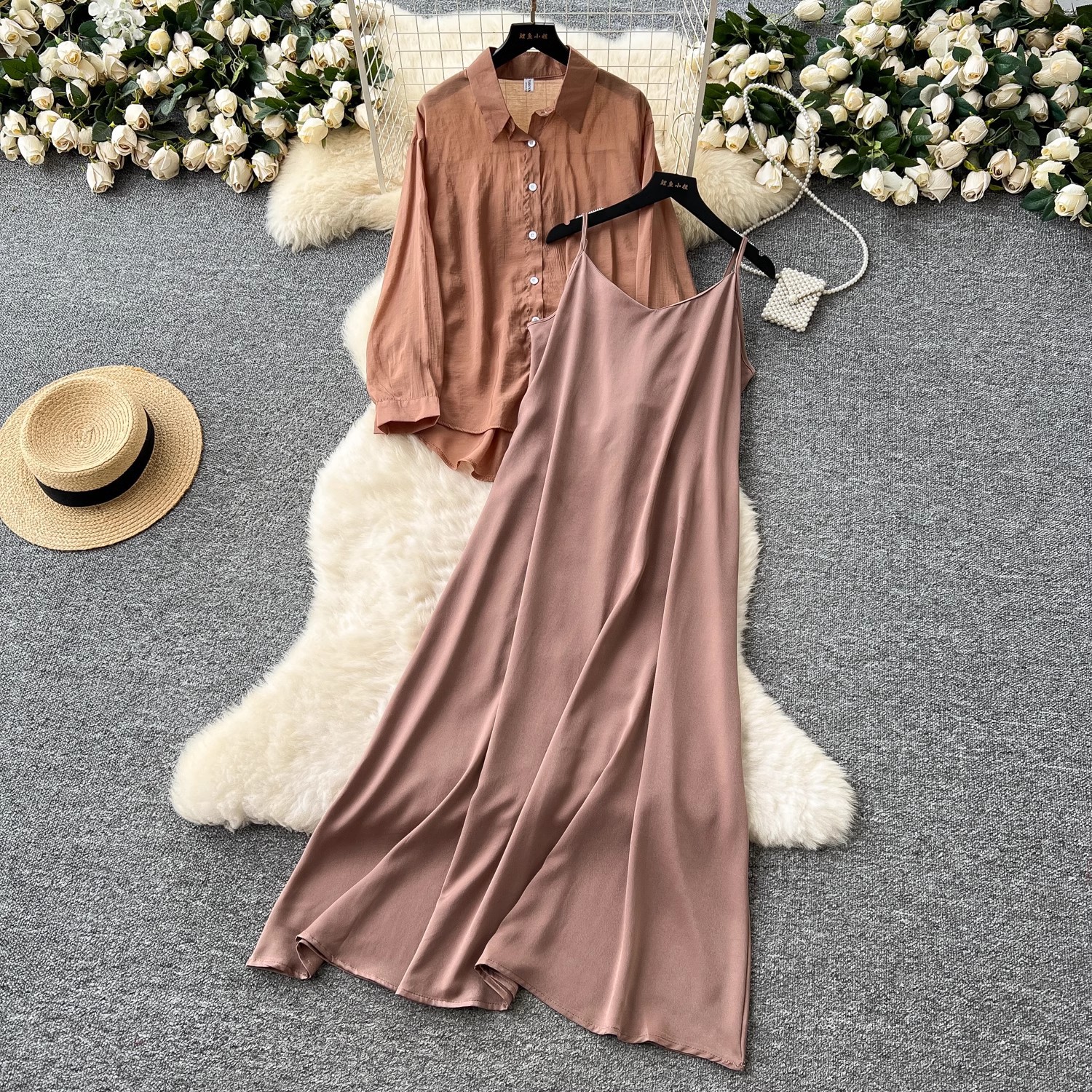 우아한 투피스 세트 여성용 틈새 게으른 스타일 아우터 원피스 스트랩이 달린 얇은 느슨한 긴팔 태양 보호 셔츠 재킷