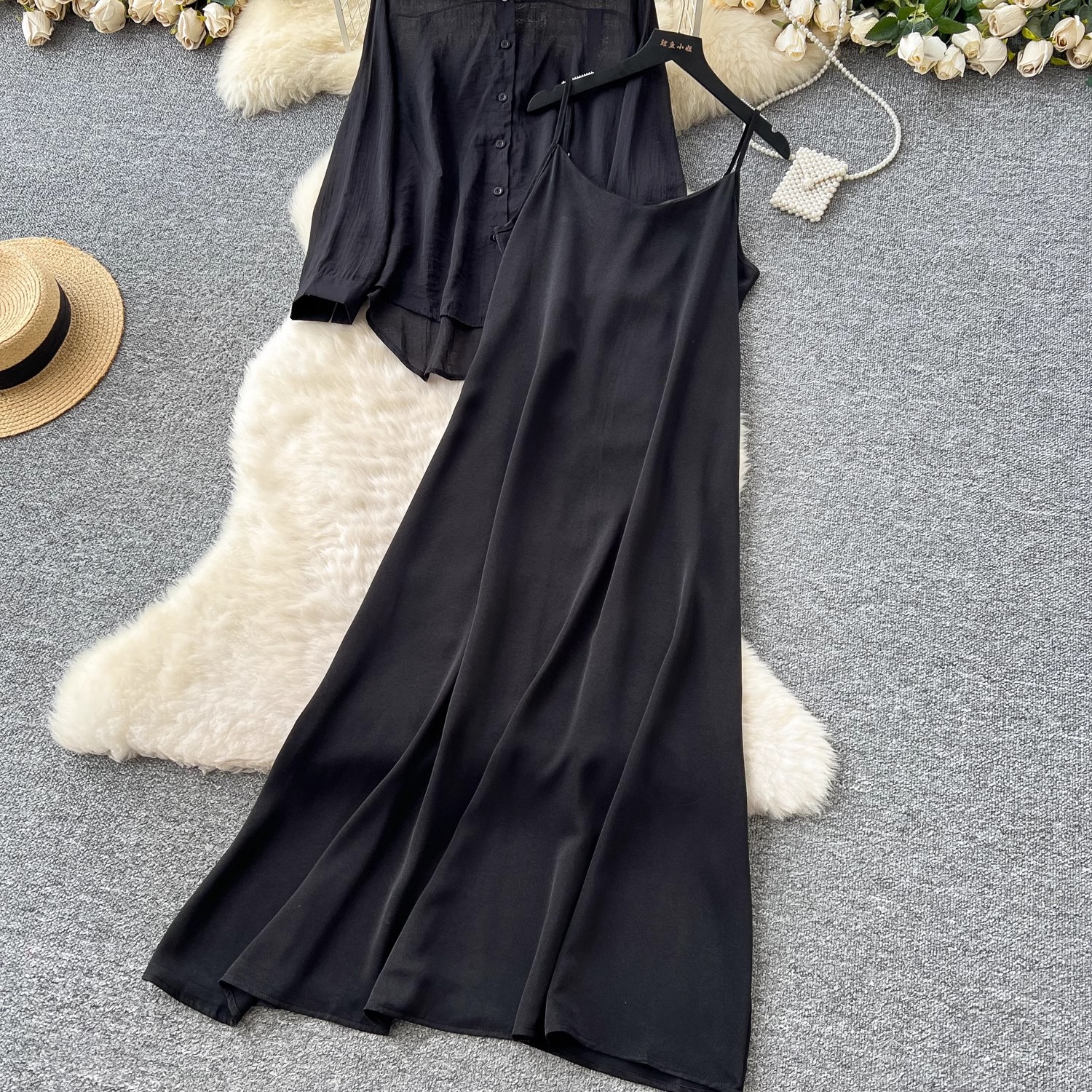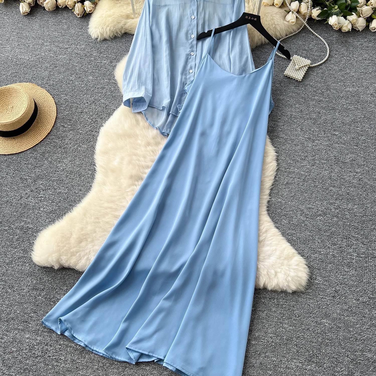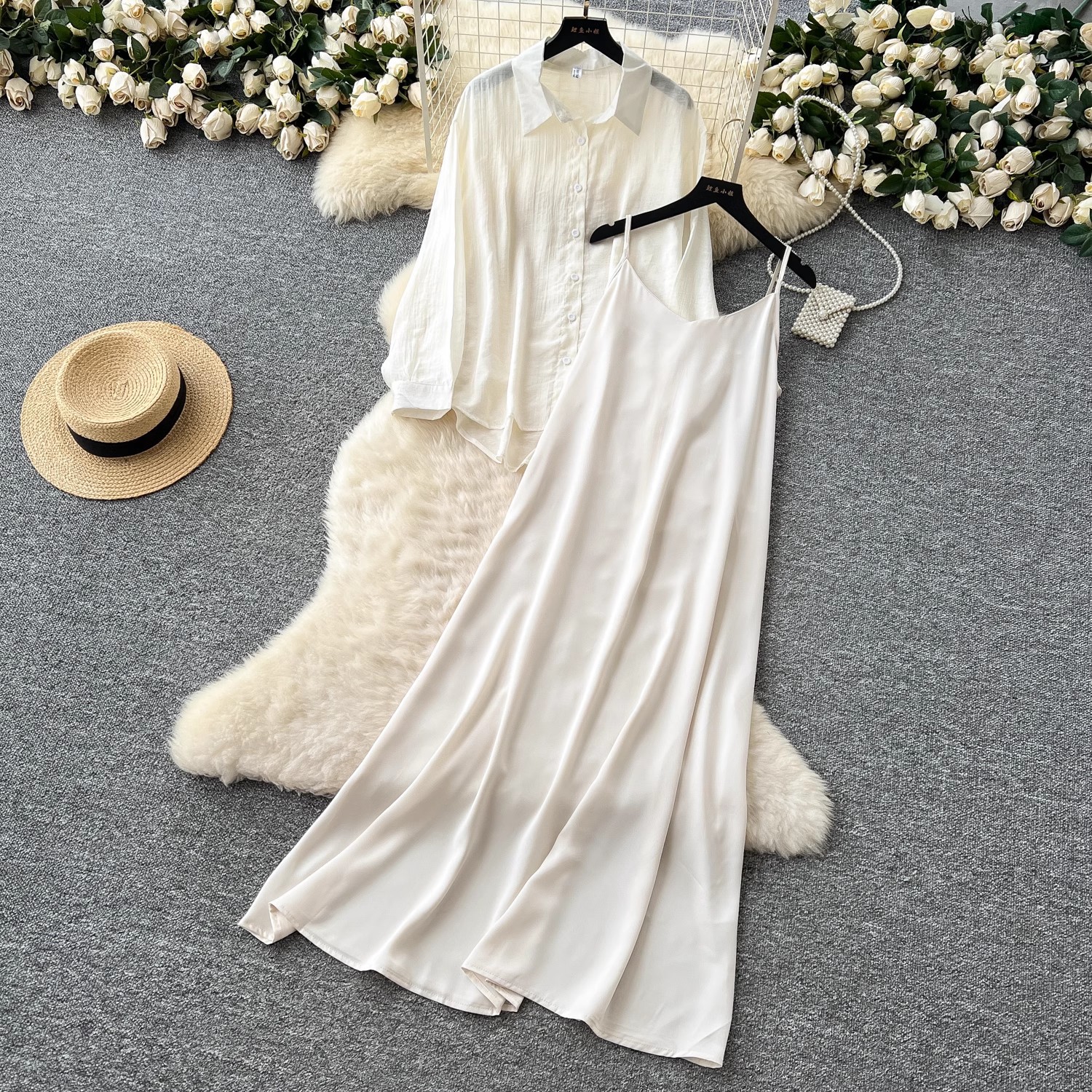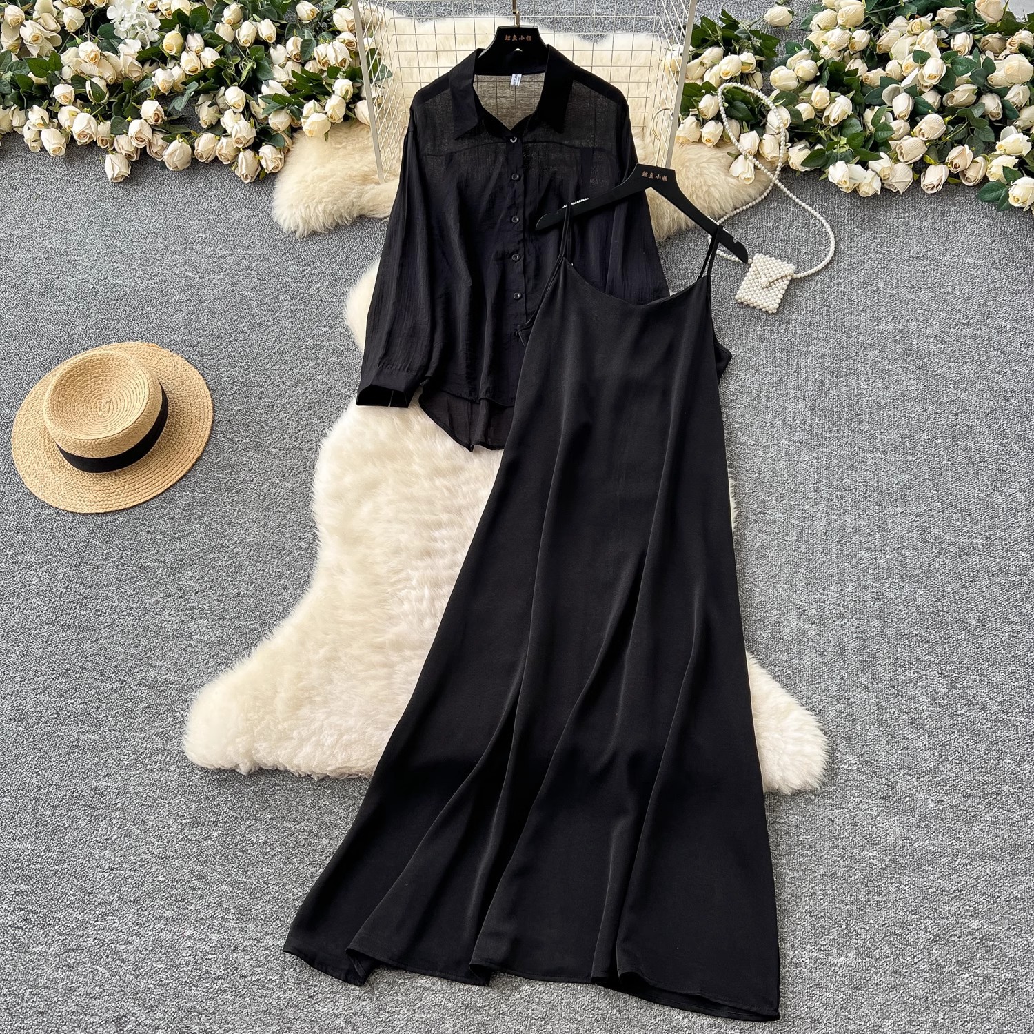 우아한 투피스 세트 여성용 틈새 게으른 스타일 아우터 원피스 스트랩이 달린 얇은 느슨한 긴팔 태양 보호 셔츠 재킷