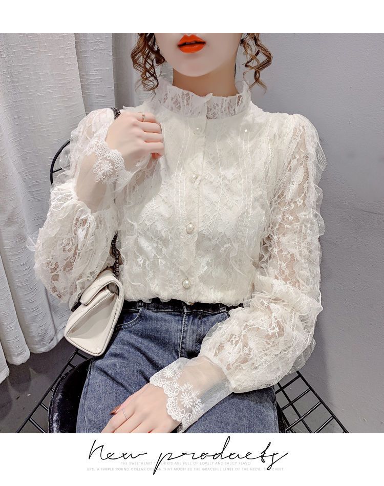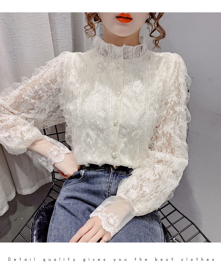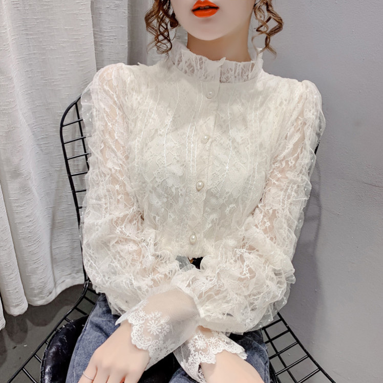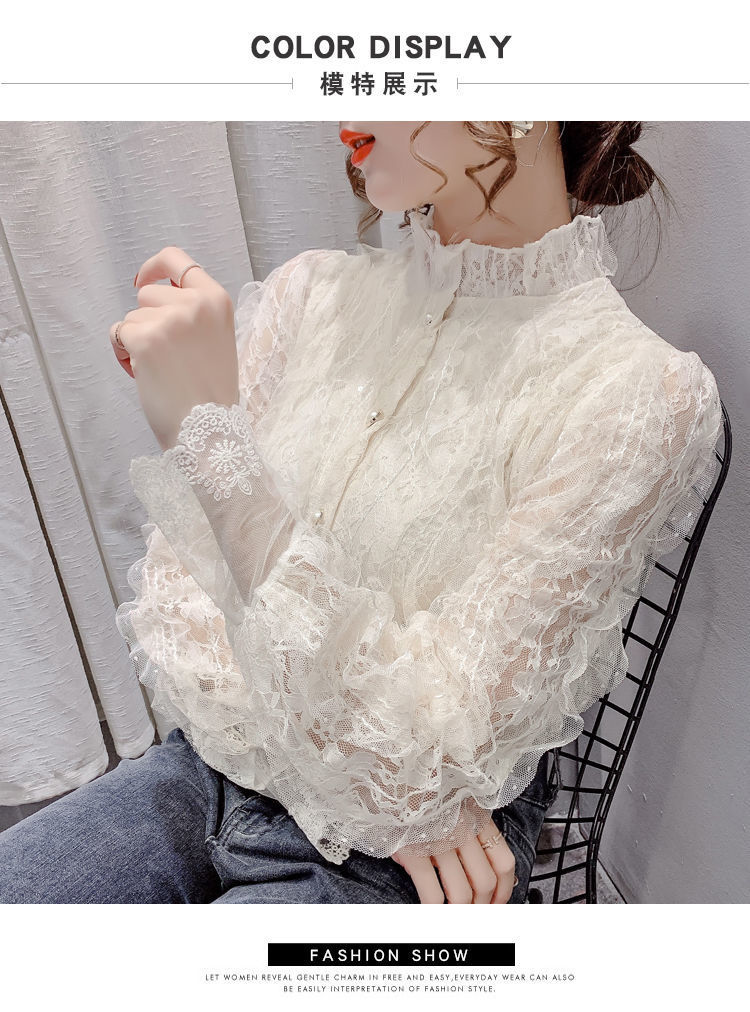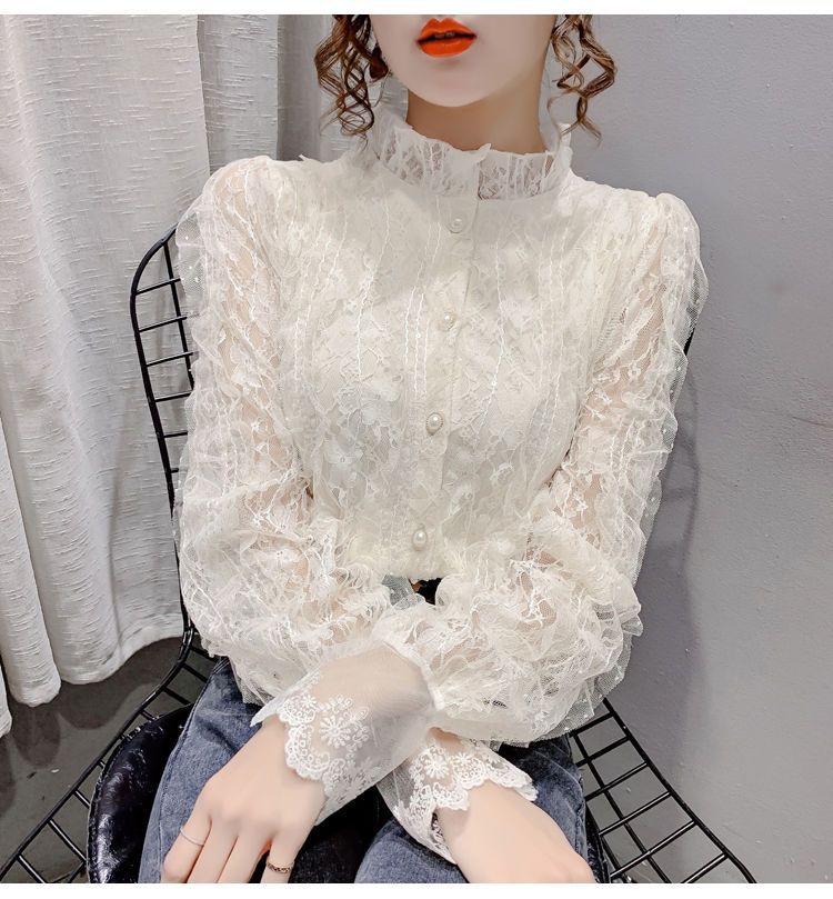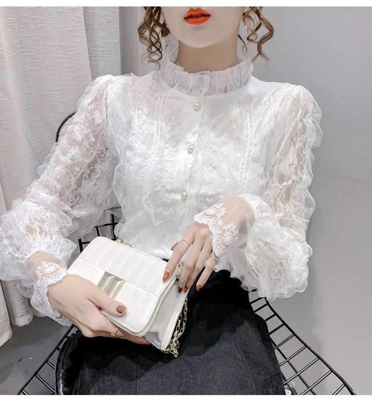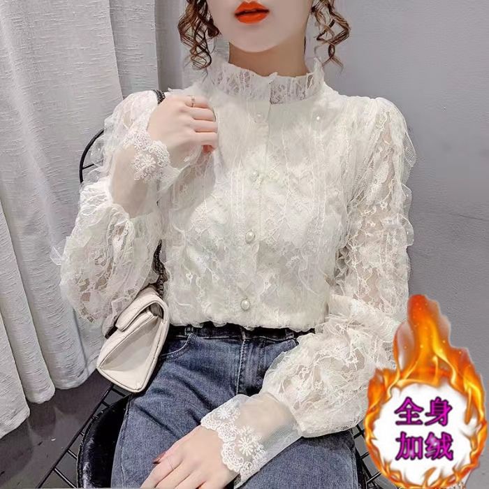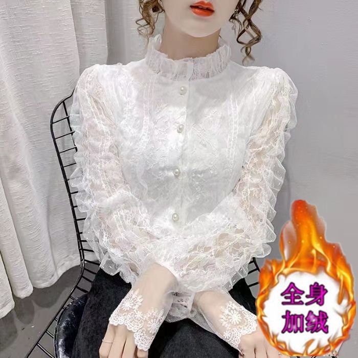 레이스베이스 셔츠 여성용 봄과 가을 새로운 도착 기모 웨스턴 스타일 레이스 카디건 프렌치 스타일 칼라 롱 슬리브 탑