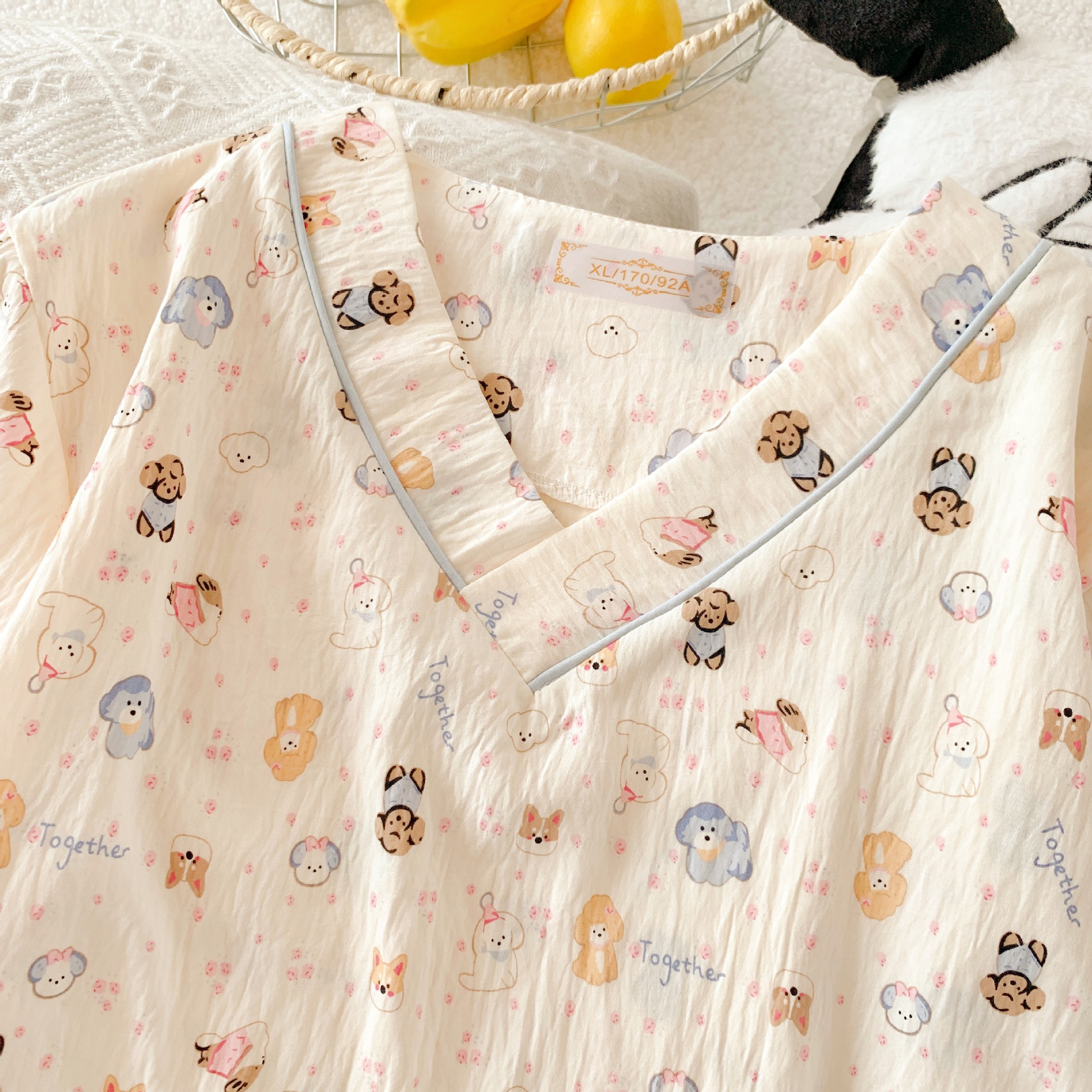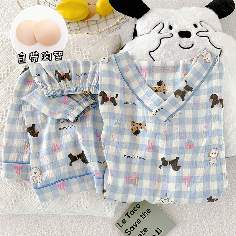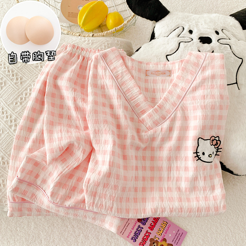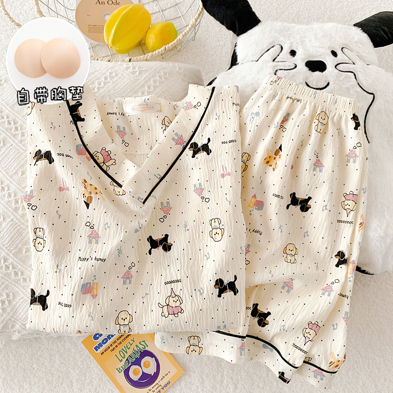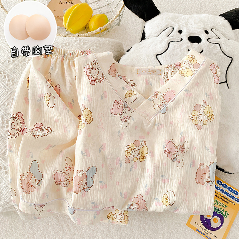 부드러운 왁스 구름 면 잠옷 여성 봄과 여름 일본 스타일 만화 짧은 소매 반바지 가슴 패드 겉옷 달콤한 홈 옷스토어 가기