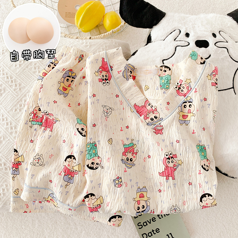 부드러운 왁스 구름 면 잠옷 여성 봄과 여름 일본 스타일 만화 짧은 소매 반바지 가슴 패드 겉옷 달콤한 홈 옷