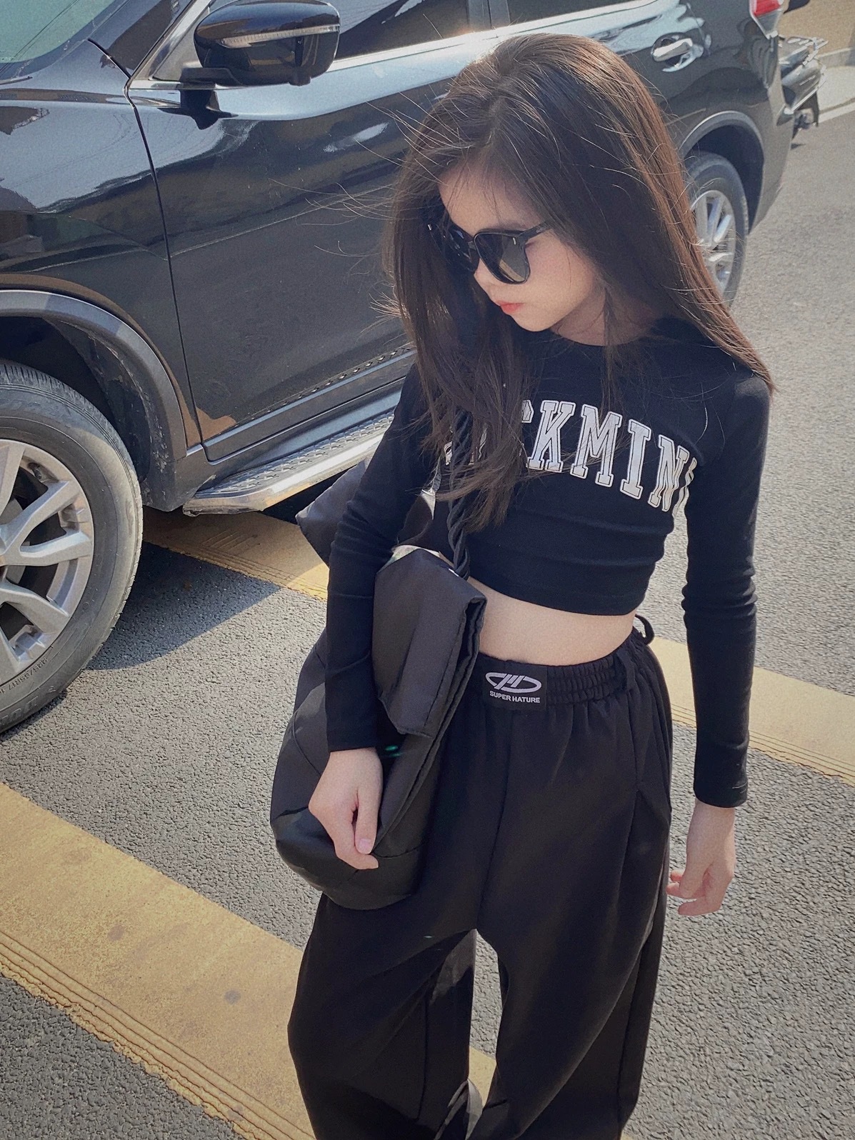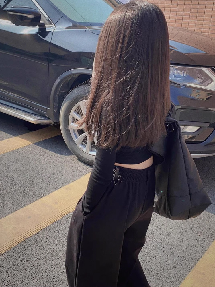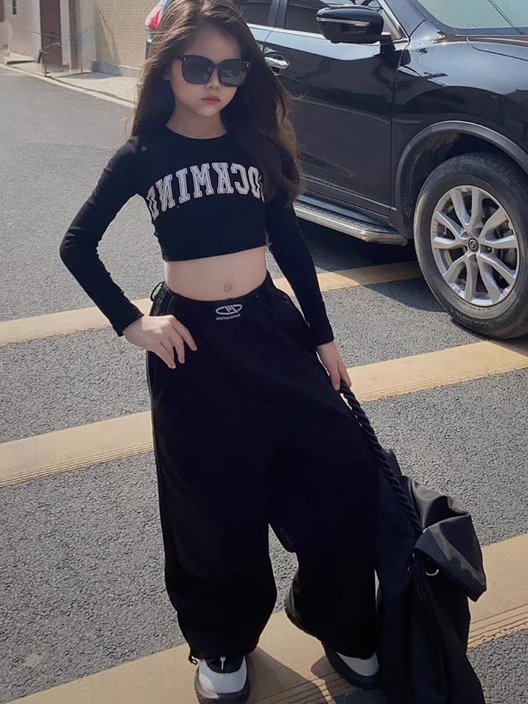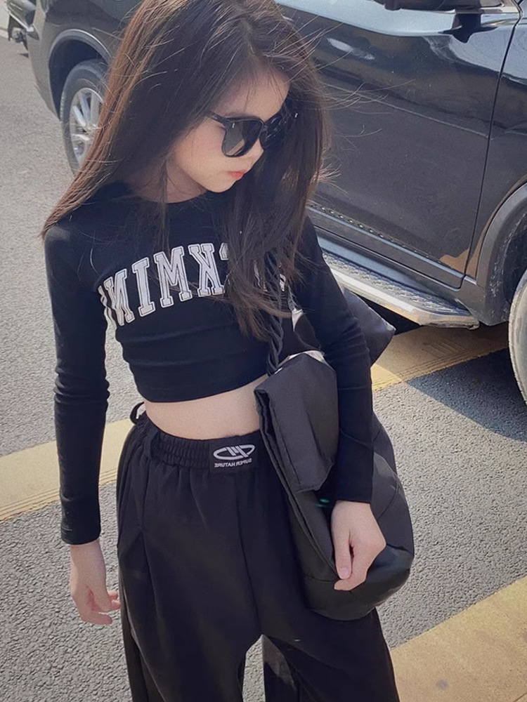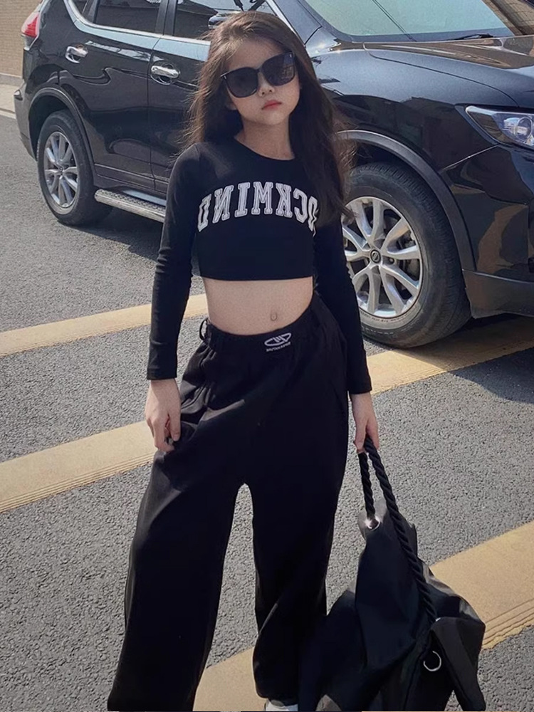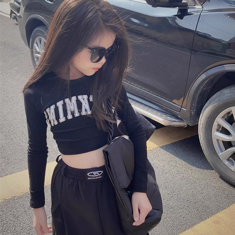 소녀 면 짧은 긴팔 티셔츠 2025 봄과 가을 새로운 어린이 해군 노출 재즈 댄스 베이스 셔츠 탑스토어 가기