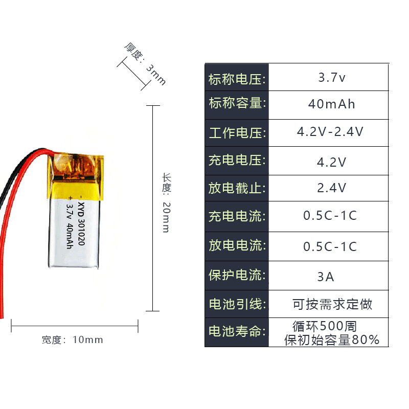 301020 폴리머 리튬 배터리 40mAh 블루투스 헤드셋 LED 보청기 야간 조명 장난감 고온 3.7V스토어 가기